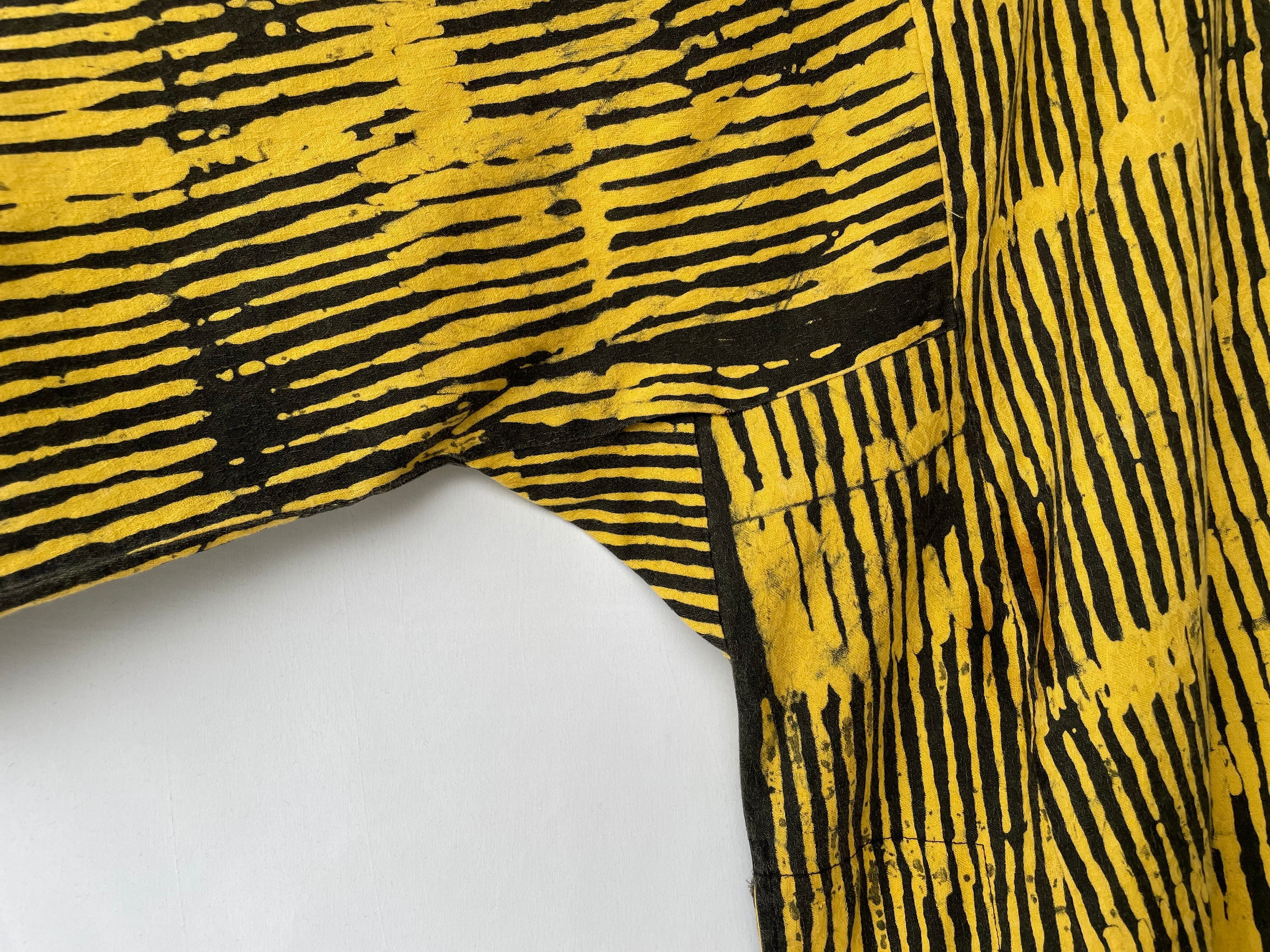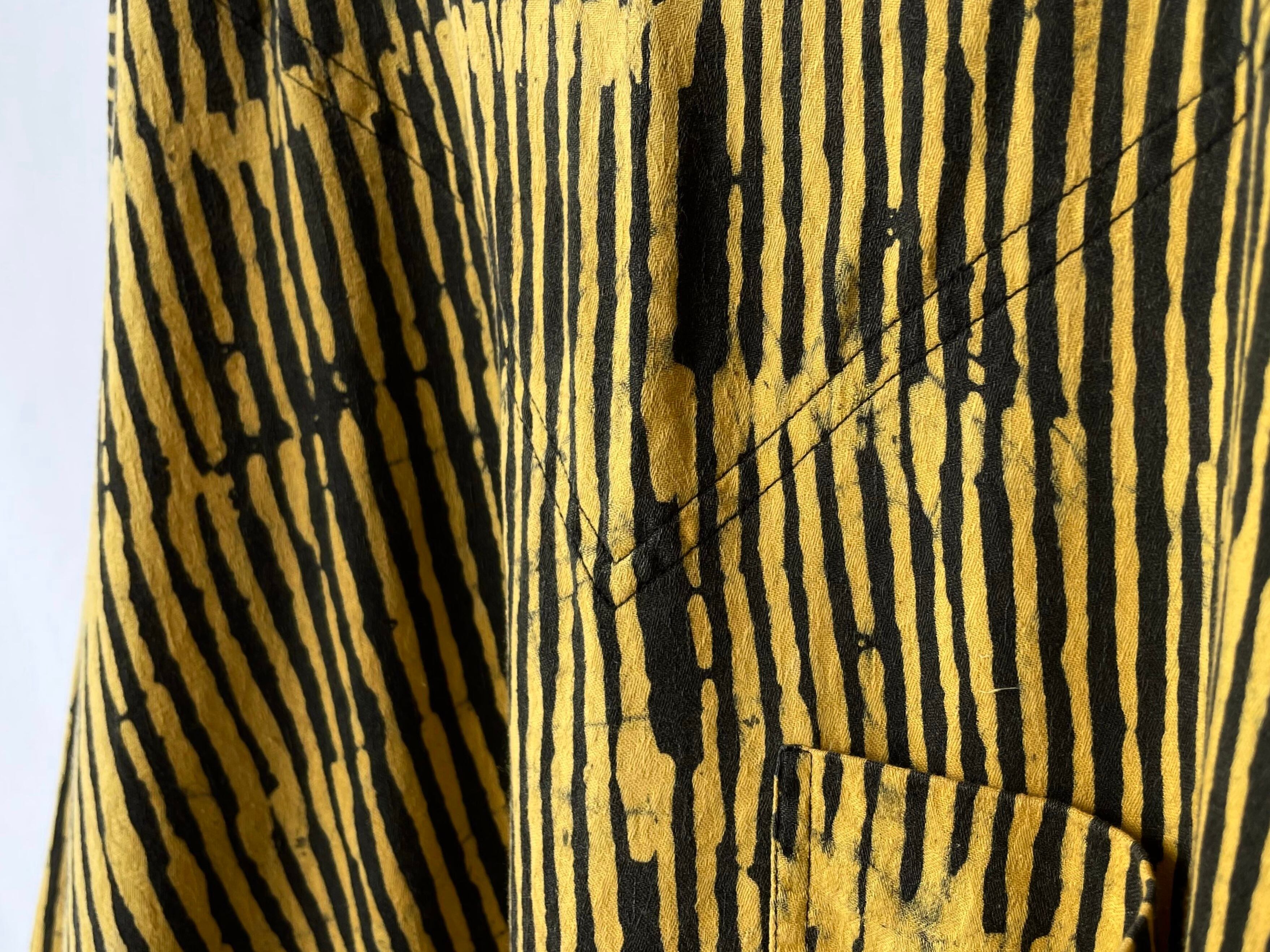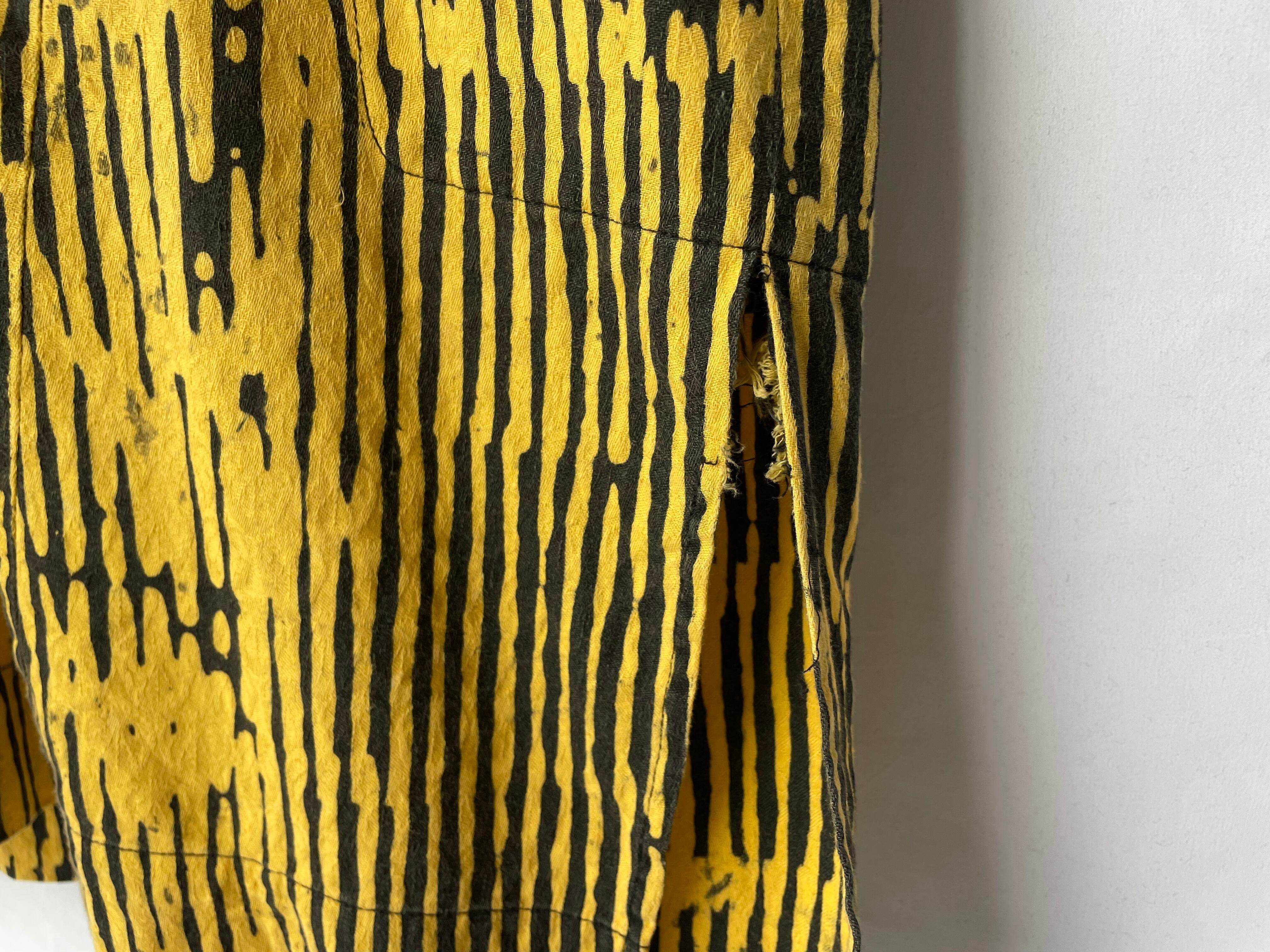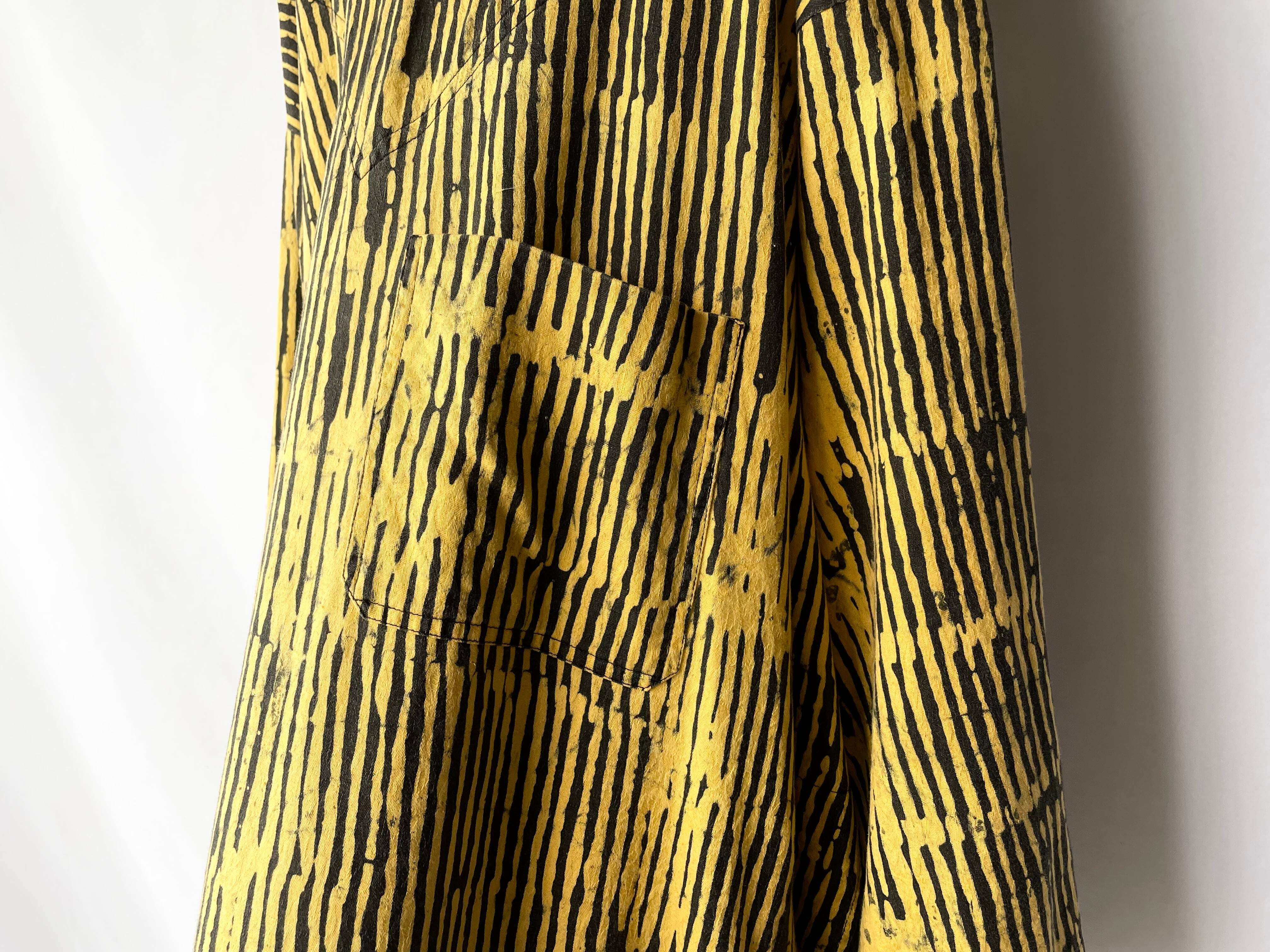 樹木の様な細かな織柄の上に、むらのある黒の染料が乗せられた独自の総柄。