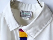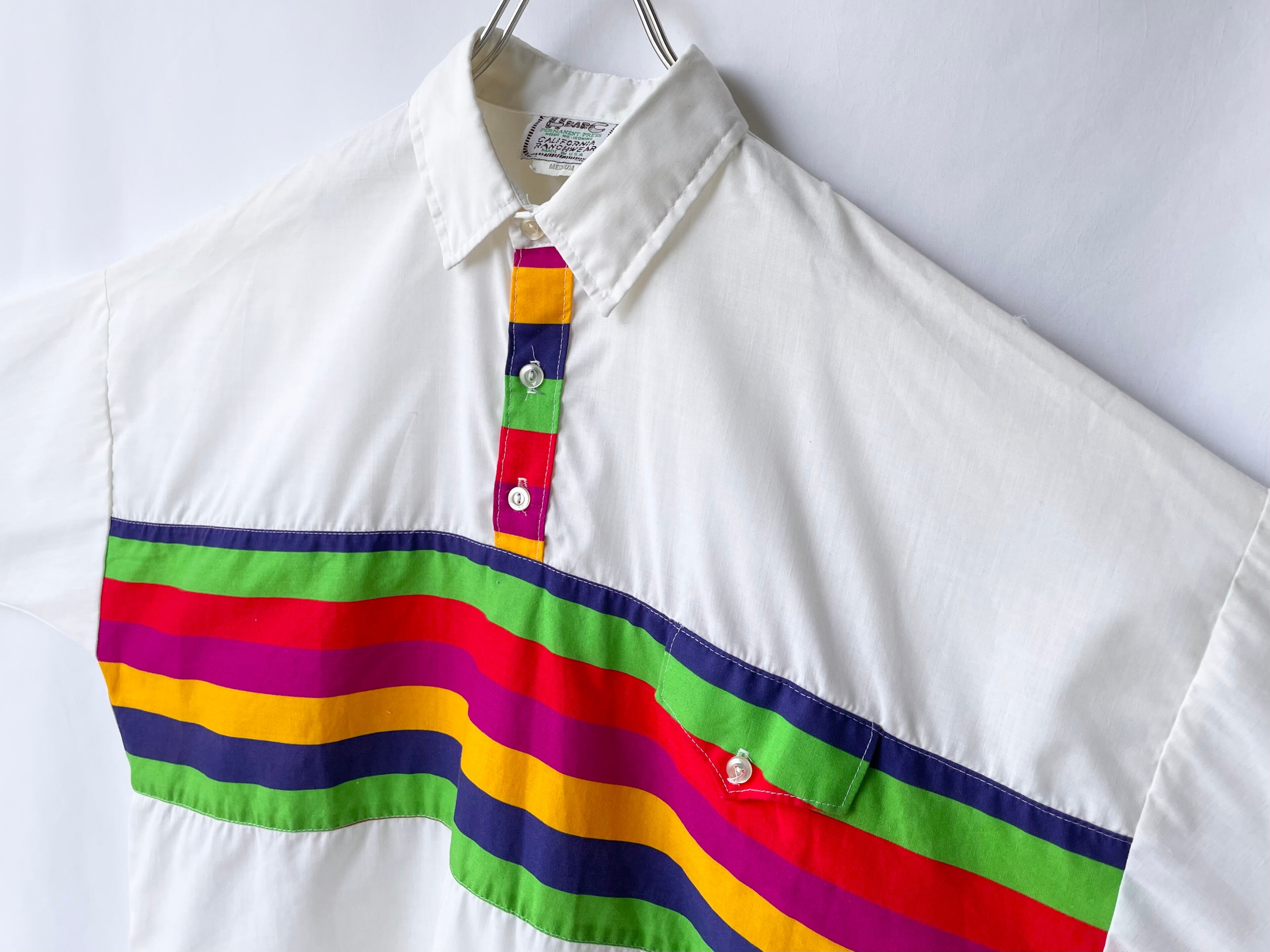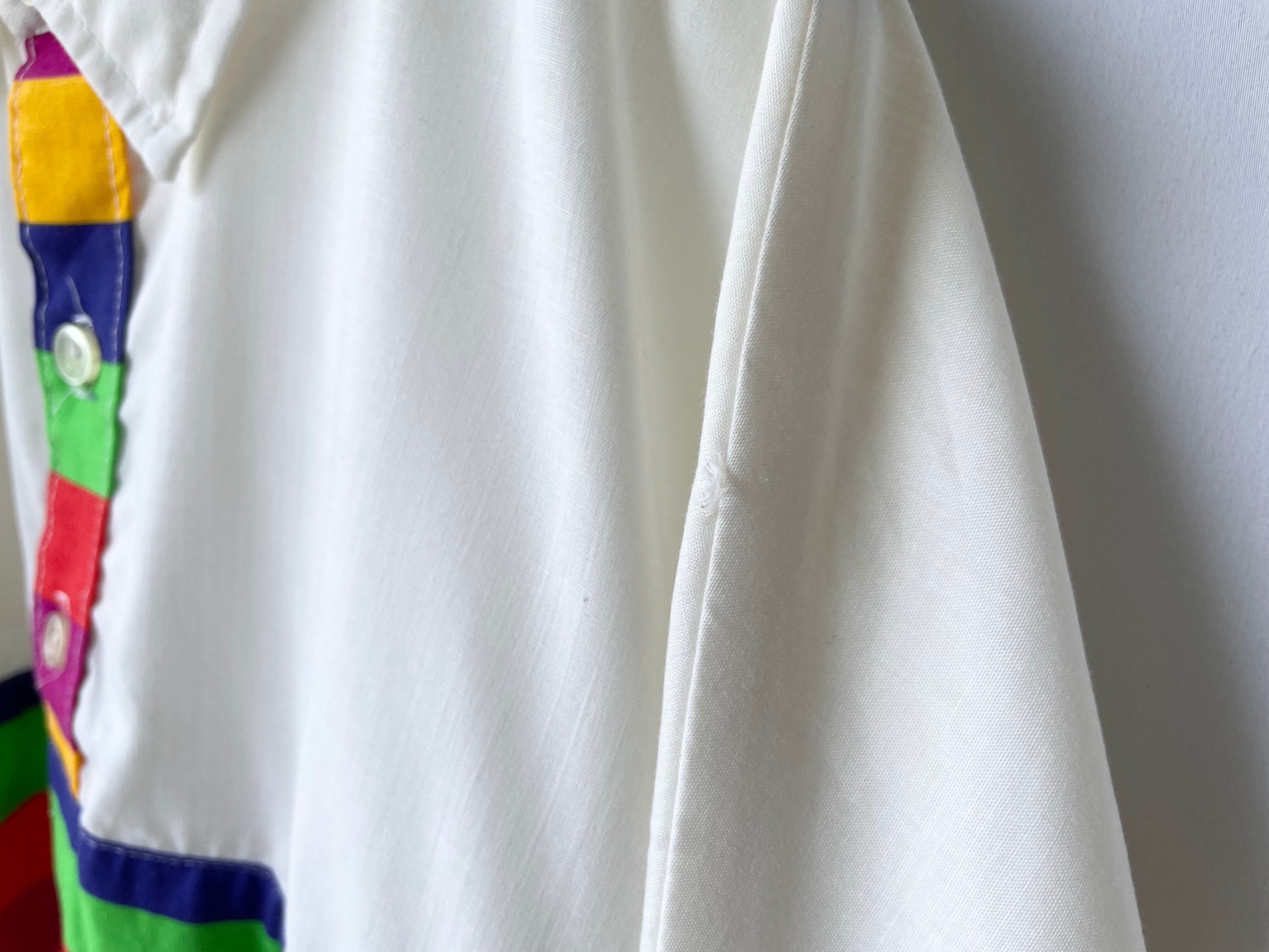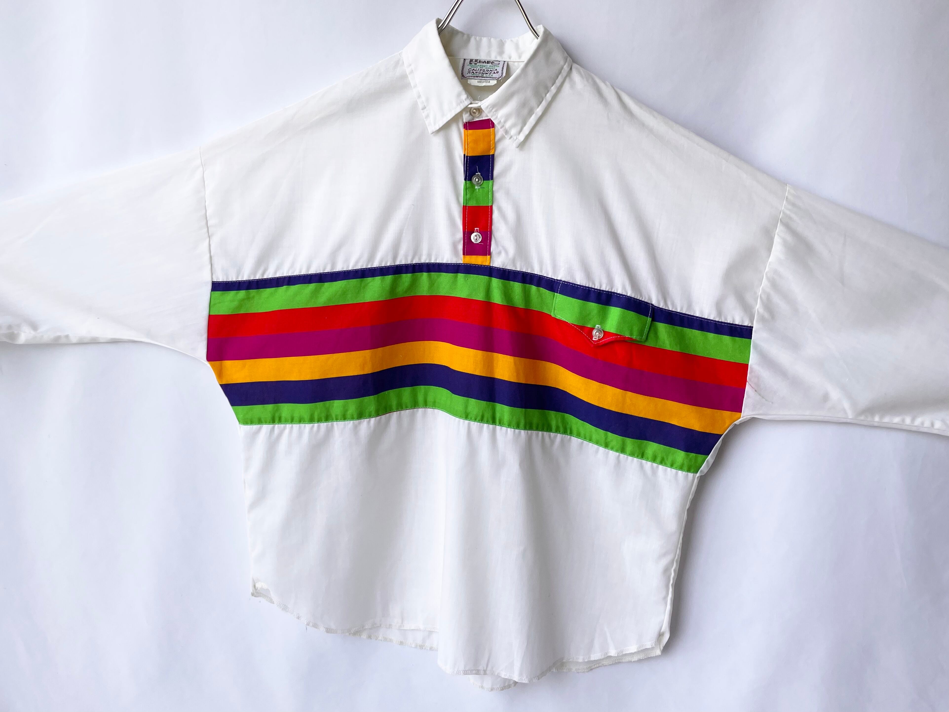 The placket has a switching design with strong multi-colored colors on an off-white base.