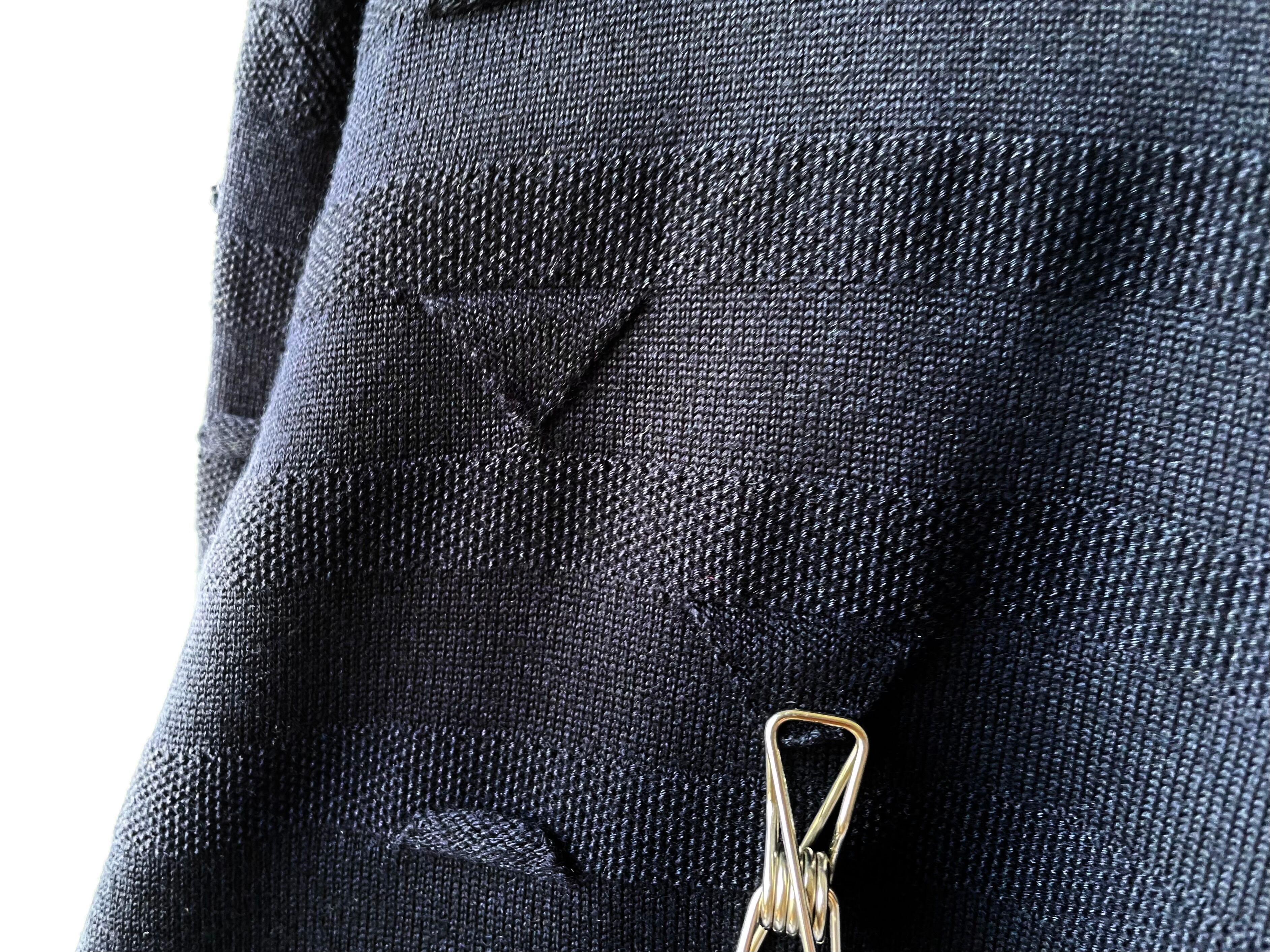 前身頃の数カ所のパーツのみ下の角が縫い付けられた物が存在し、小さな三角の設計がより分かりやすく見えます。