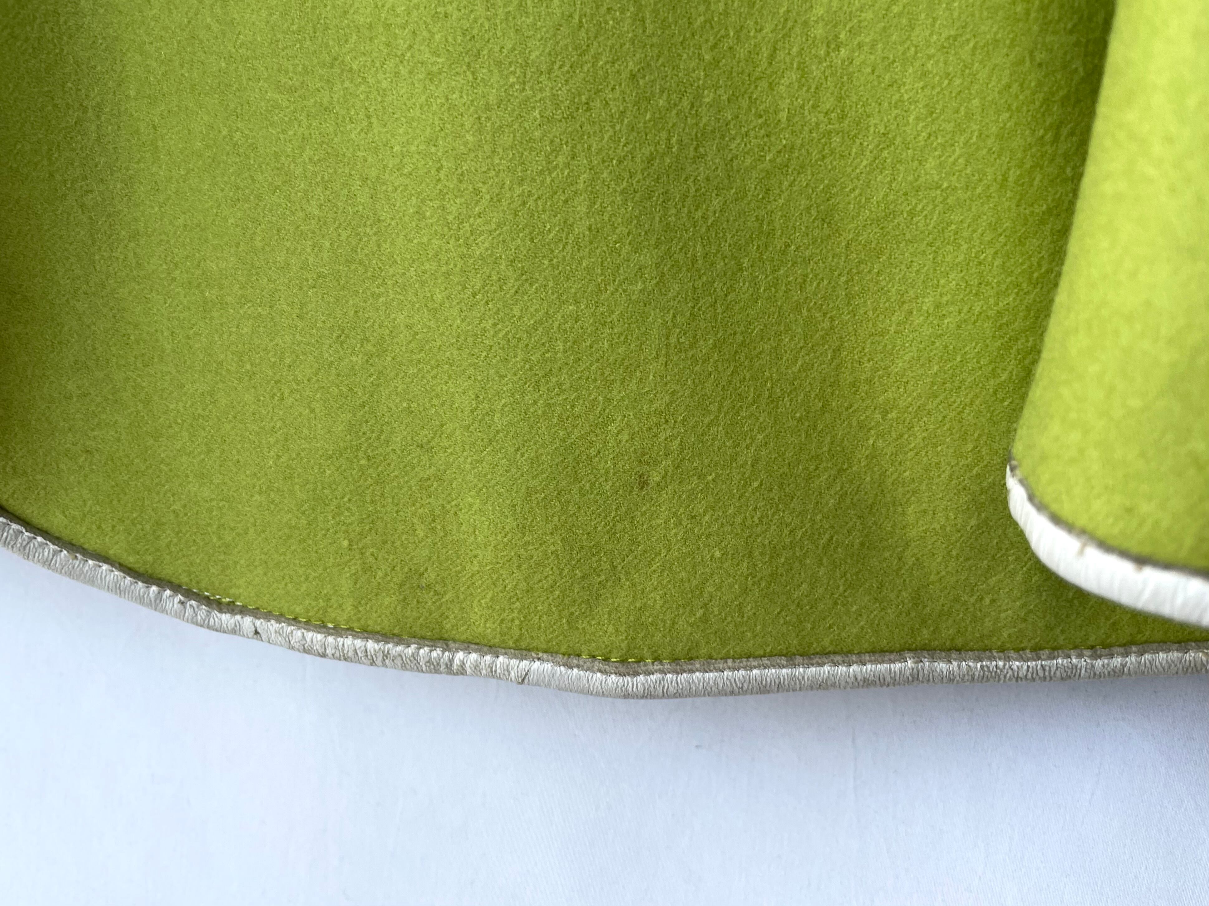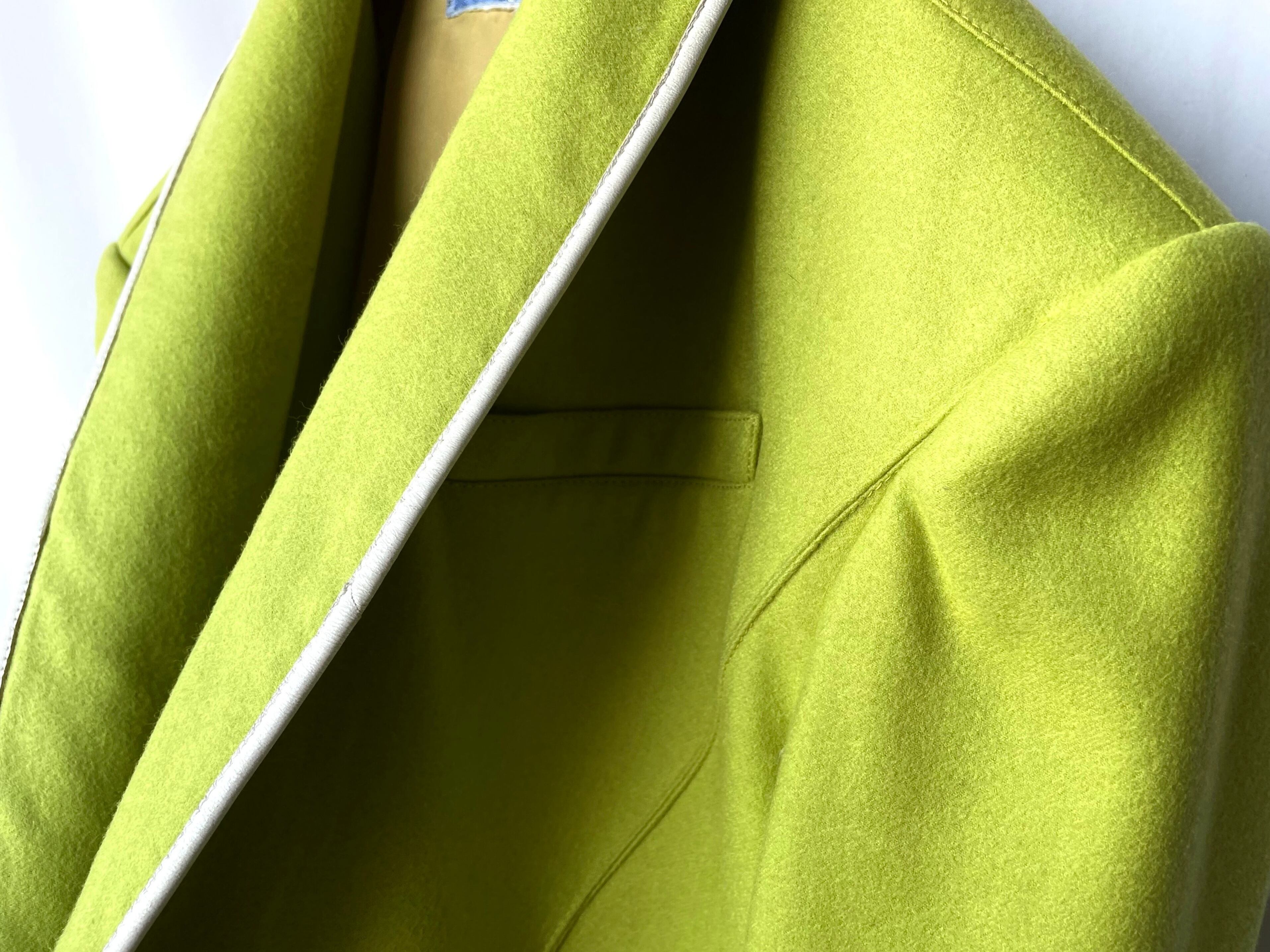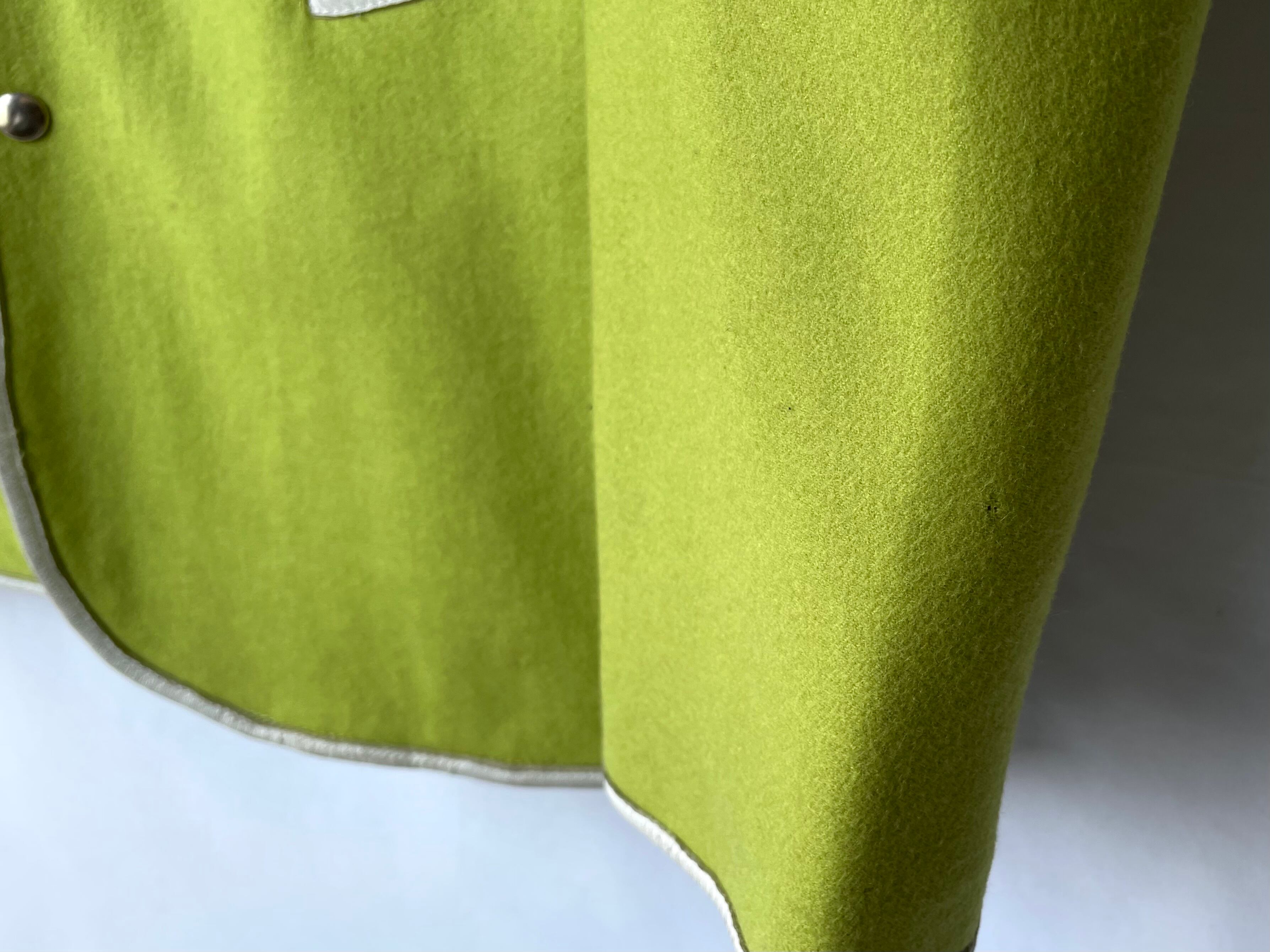 白のパイピングが映える鮮やかなライトグリーンのウール地。