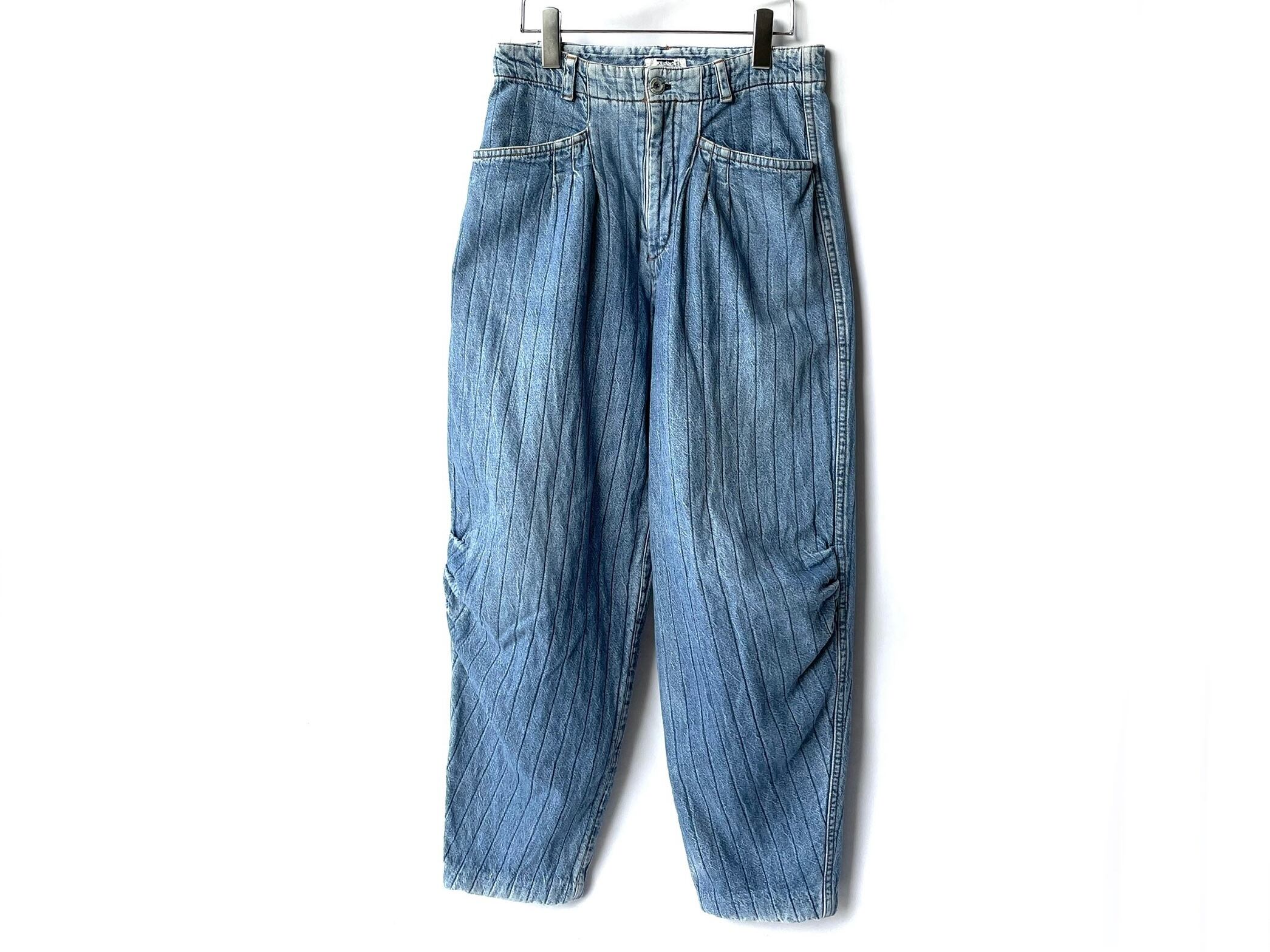 ずっしりと目の詰んだ肉厚なデニム地で仕立てられた、ヘヴィウェイトなワイドトラウザーズ。