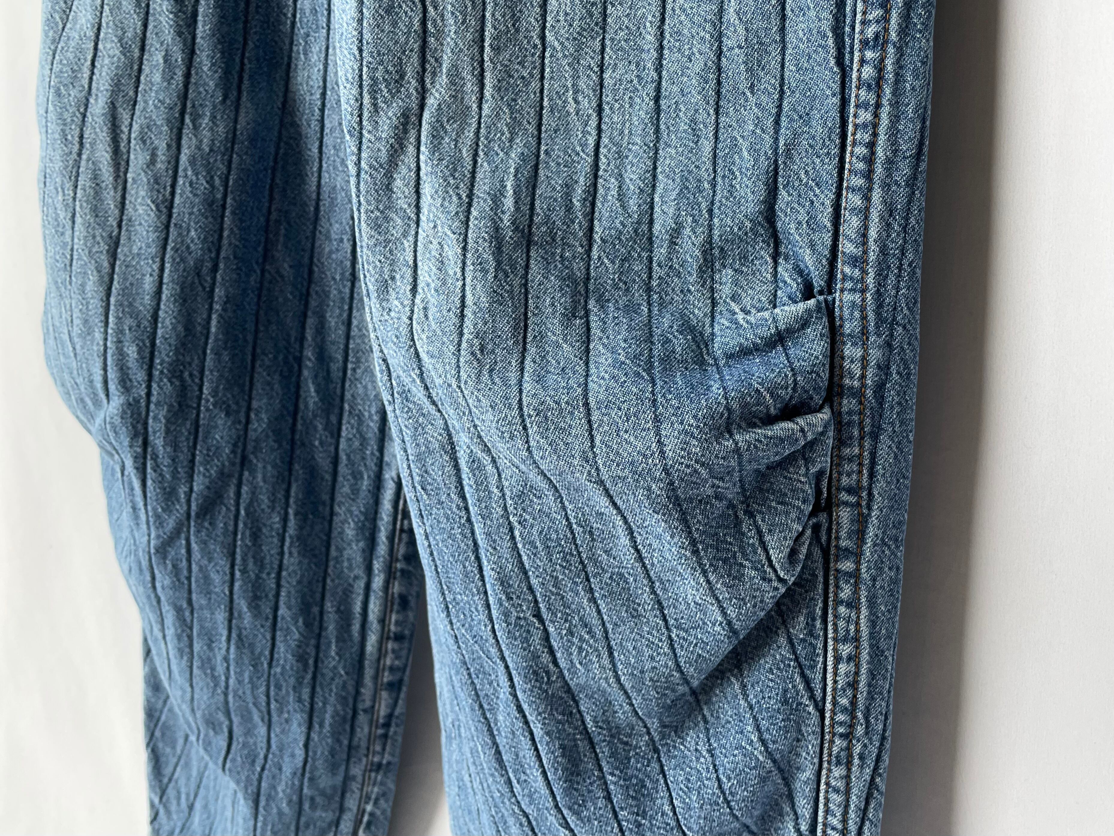 Unique tuck design at the knees and below the front pockets that creates a unique bulge.