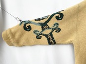 small patch on left shoulder, pale tone knitting pattern that extends to the sleeve