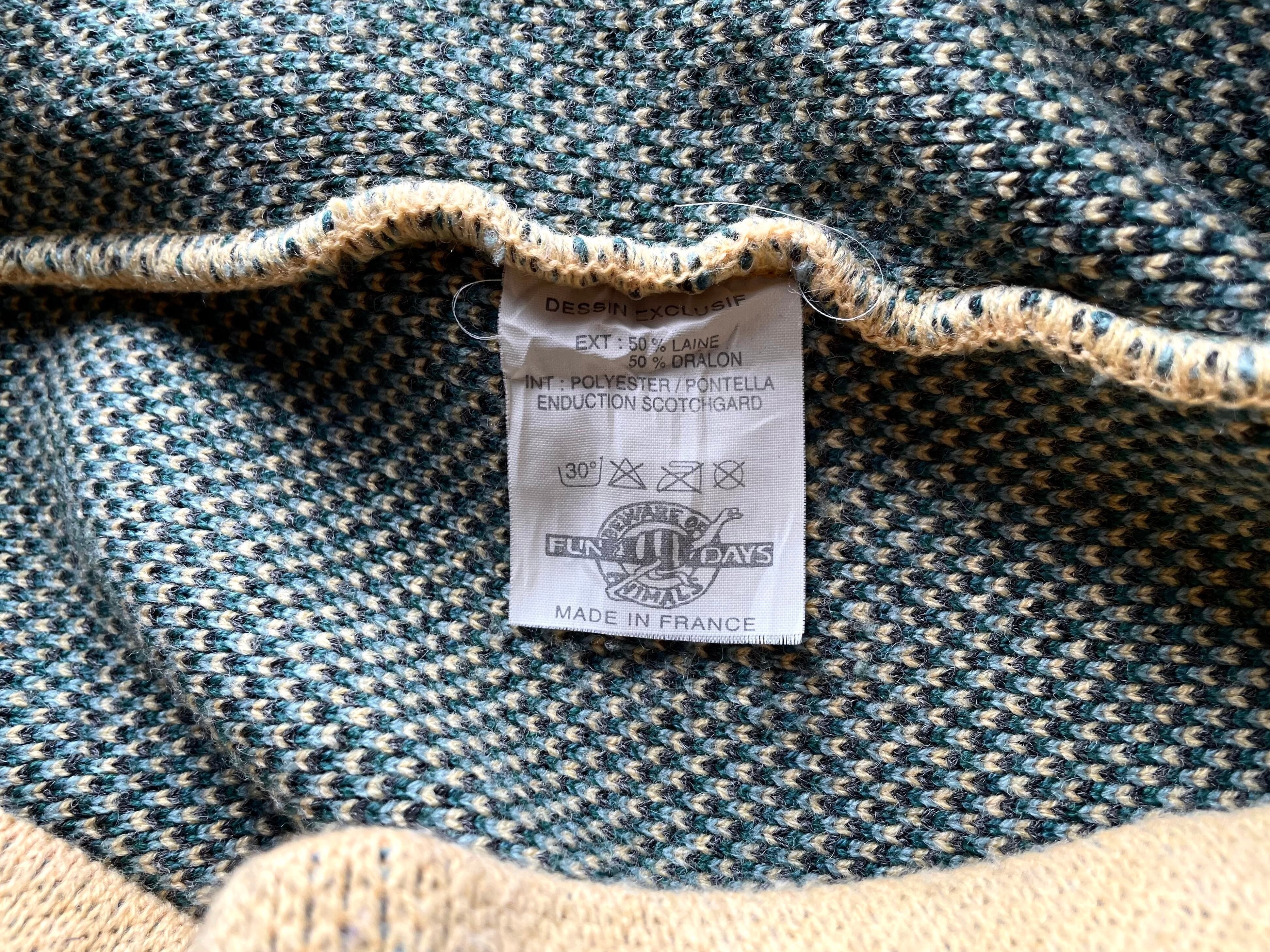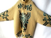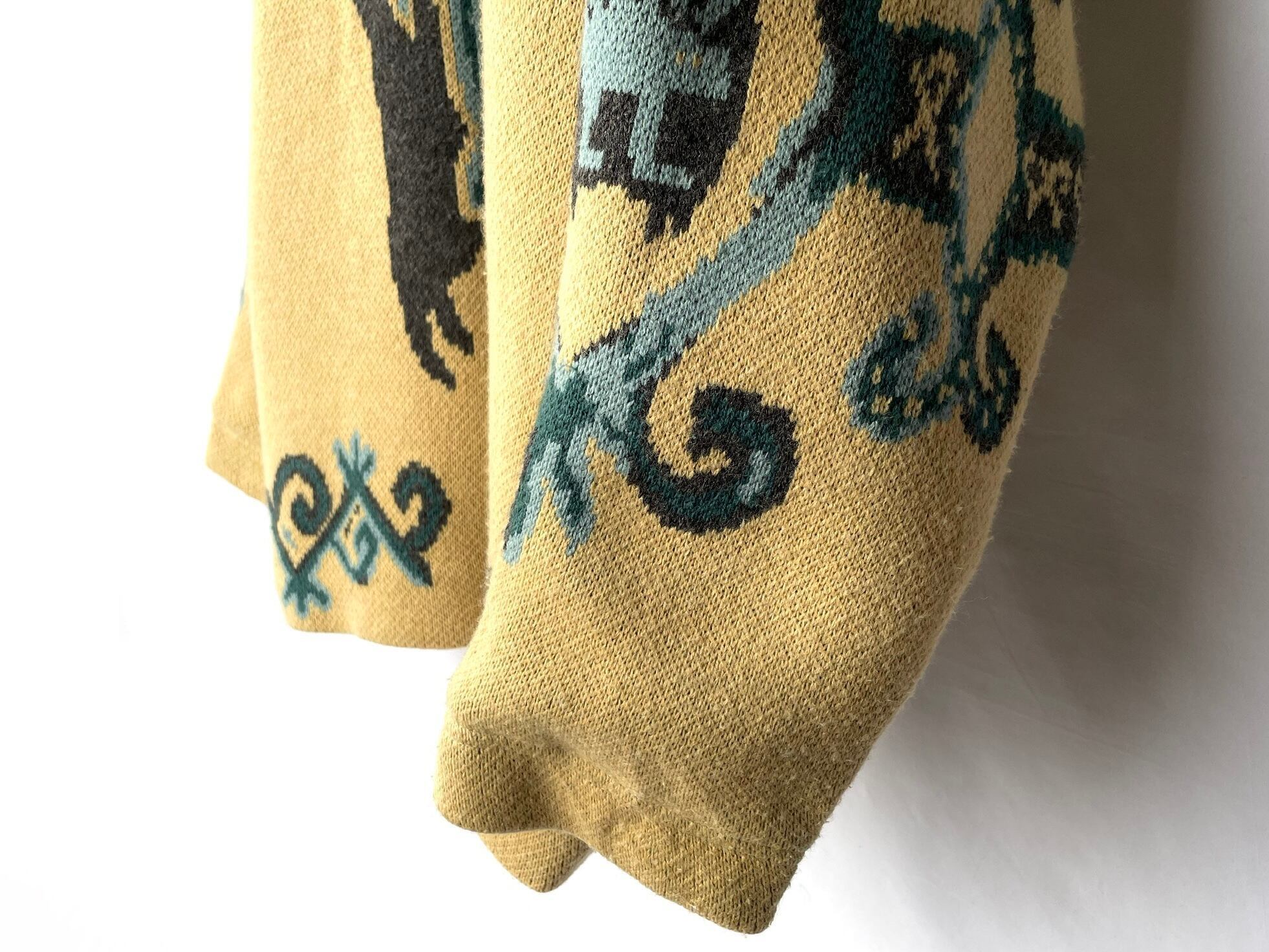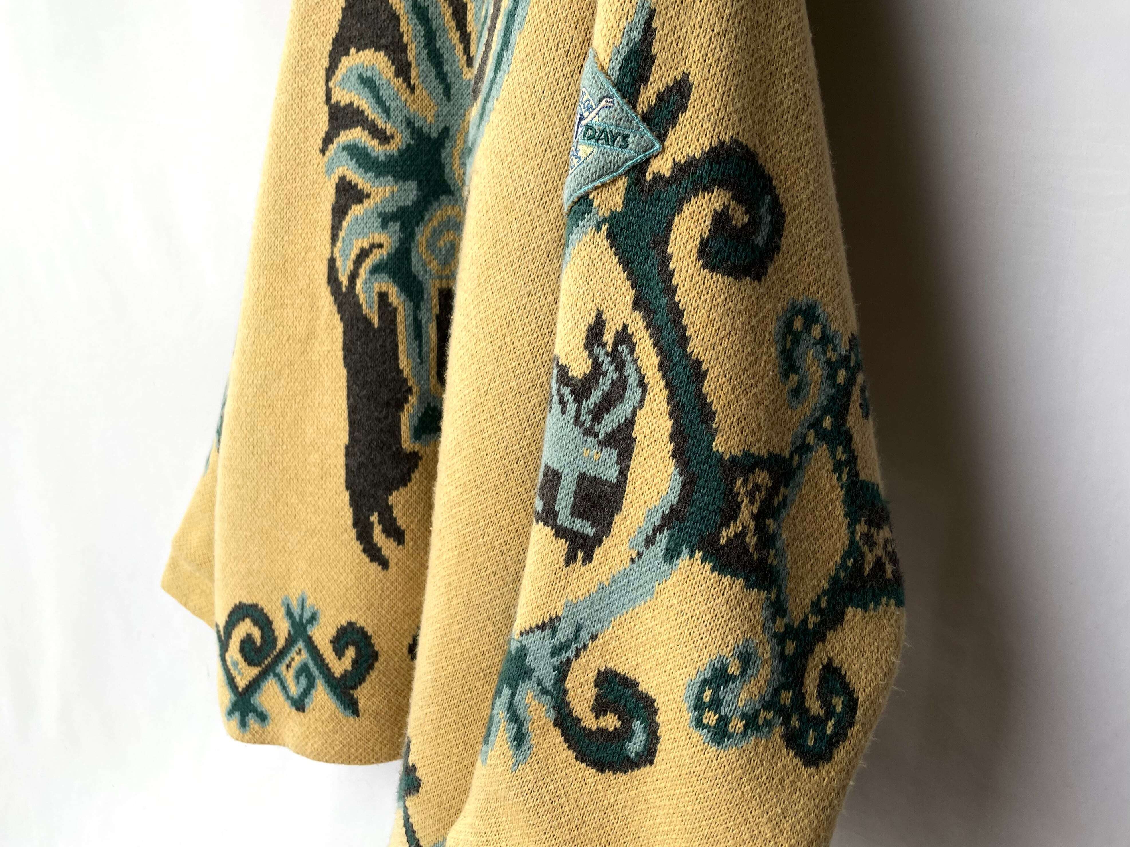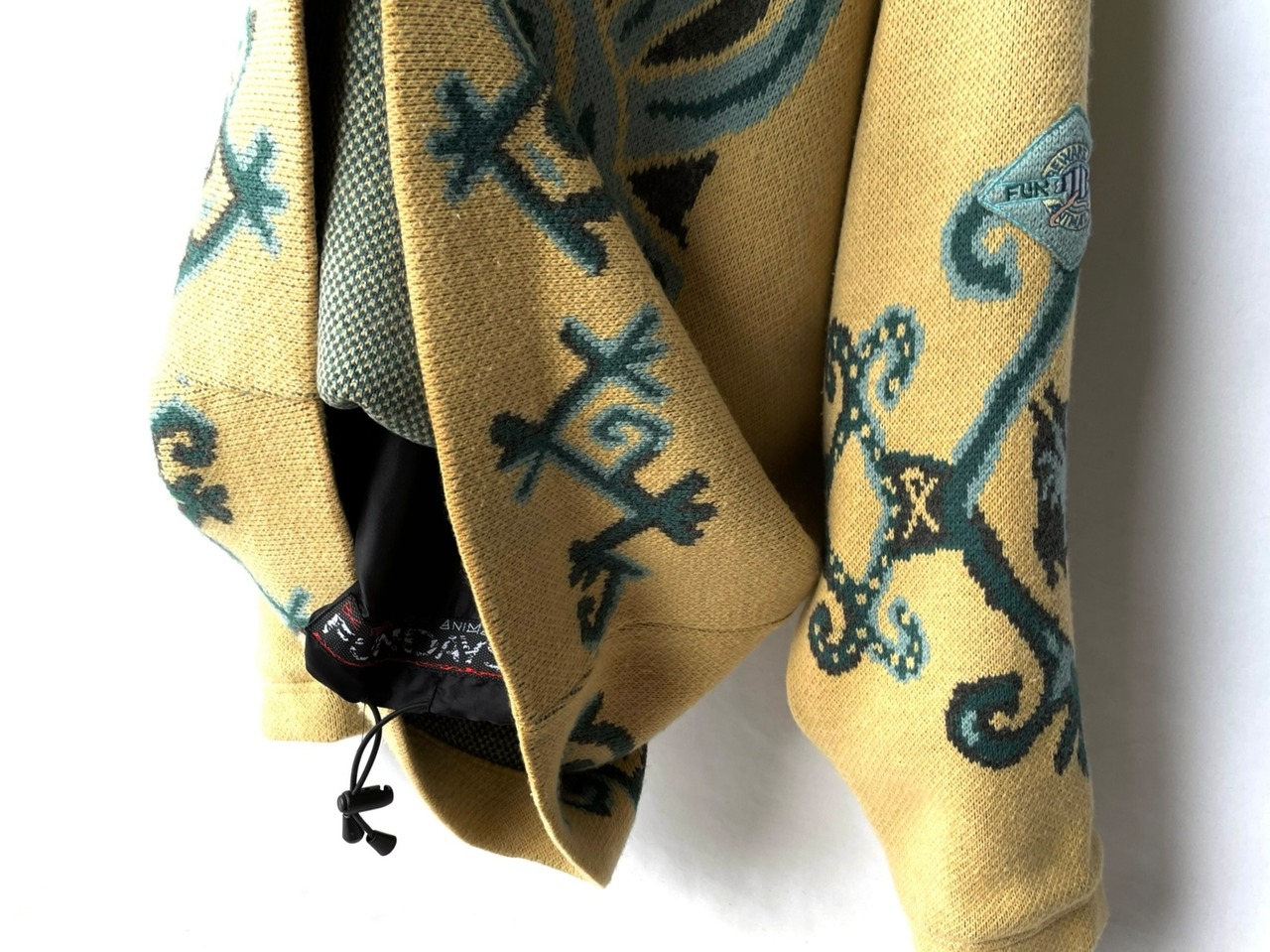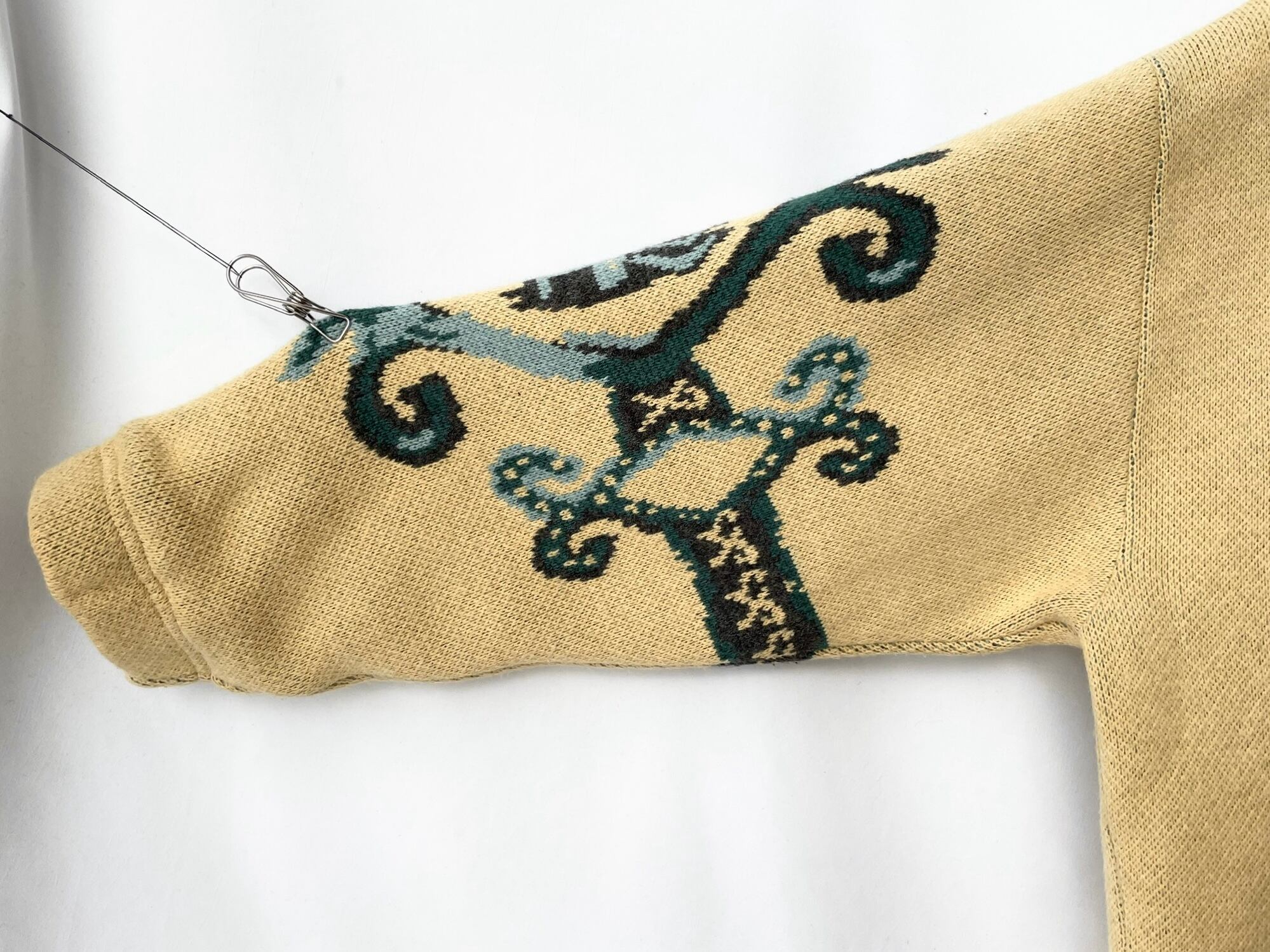 左肩のワッペン、袖にまで入るペールトーンの編み柄。