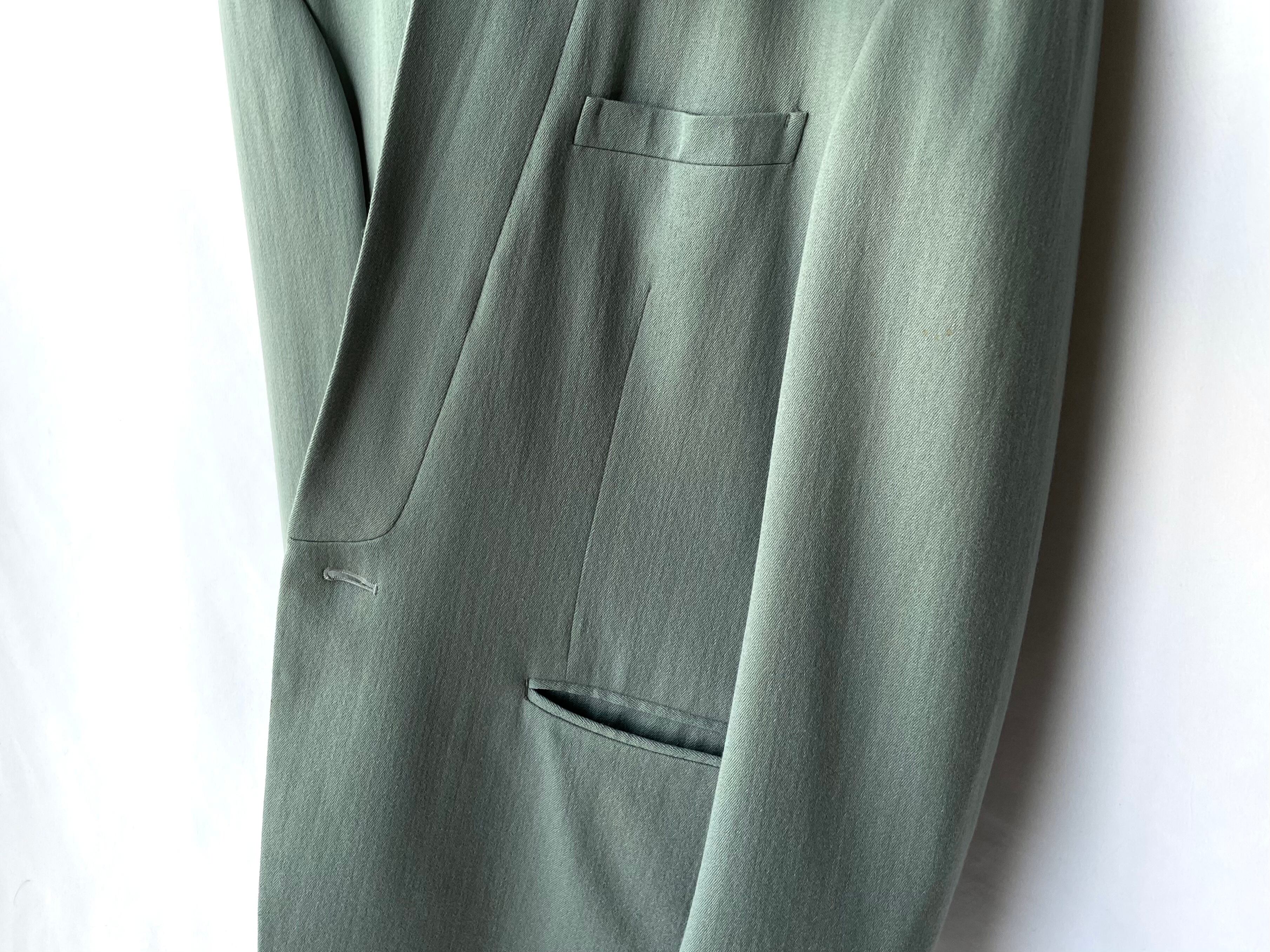 ラペルパーツが緩く弧を描き切り替えられた、腹部一段の細身のショールカラーデザイン。