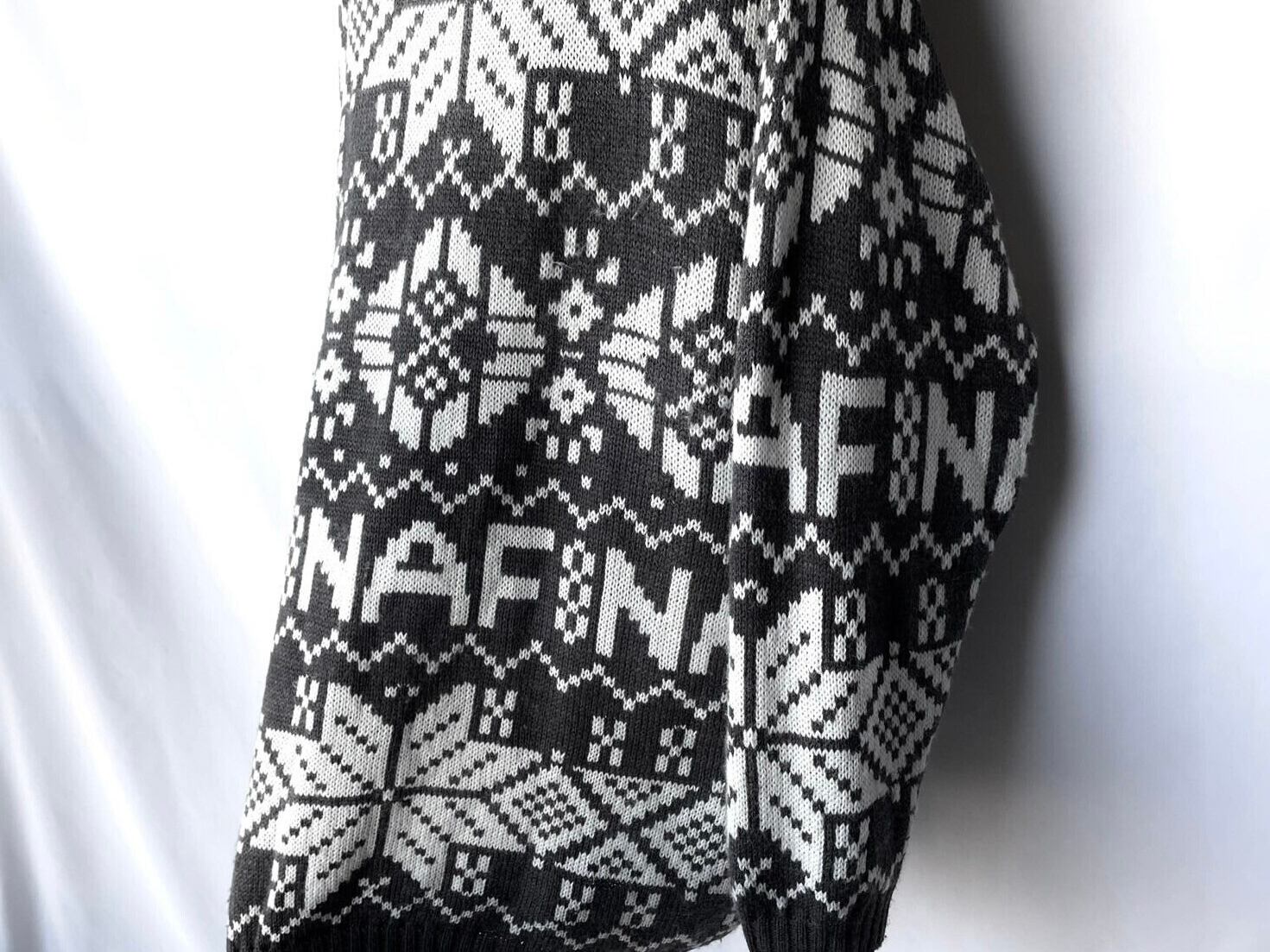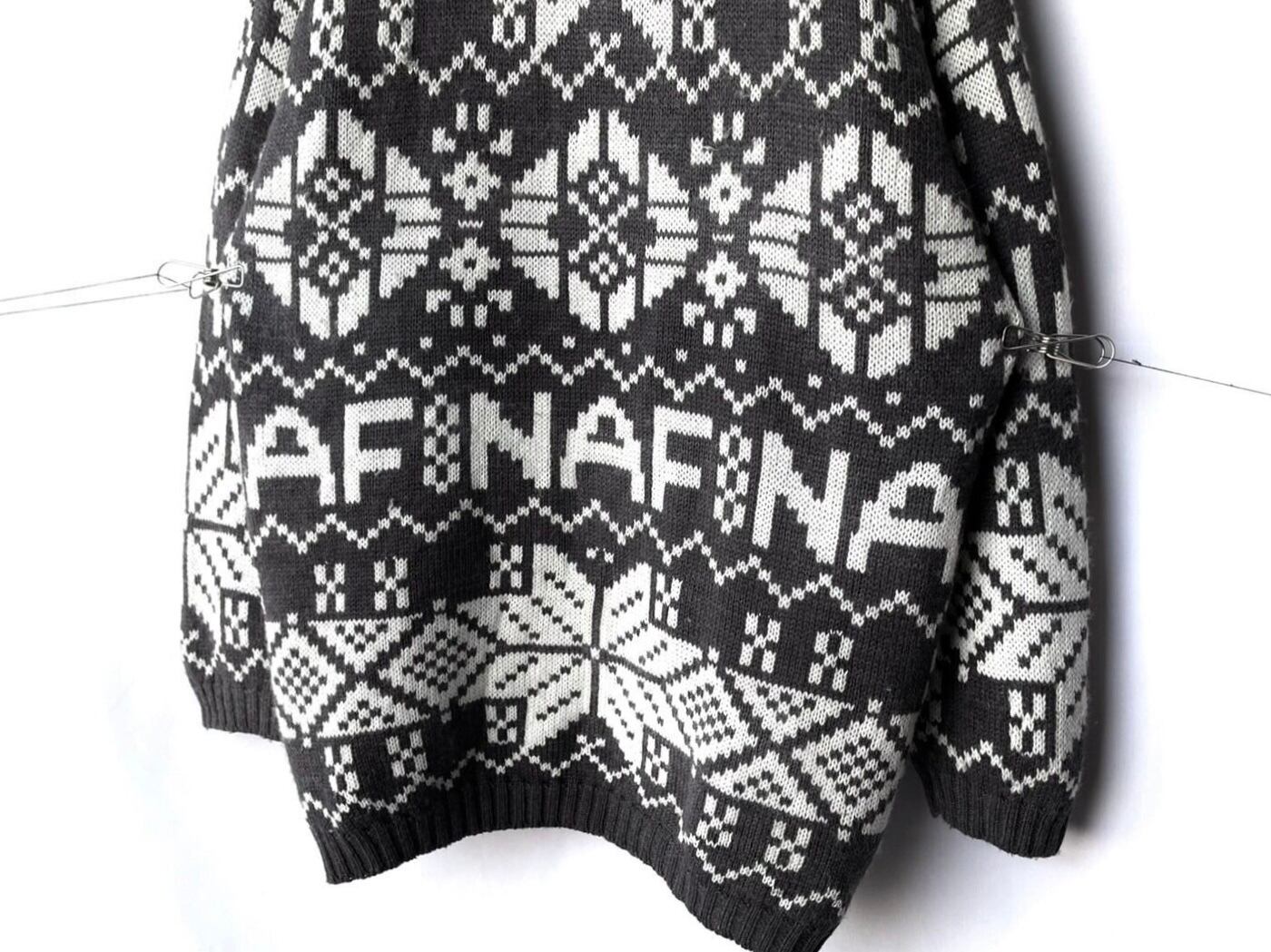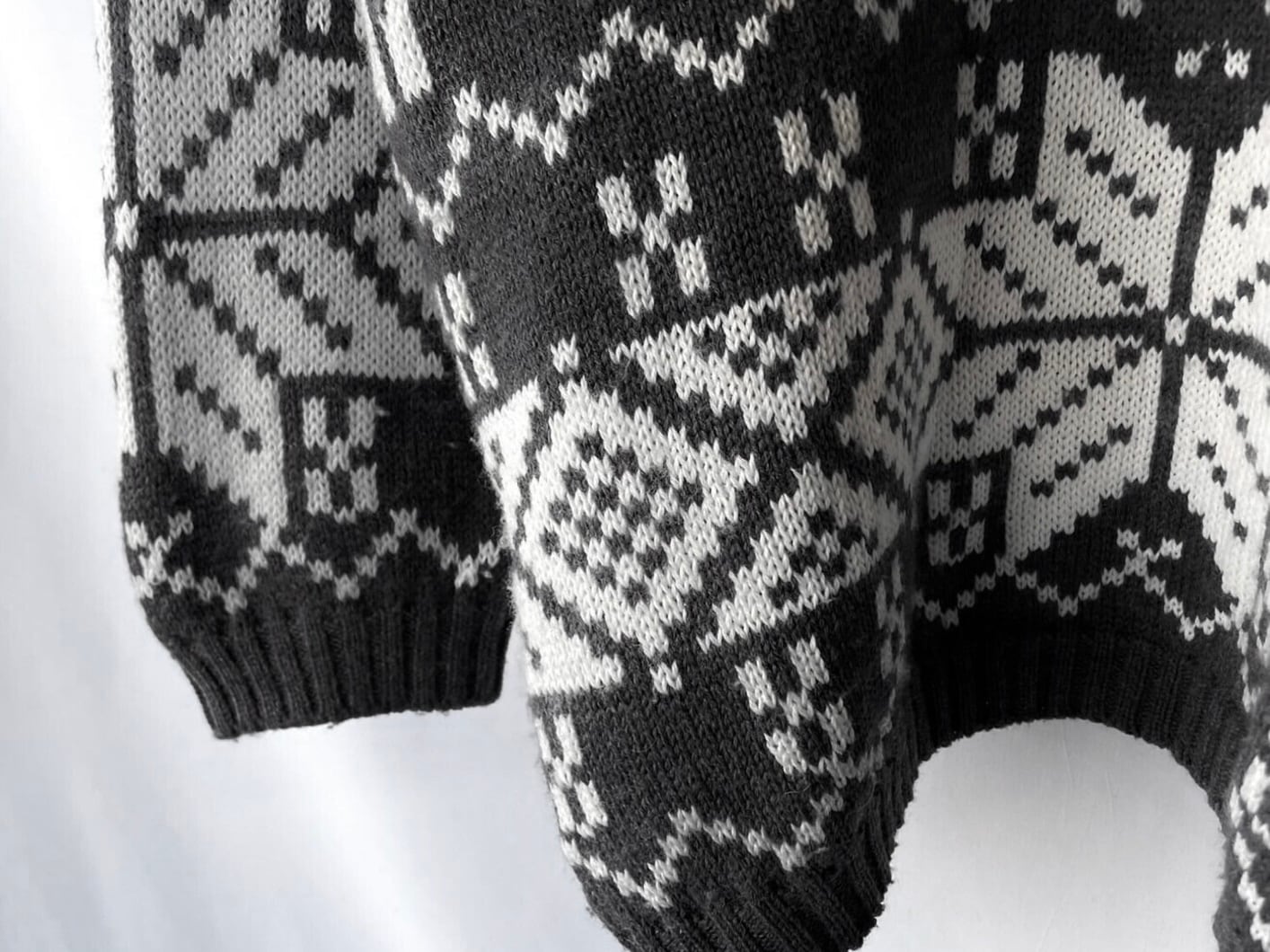 The brand name blends into the charcoal x white Nordic pattern around the body/sleeves.
