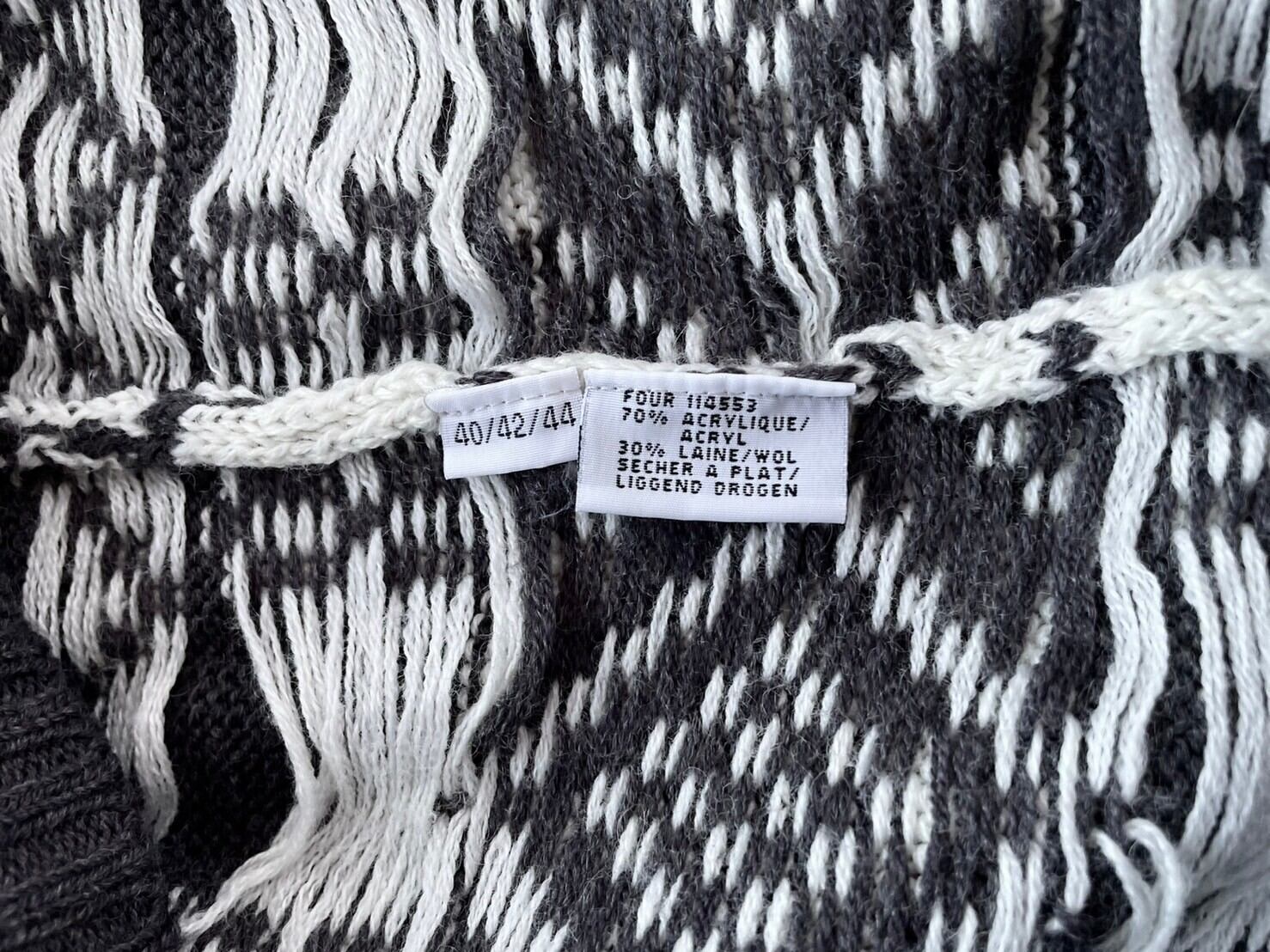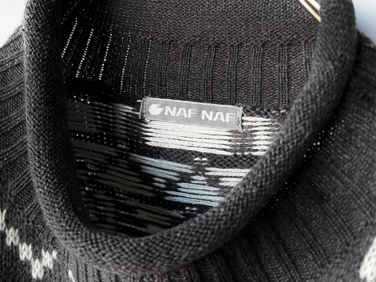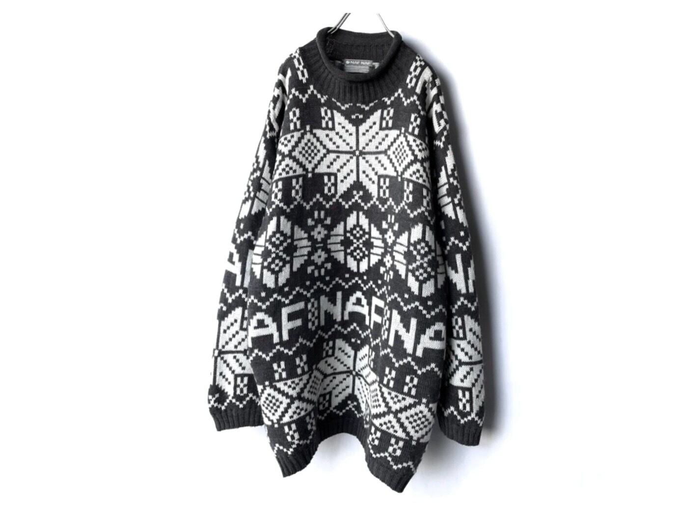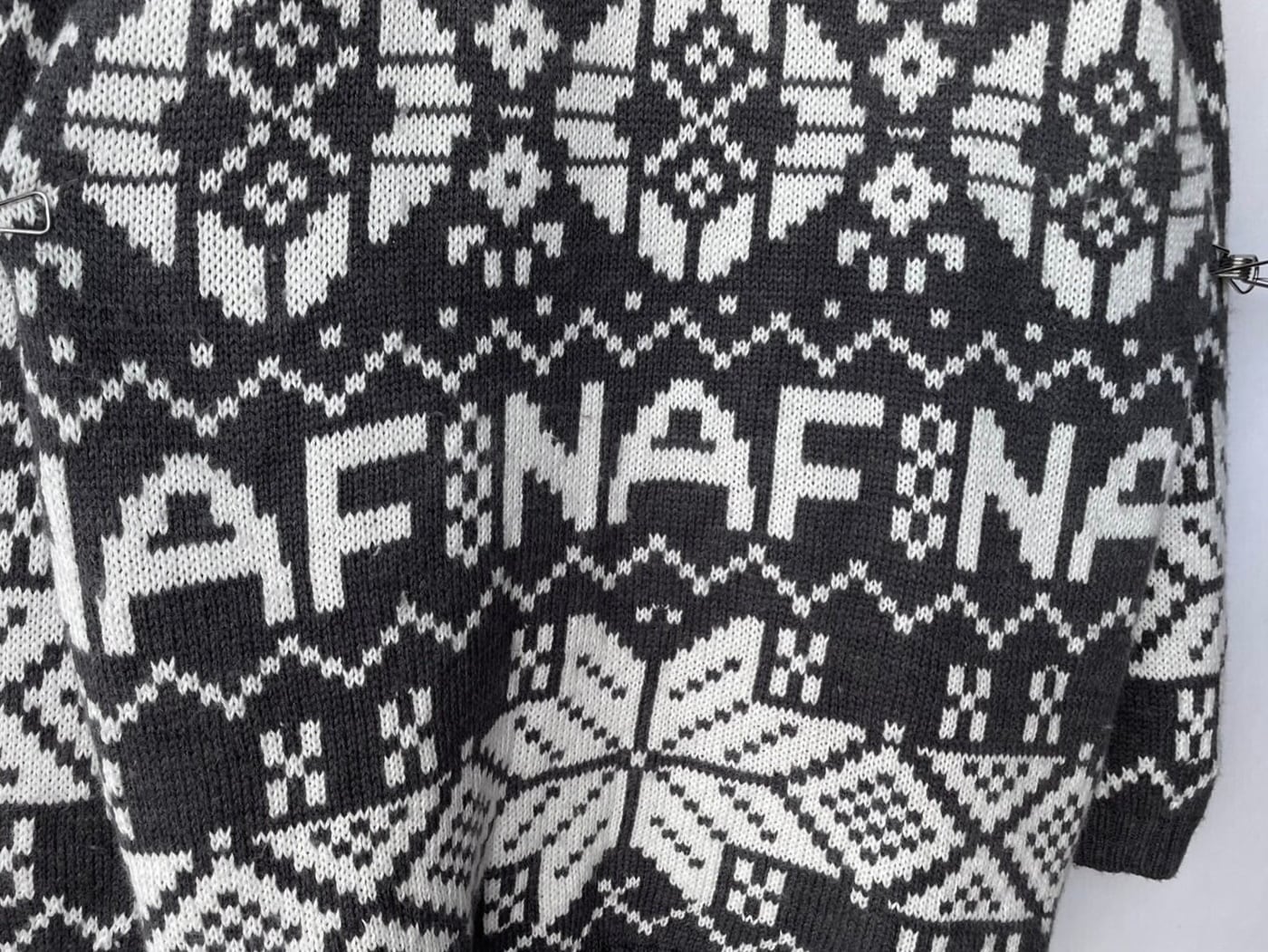 The brand name blends into the charcoal x white Nordic pattern around the body/sleeves.