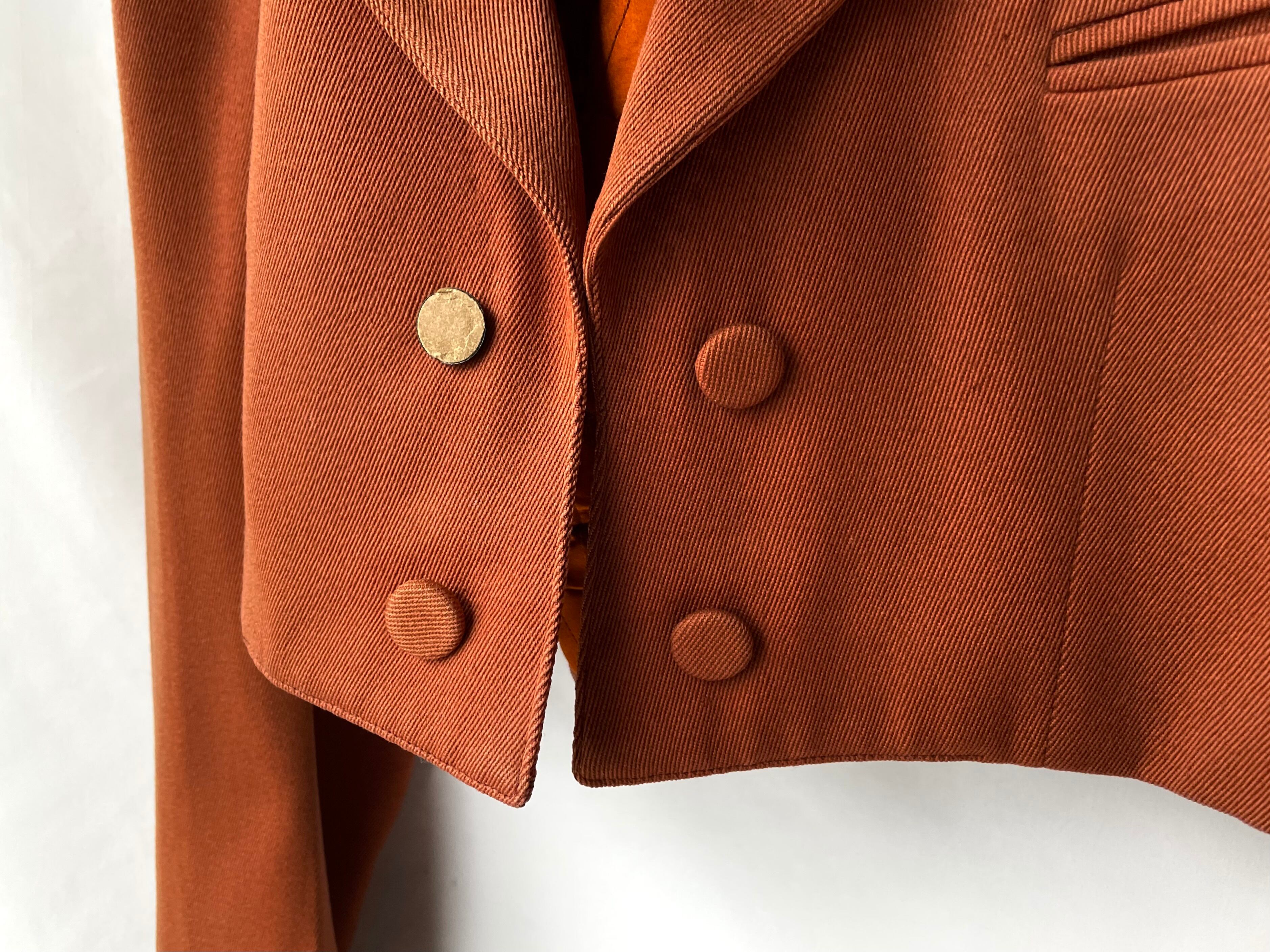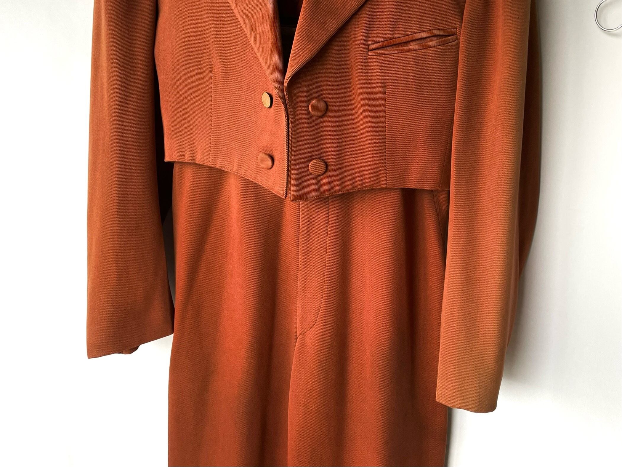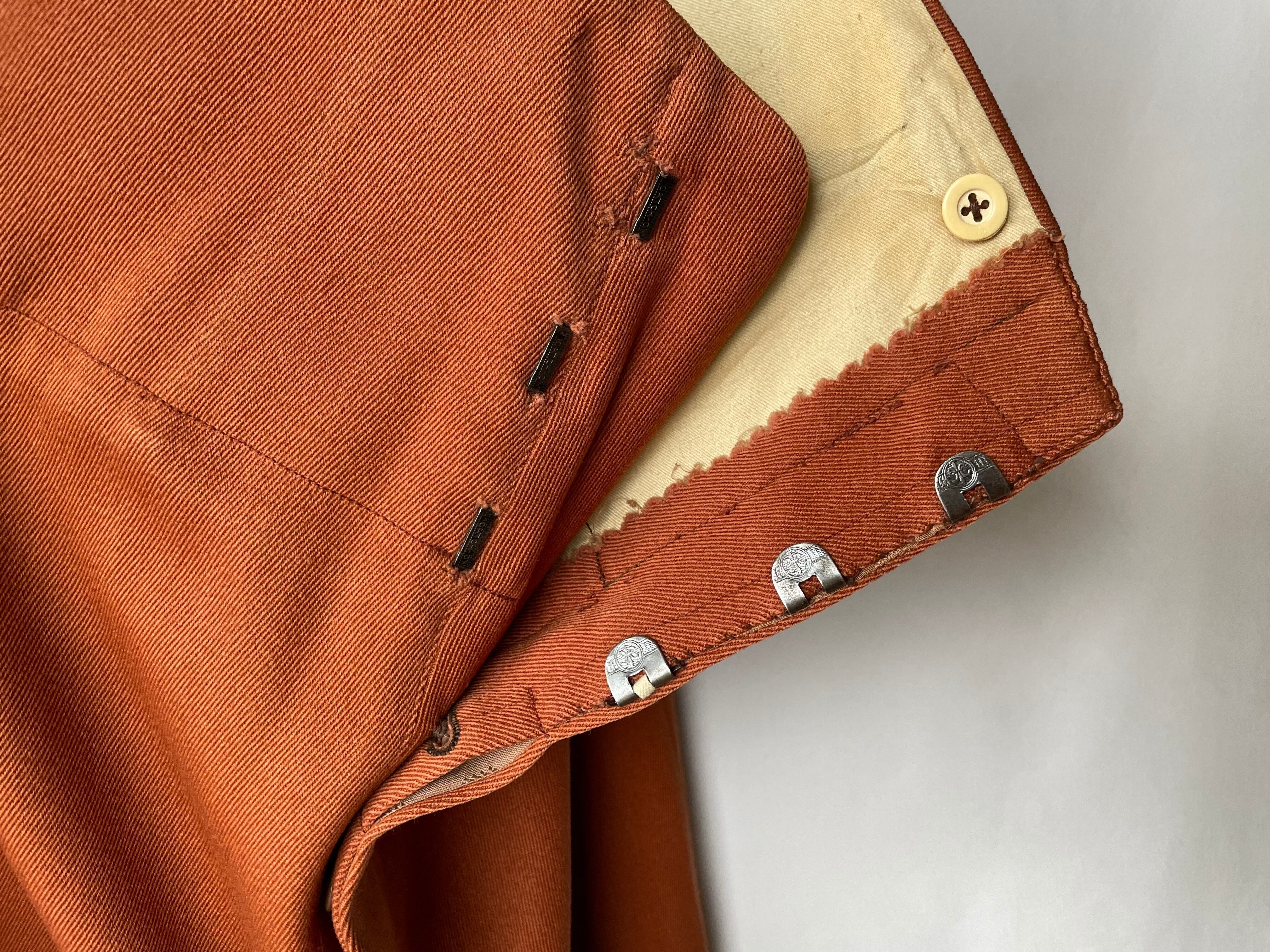 The jacket has decorative buttons, the bottoms have a button fly, and the abdomen has a metal hook closure.