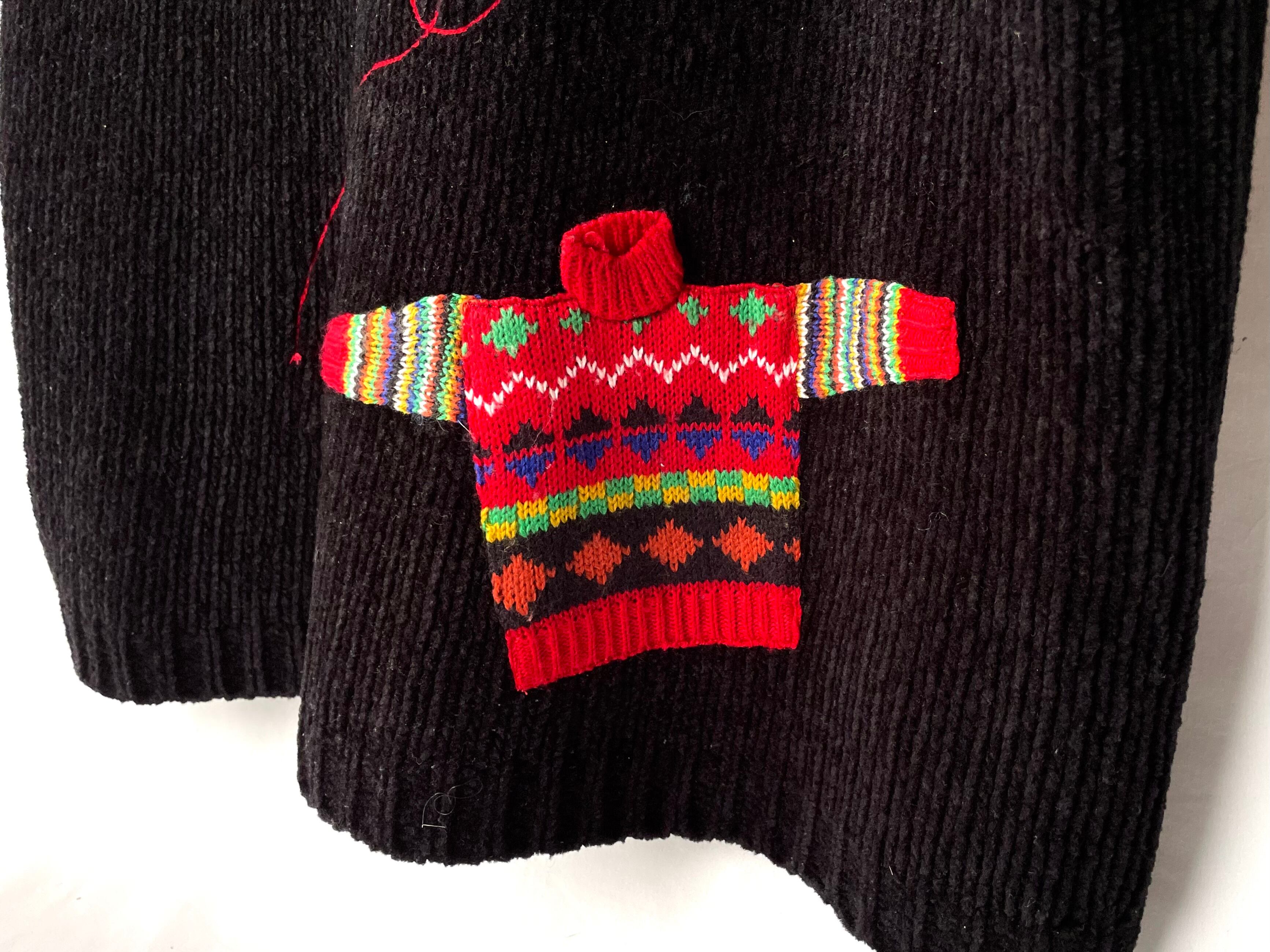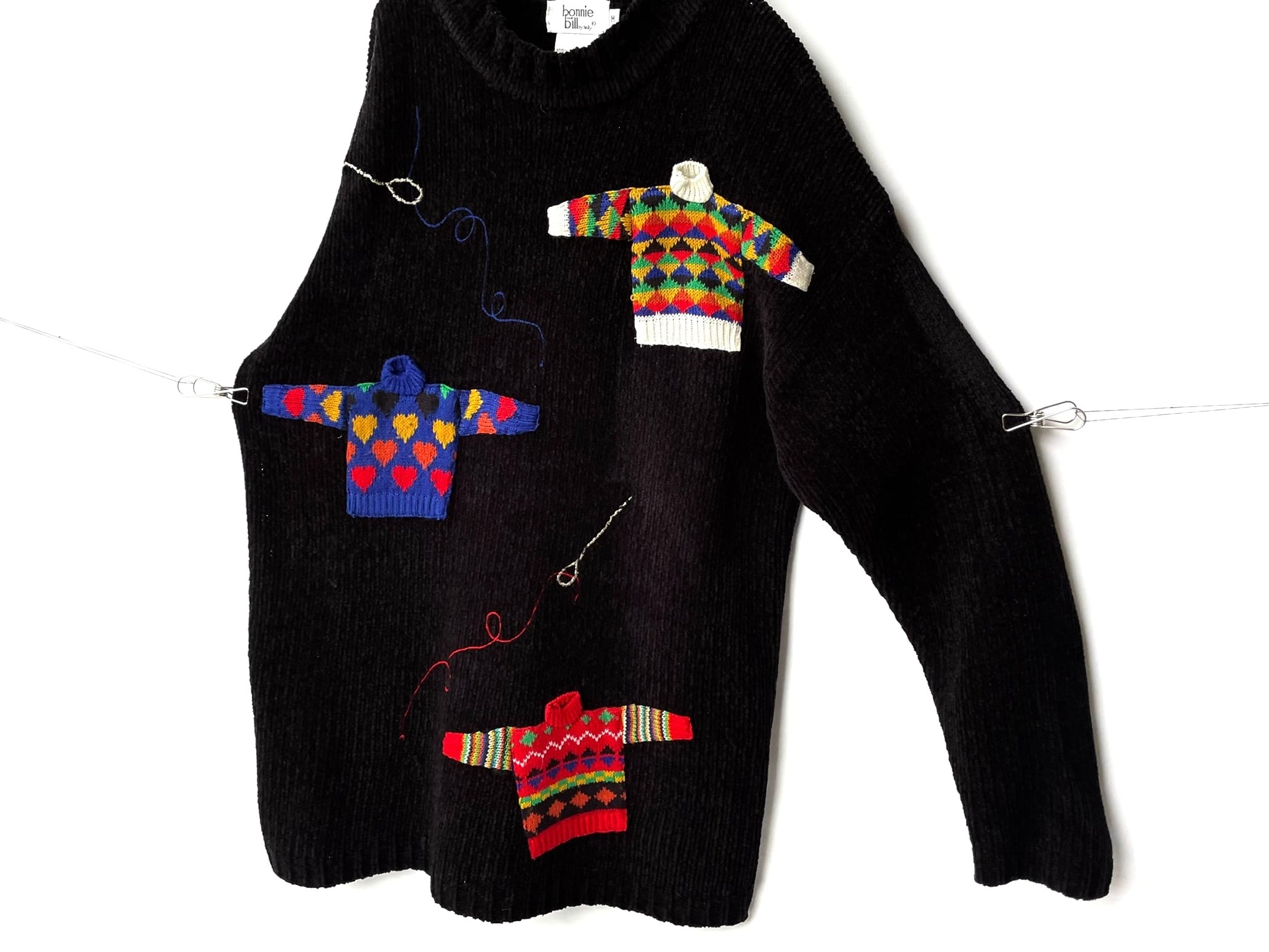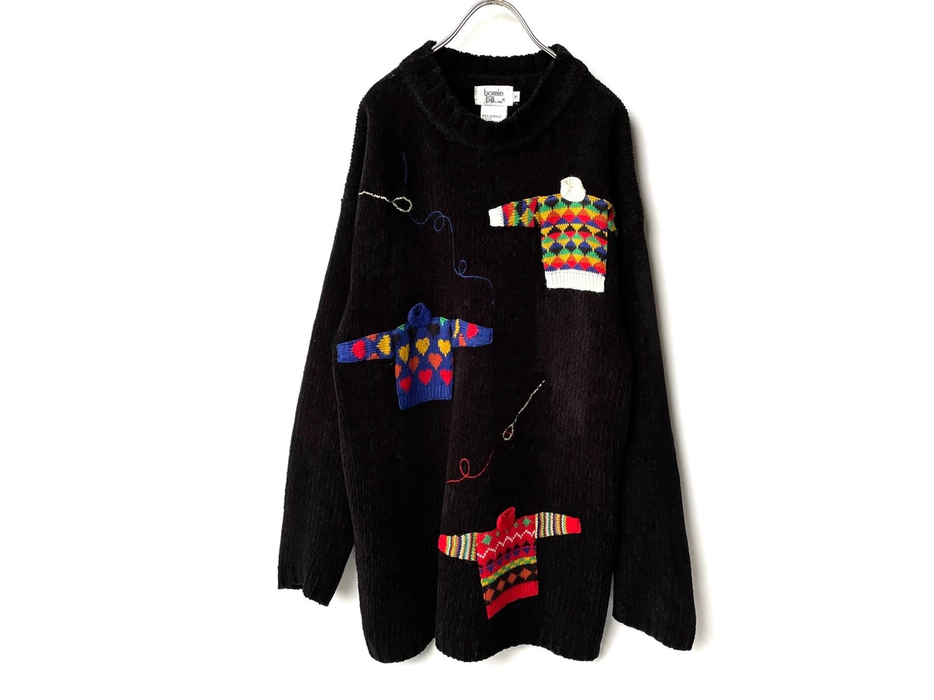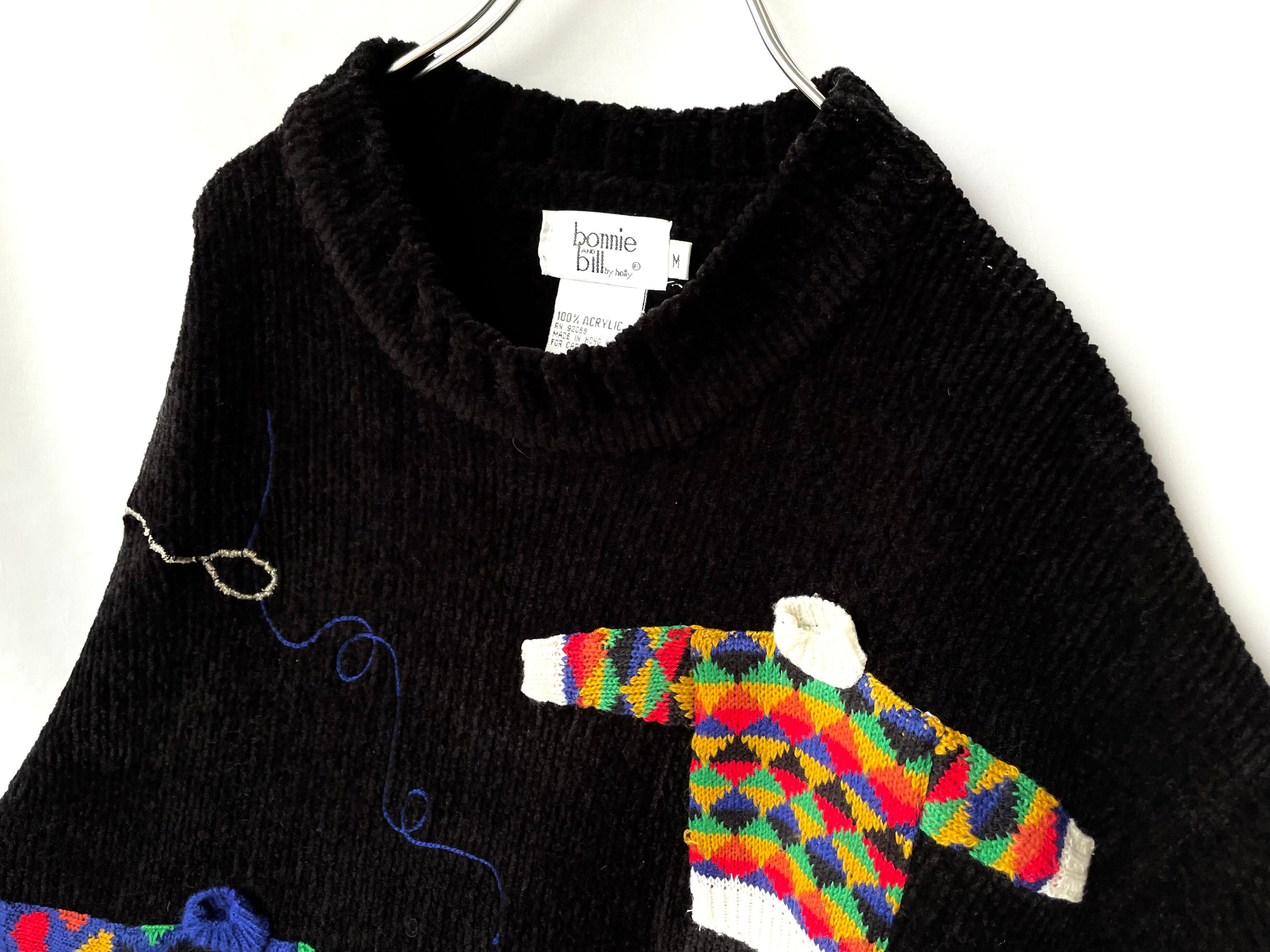 A cute motif with a thick black body knitted with glossy mall thread, knitting needles with threads running through them, and three types of sweaters.