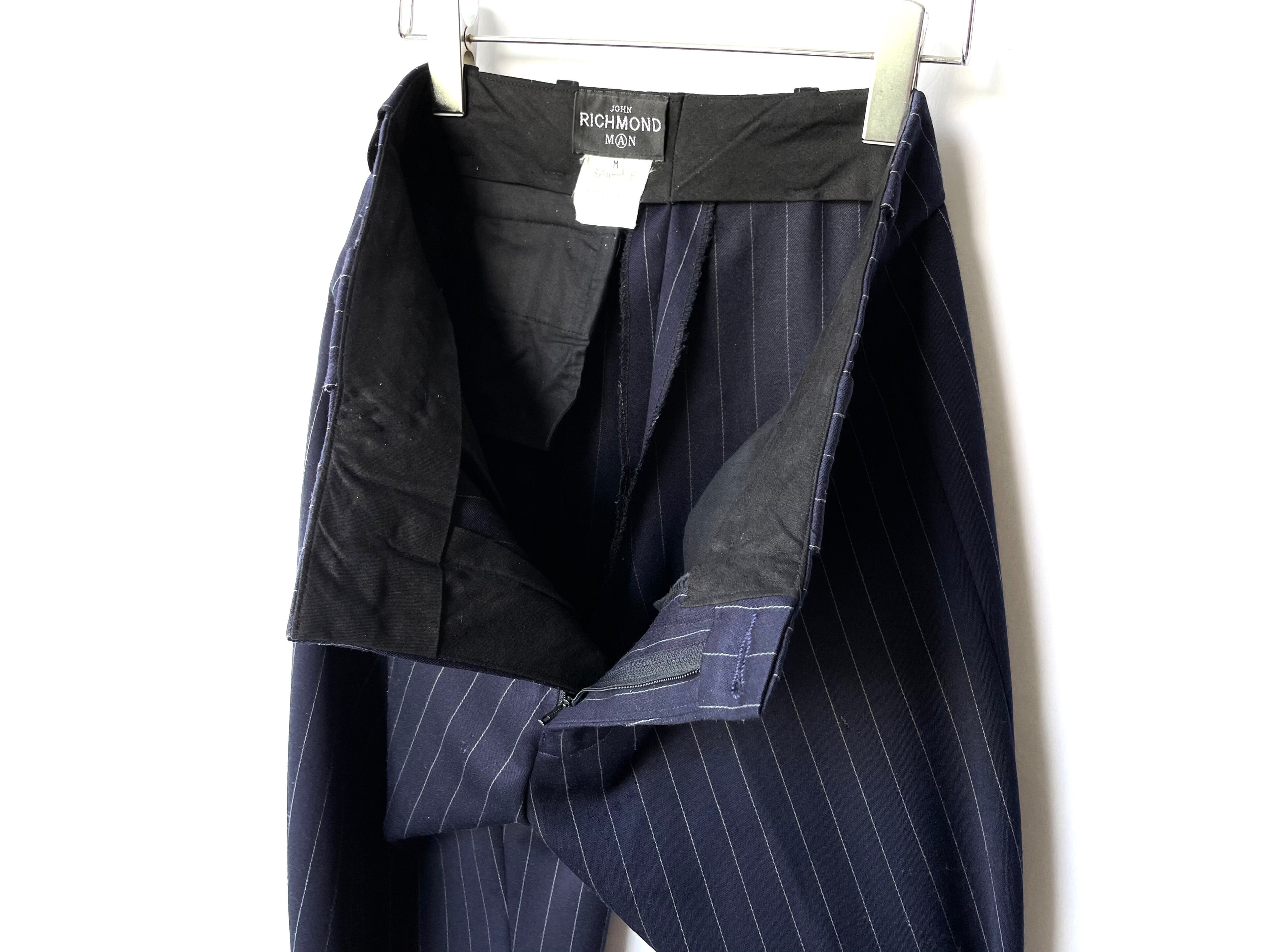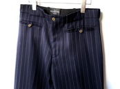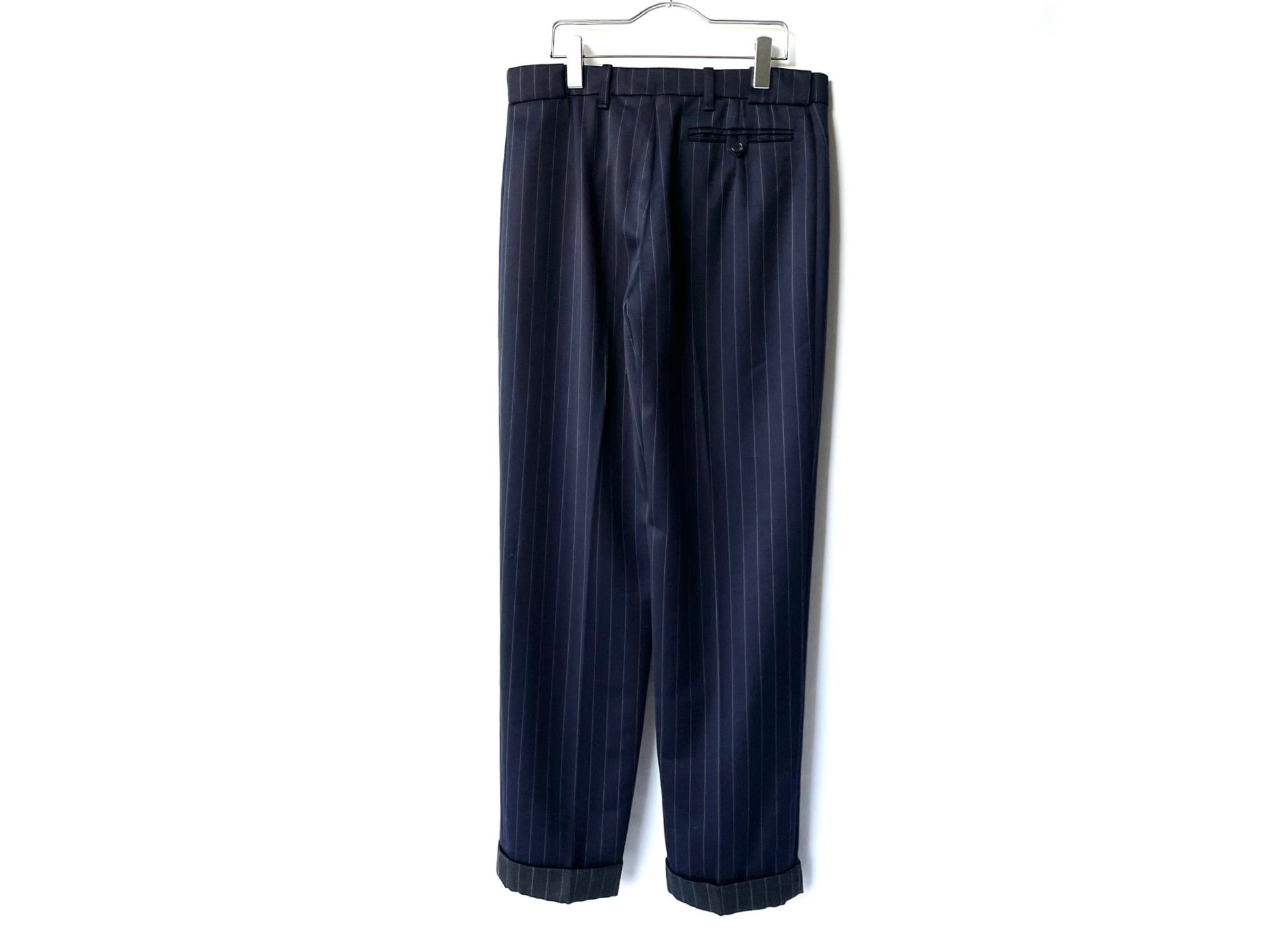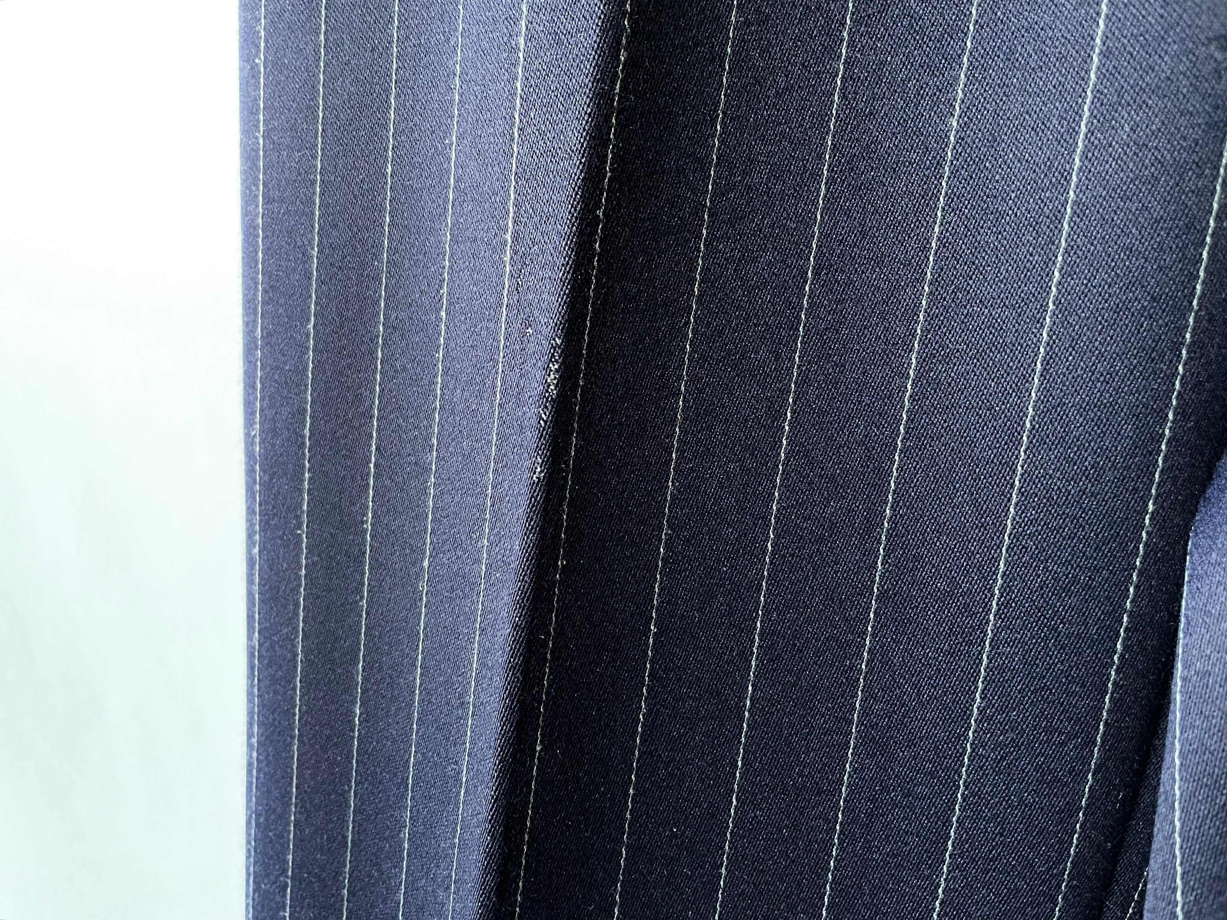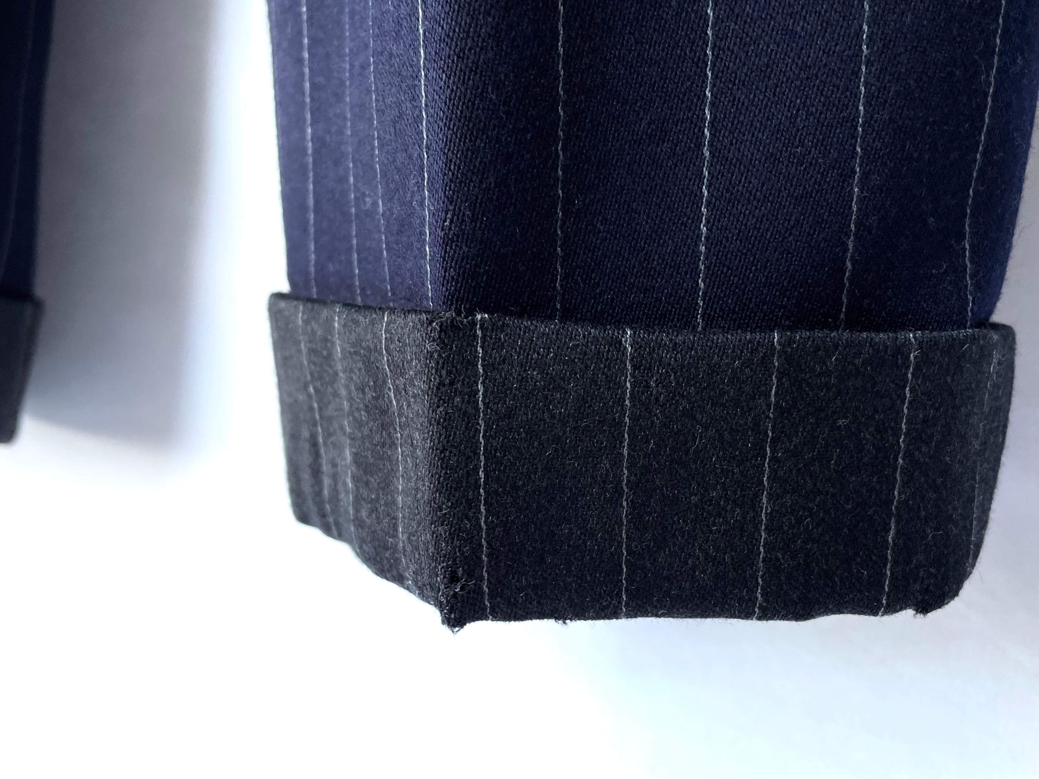 深い濃紺のピンストライプに、ダブル仕上げの両裾はチャコールカラー。
