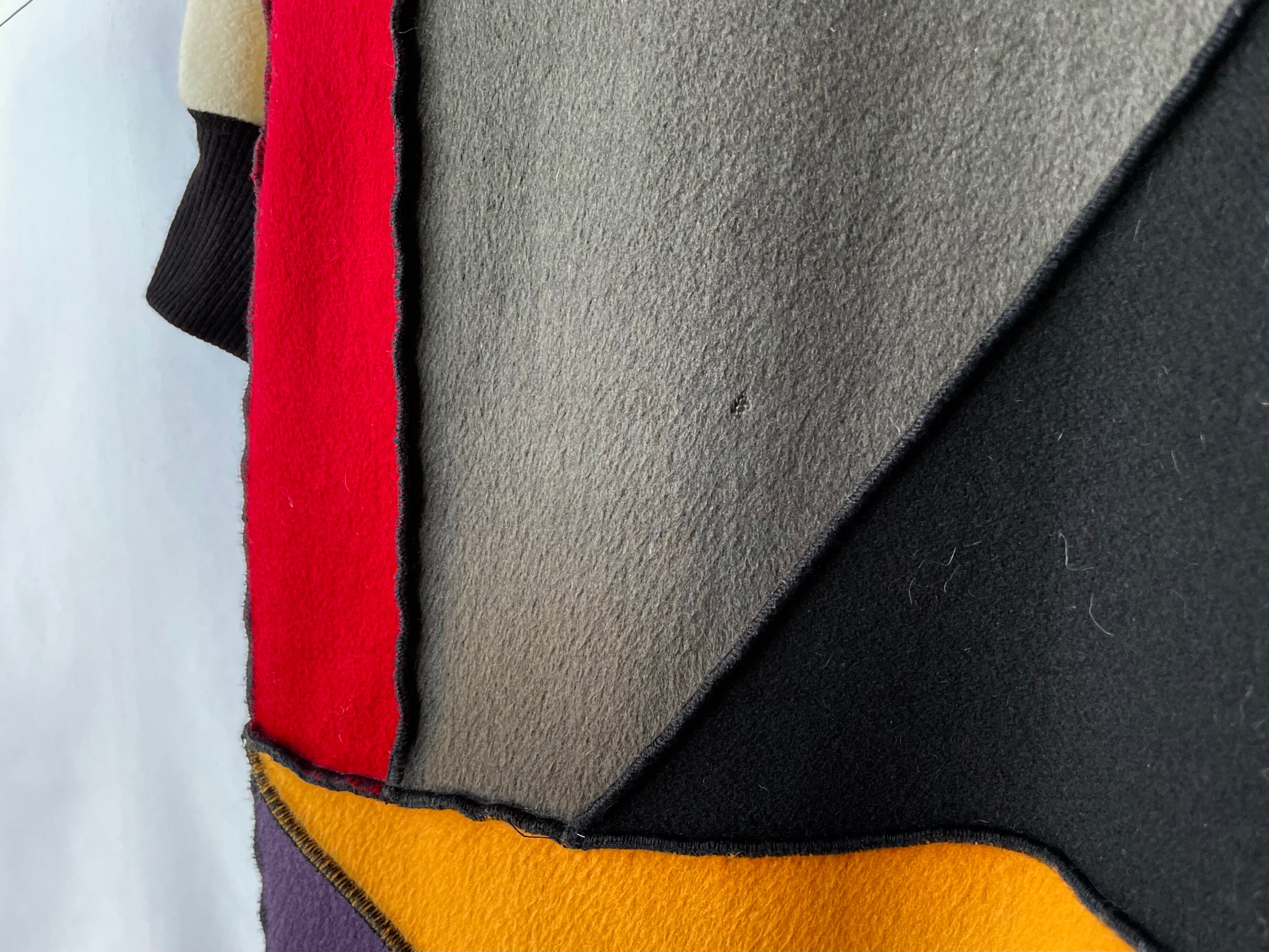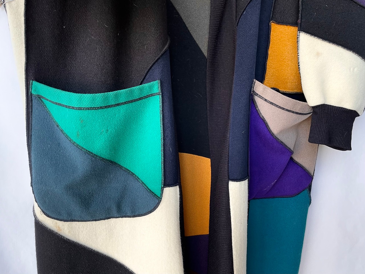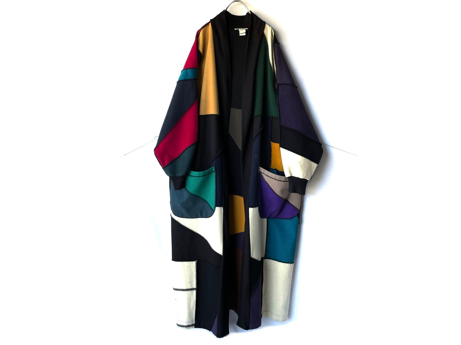 カラフルで質の良いウールフェルトが継ぎ合わされた、羽織りスタイルのパッチワークコート。