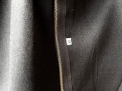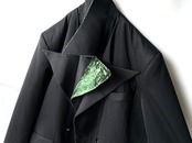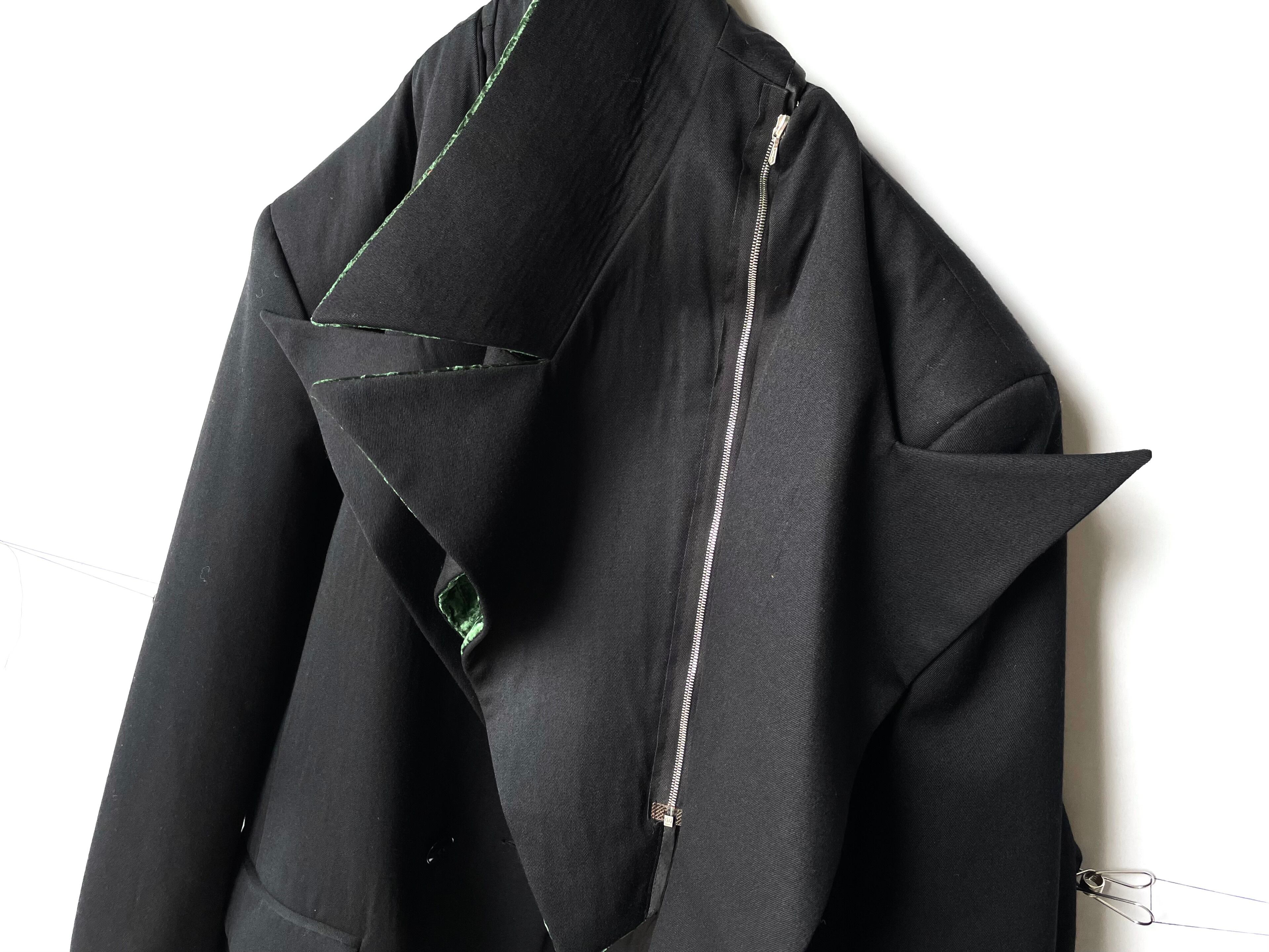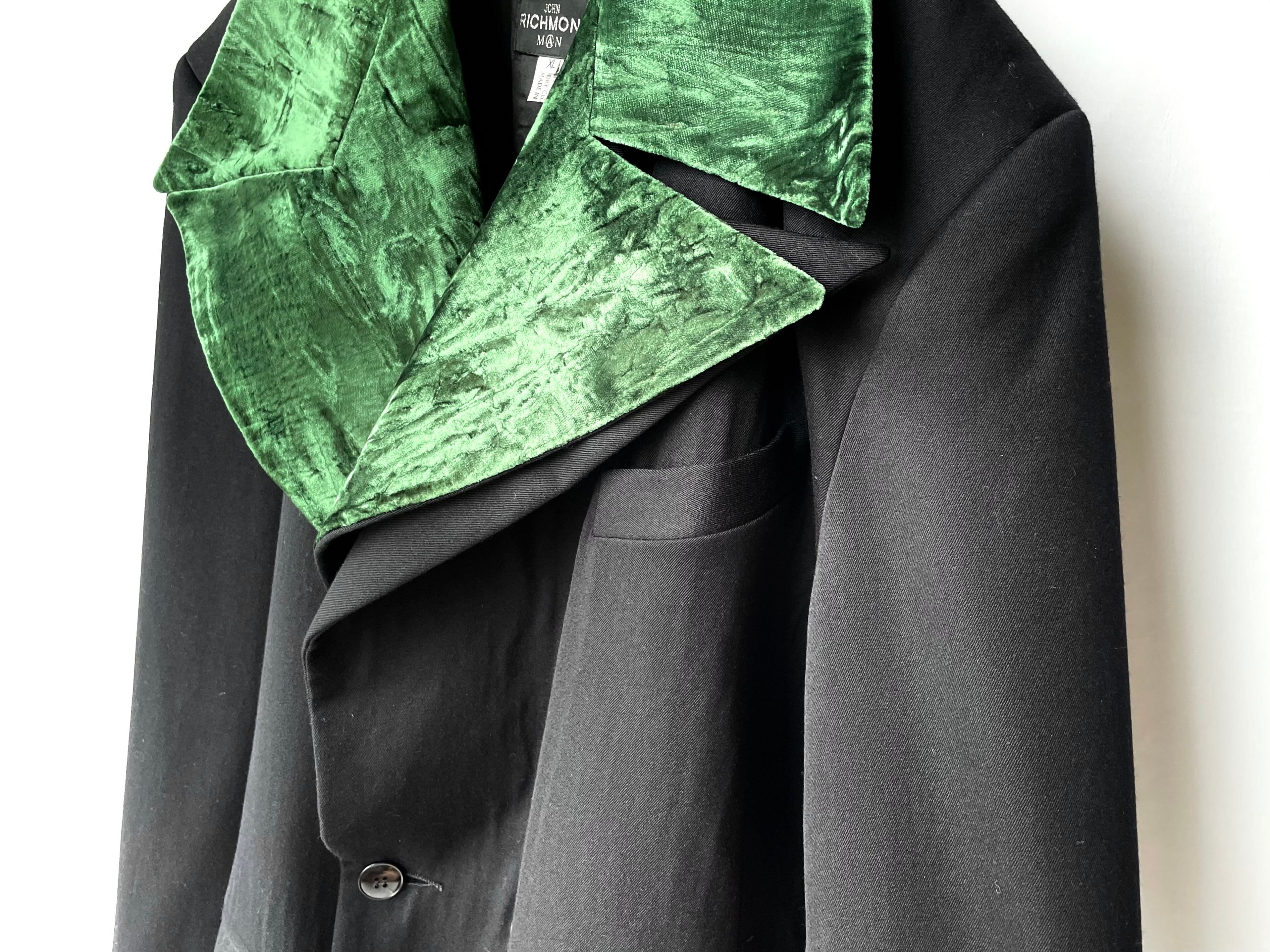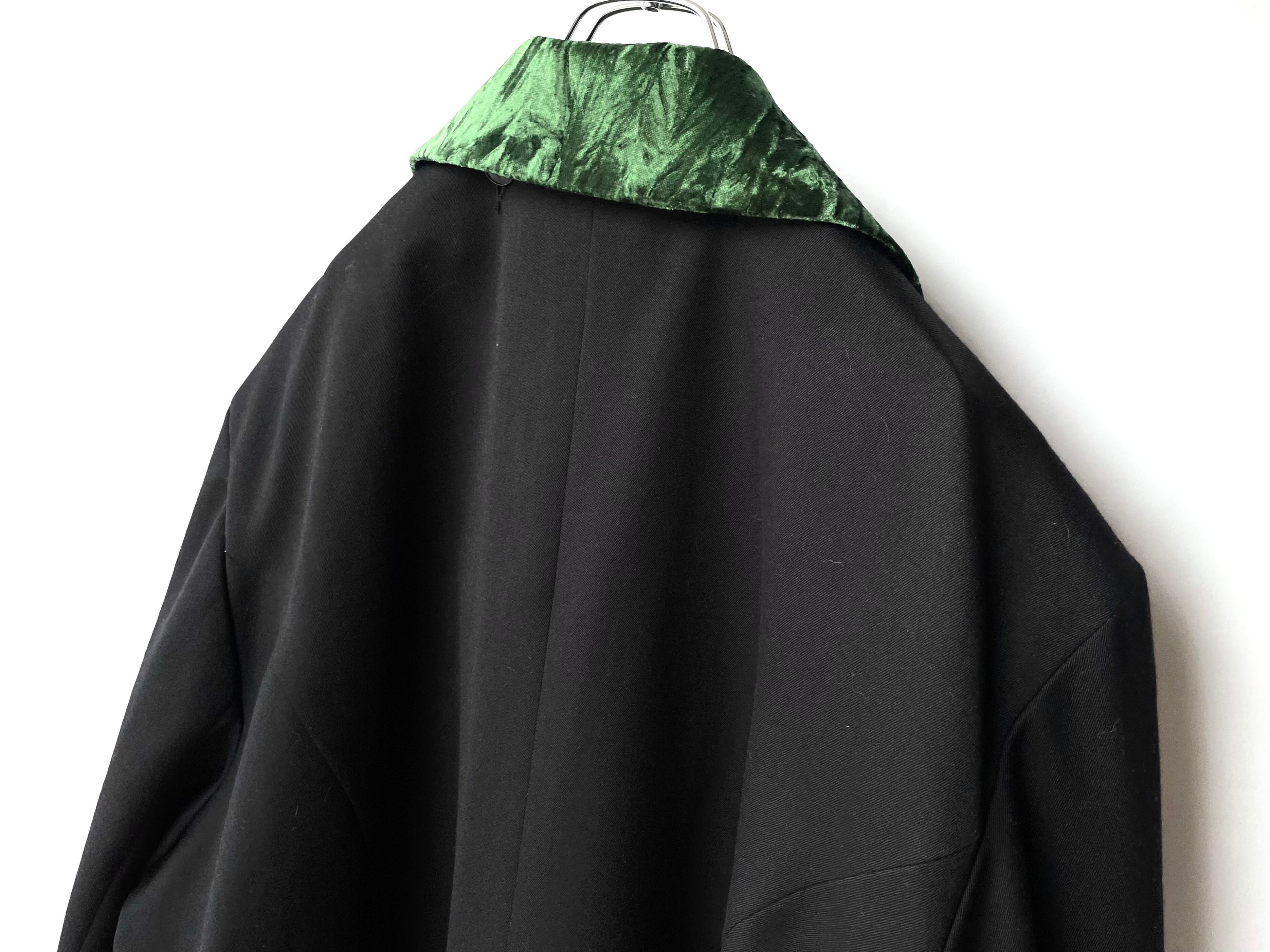 The thick wool body has a full black color, and the large lapel with a removable button/zip is made of glossy green velor fabric.