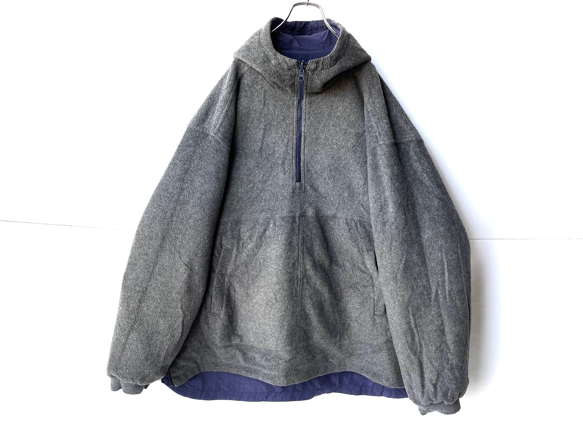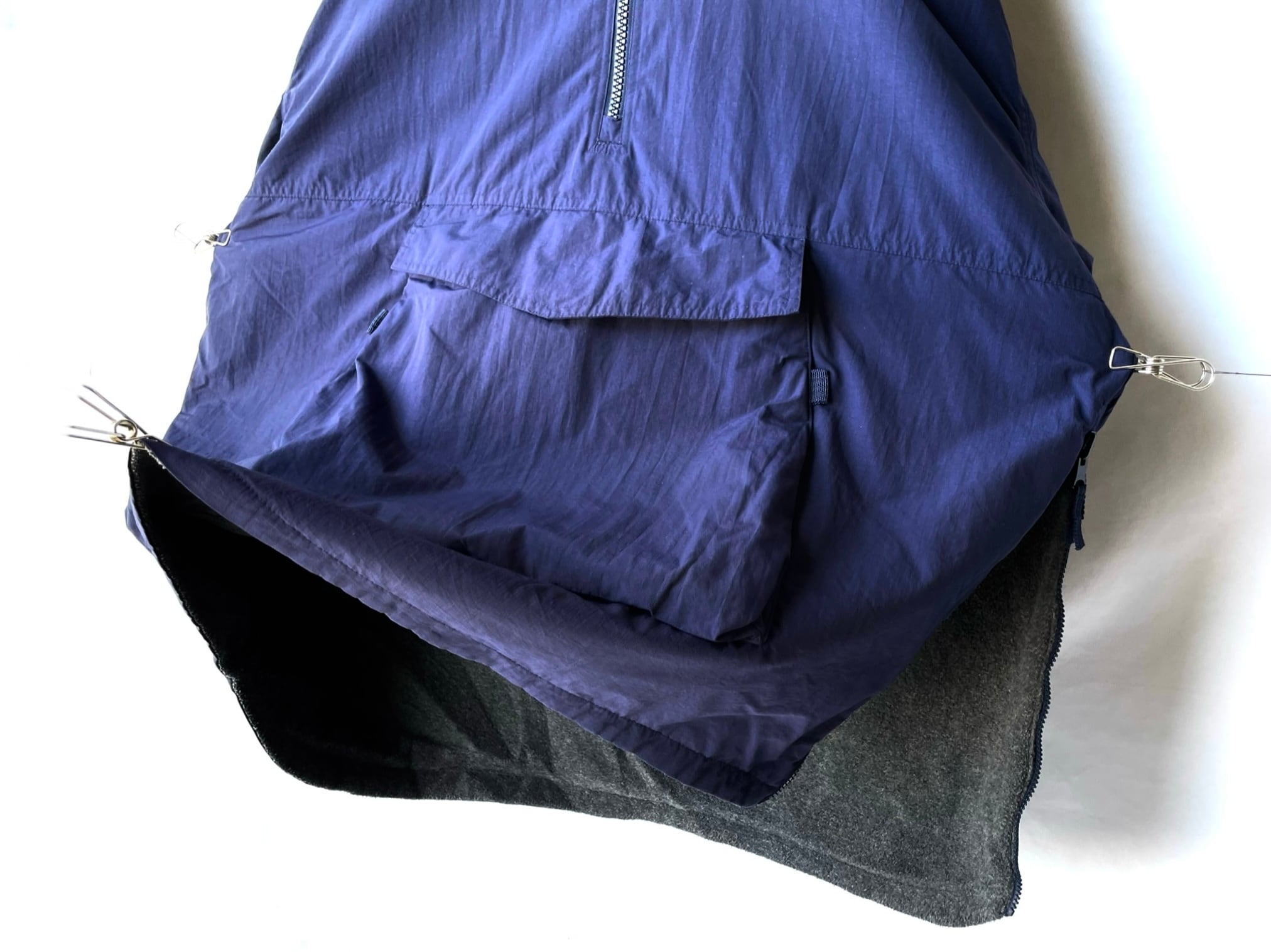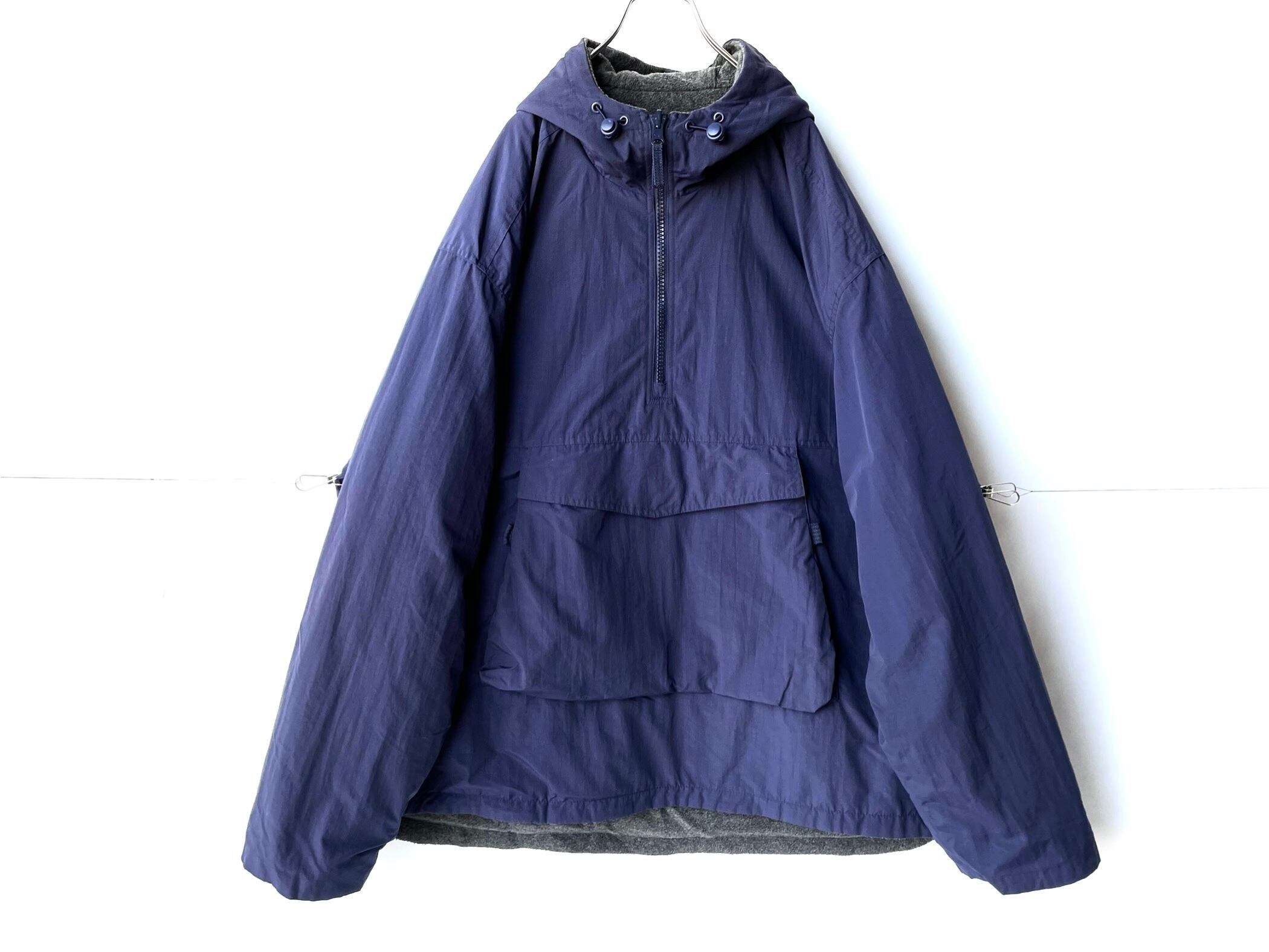 高密度なネイビーナイロン×肉厚なフリースボディが使用された、ハーフジップのリバーシブルフーディ。