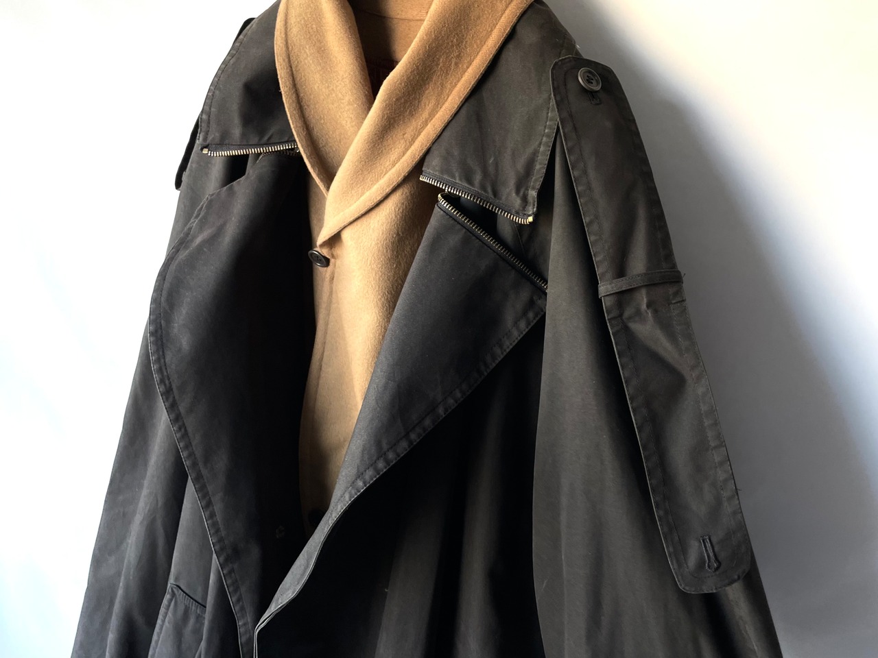 The shell has a zipper on the lapel, and the lining has a unique button arrangement that allows for various modifications.
