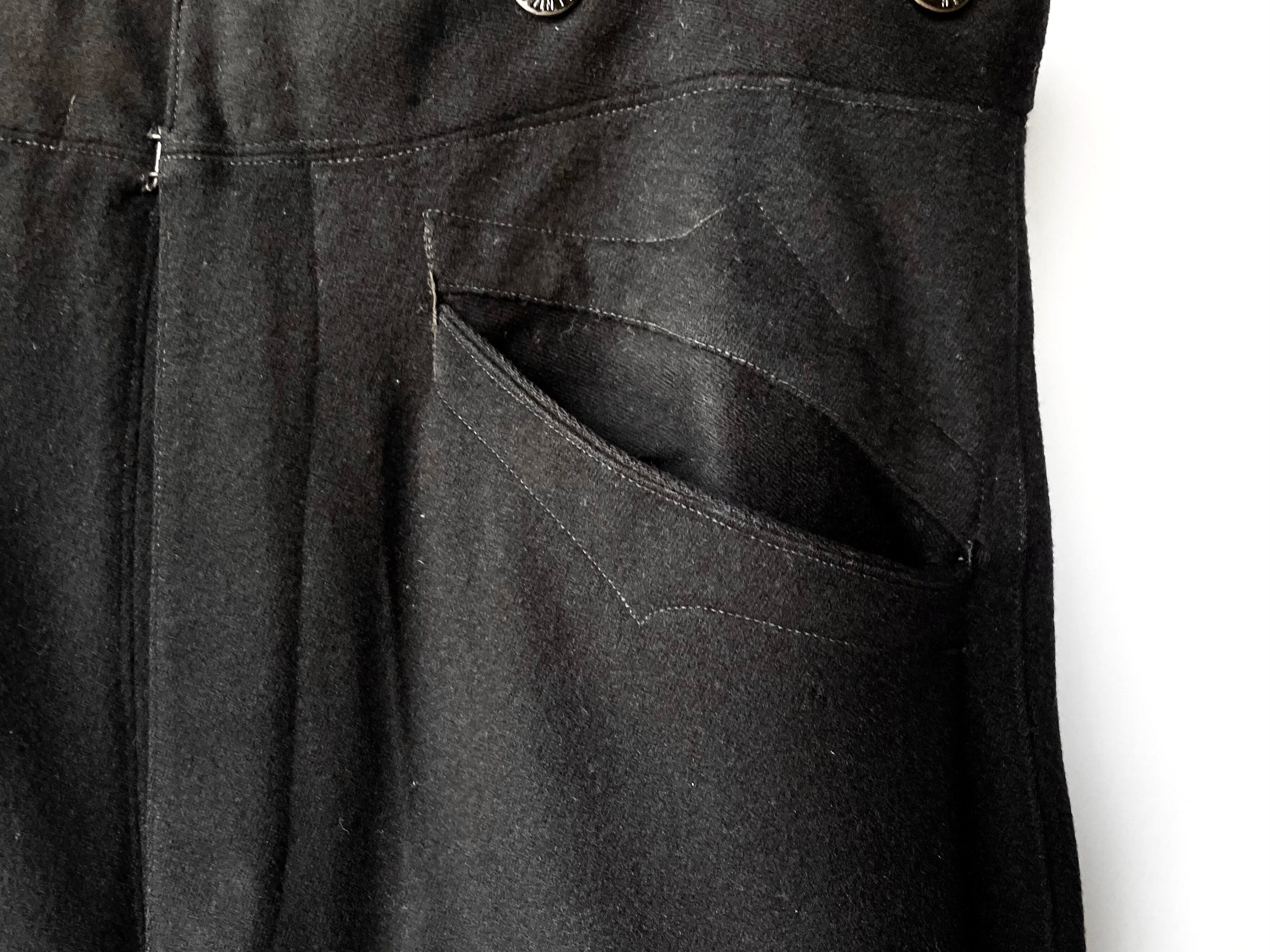 ボトムスはボタンフライ、ステッチ装飾が乗ったスリットポケット。