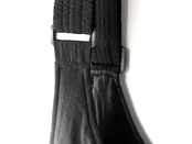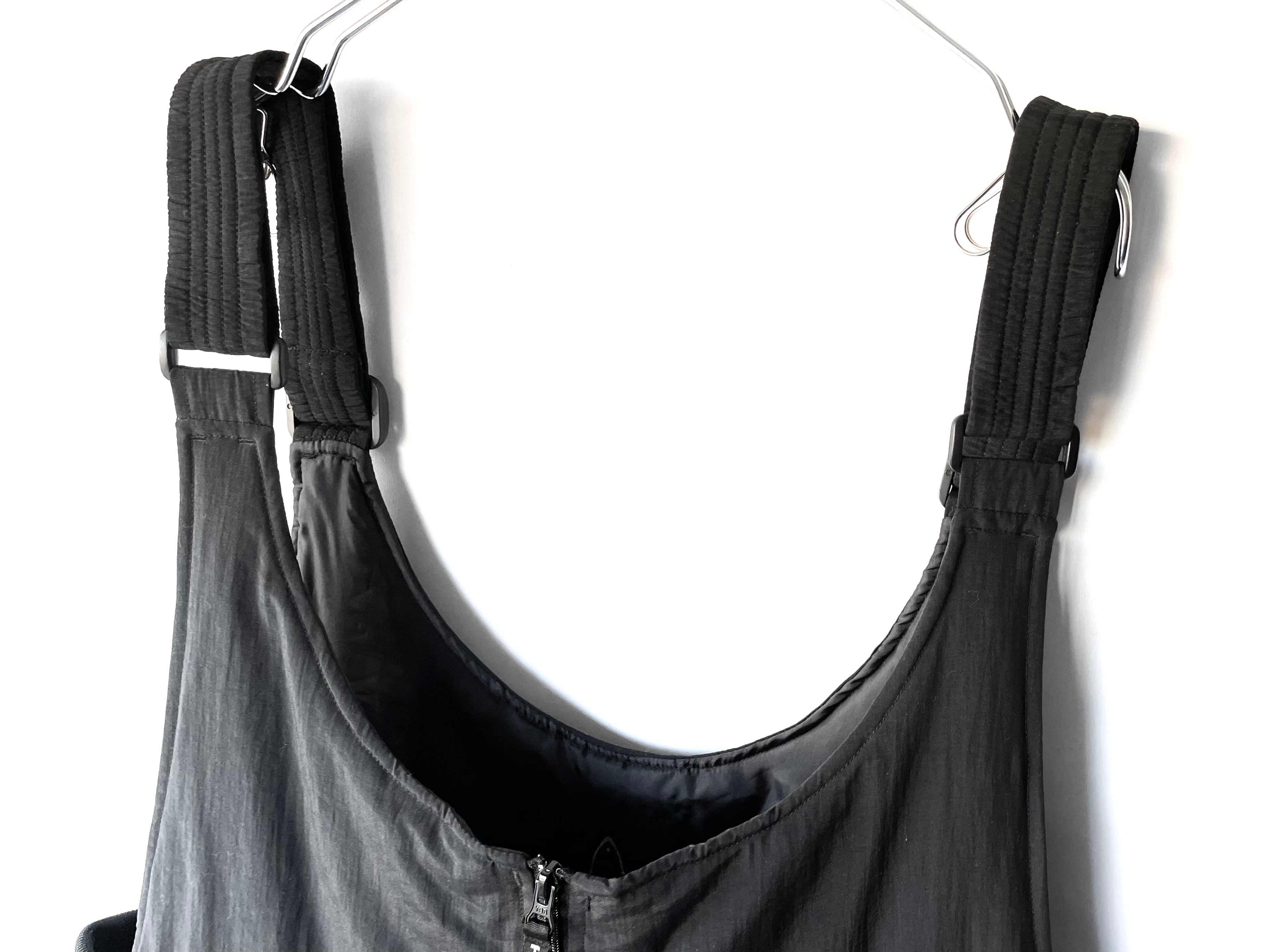 腹部から割れるフロントジッパー、脇腹のリブ切り替えと背面の玉縁ジップポケット。