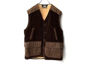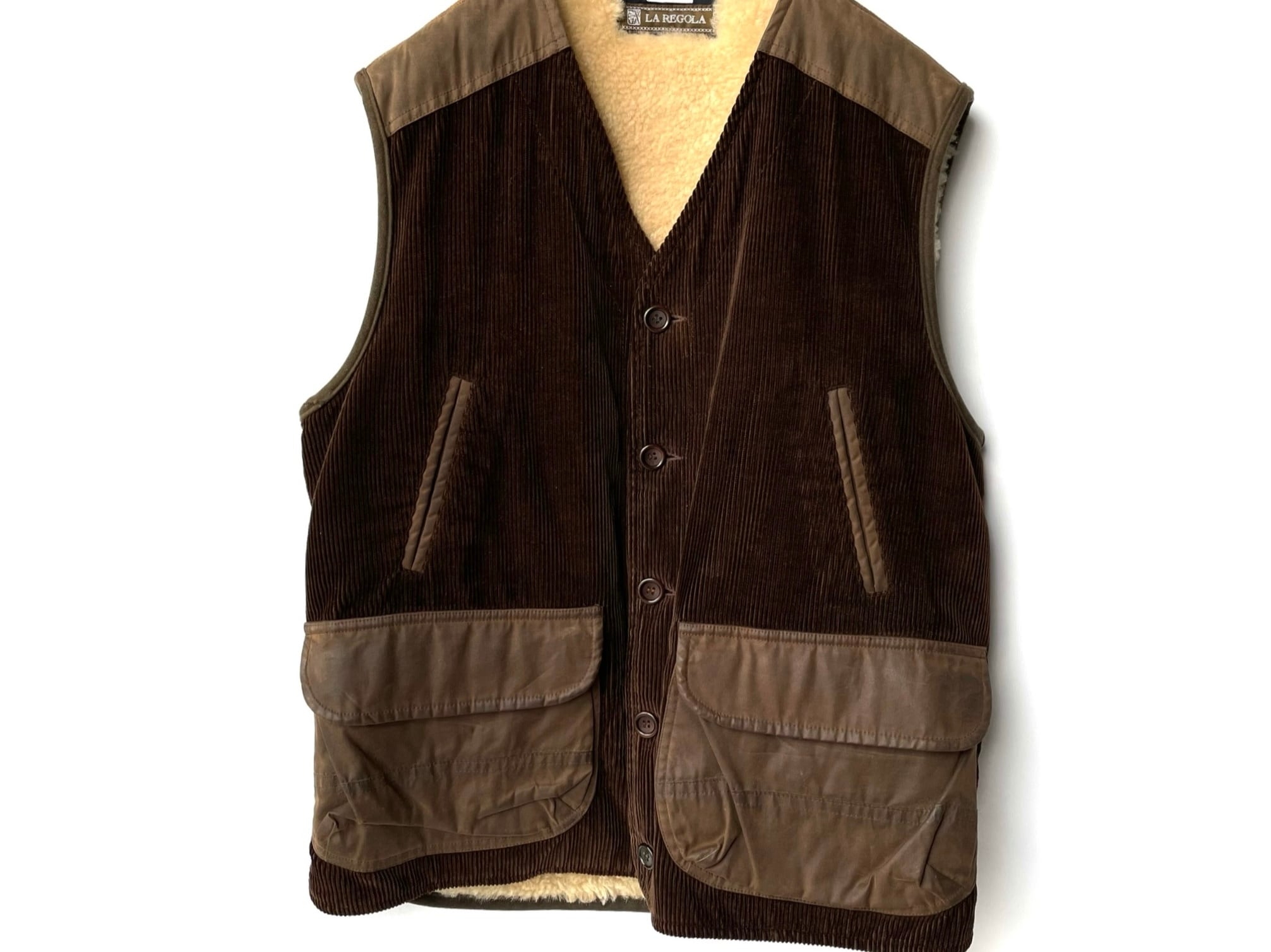 A combination of four different materials: thick shearling leather, brown corduroy, waxed cotton, and wool lining.