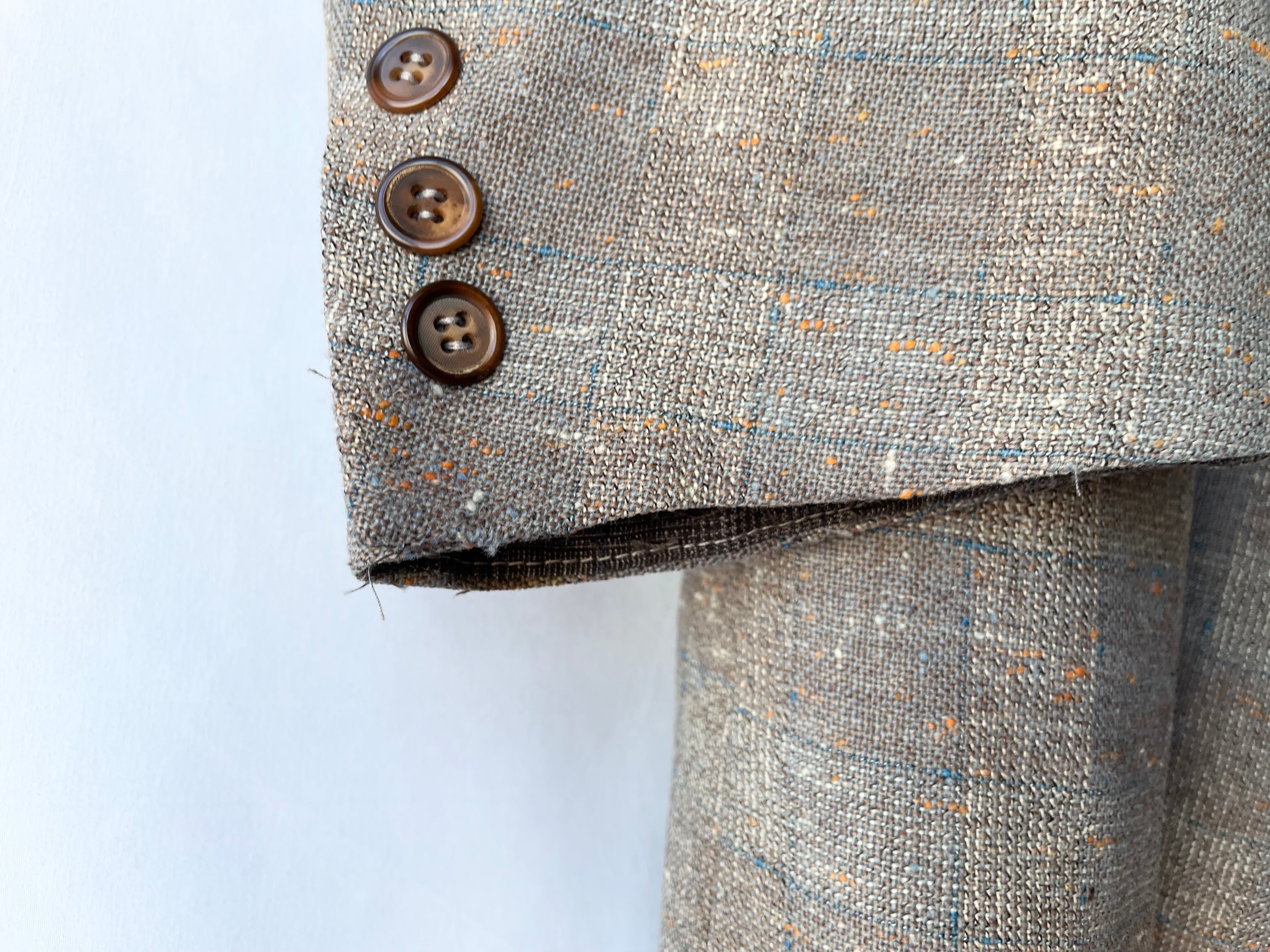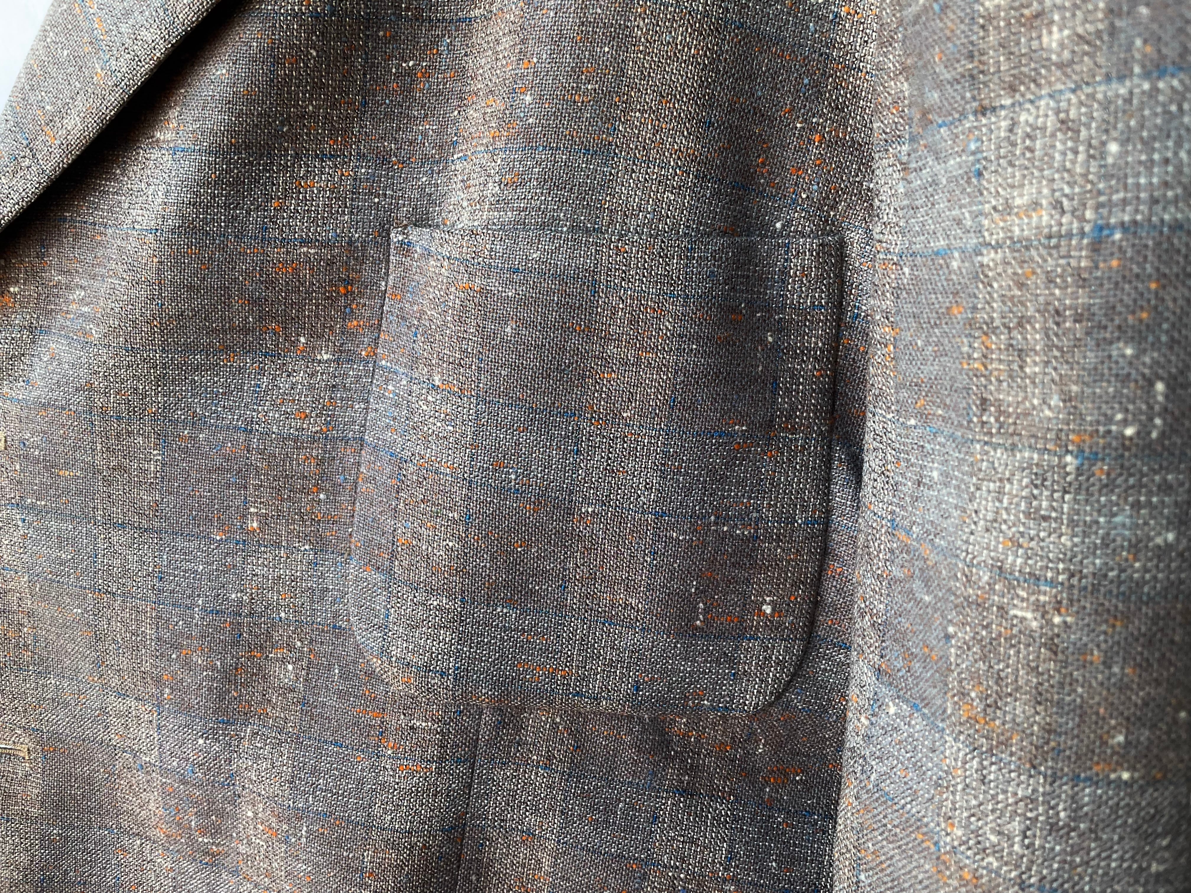淡いグレージュベースに鮮やかなオレンジ/ライトブルーのネップが飛んだ、素晴らしい配色のウールボディ。