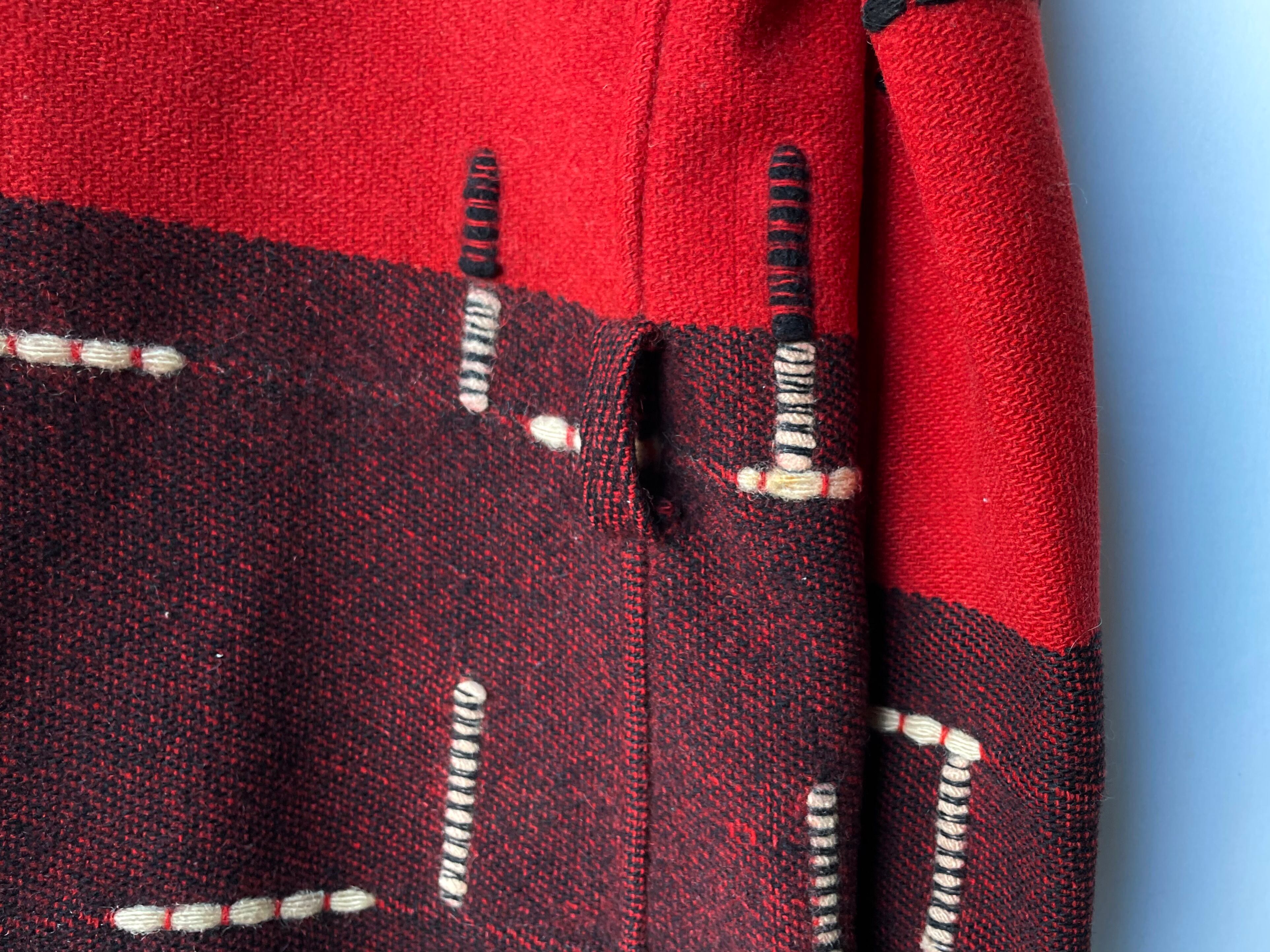 The thick wool body is densely woven with red, black, and ivory threads that reveal bundles of yarn in all directions and are then tightened from above.