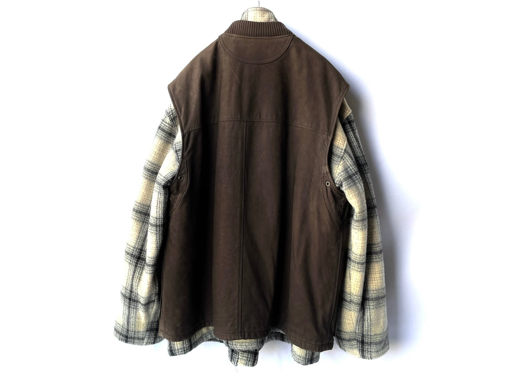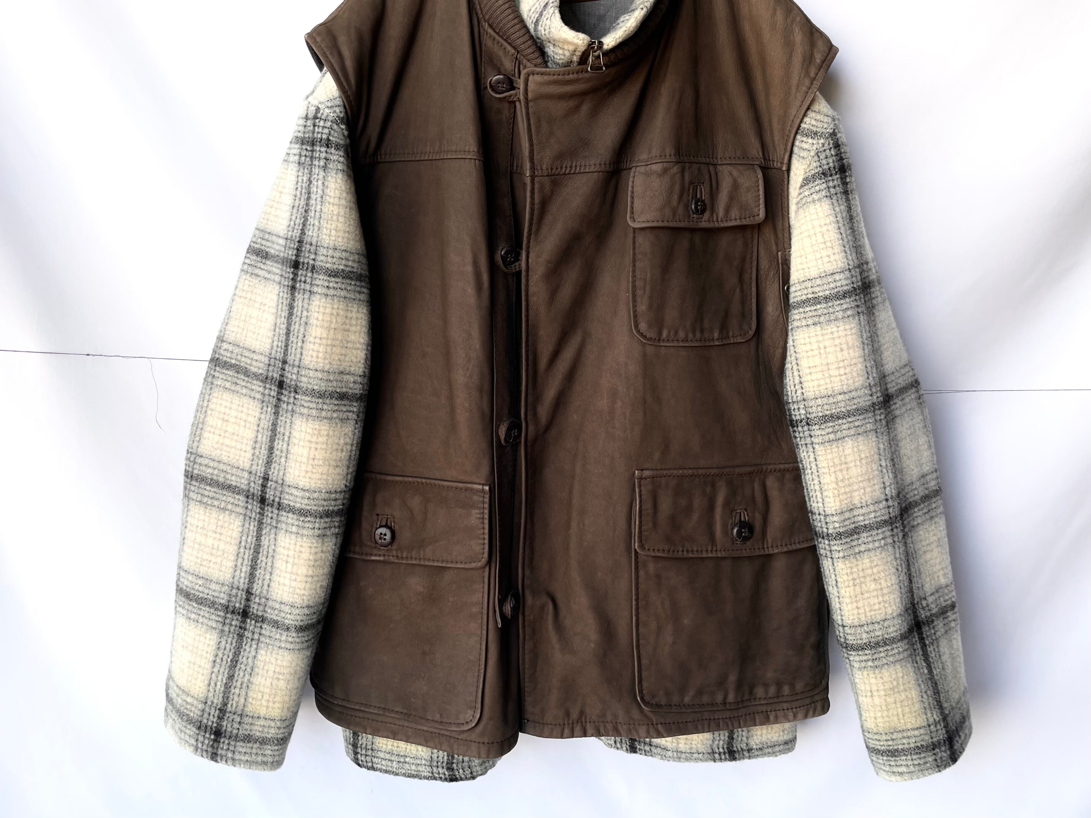 A wonderful 2-piece consisting of a khaki brown colored leather vest and a fleece wool jacket with quilted lining.