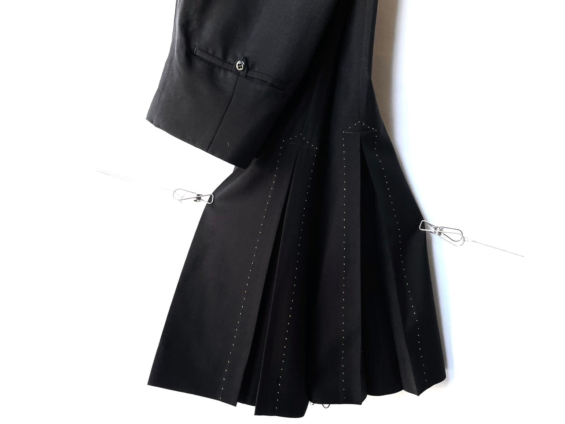 Side pleats with a large amount of fabric edged with beige hand stitching.