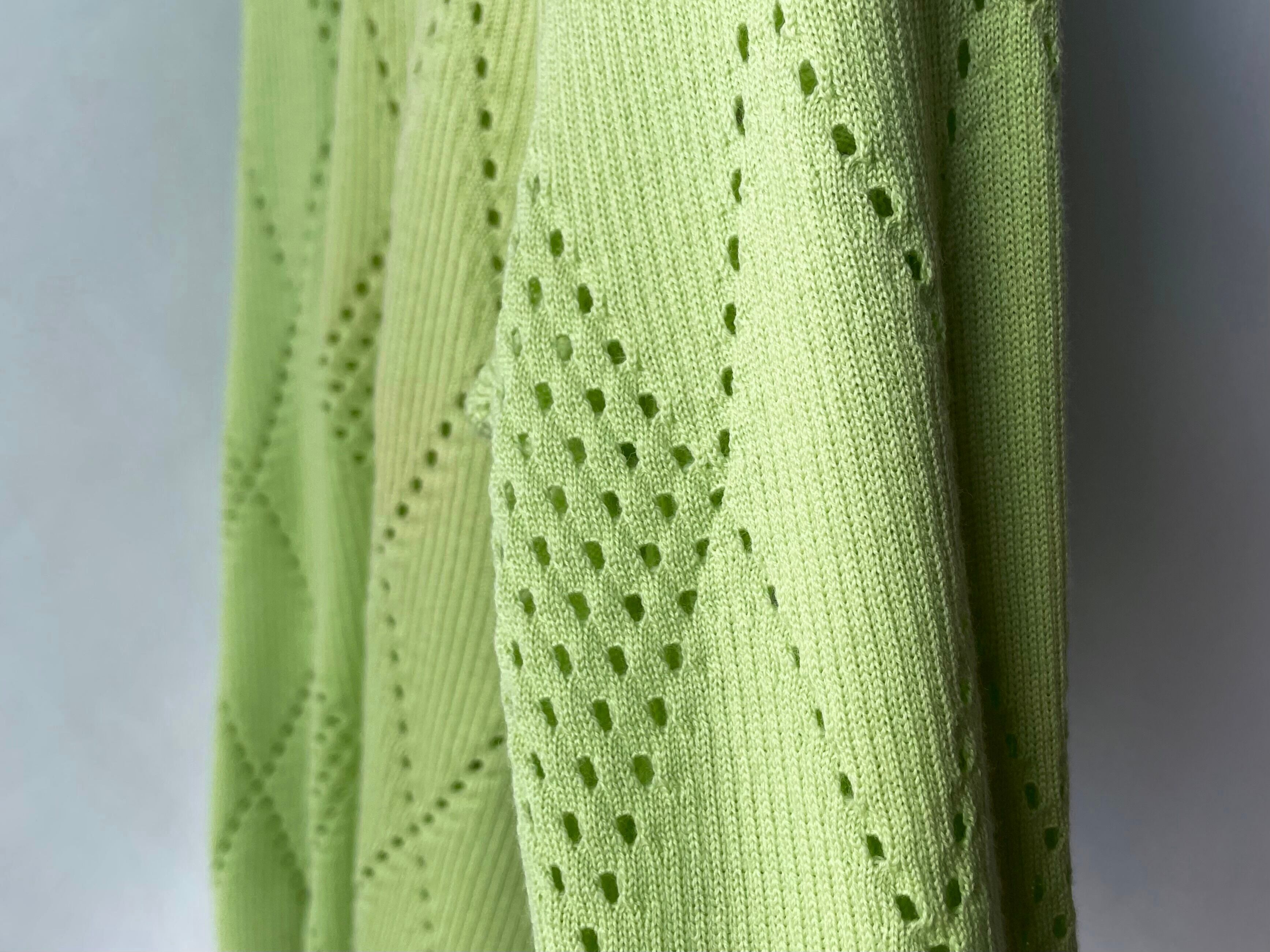 It is extremely elaborately made, with holes cut through the knitted fabric with fine irregularities.