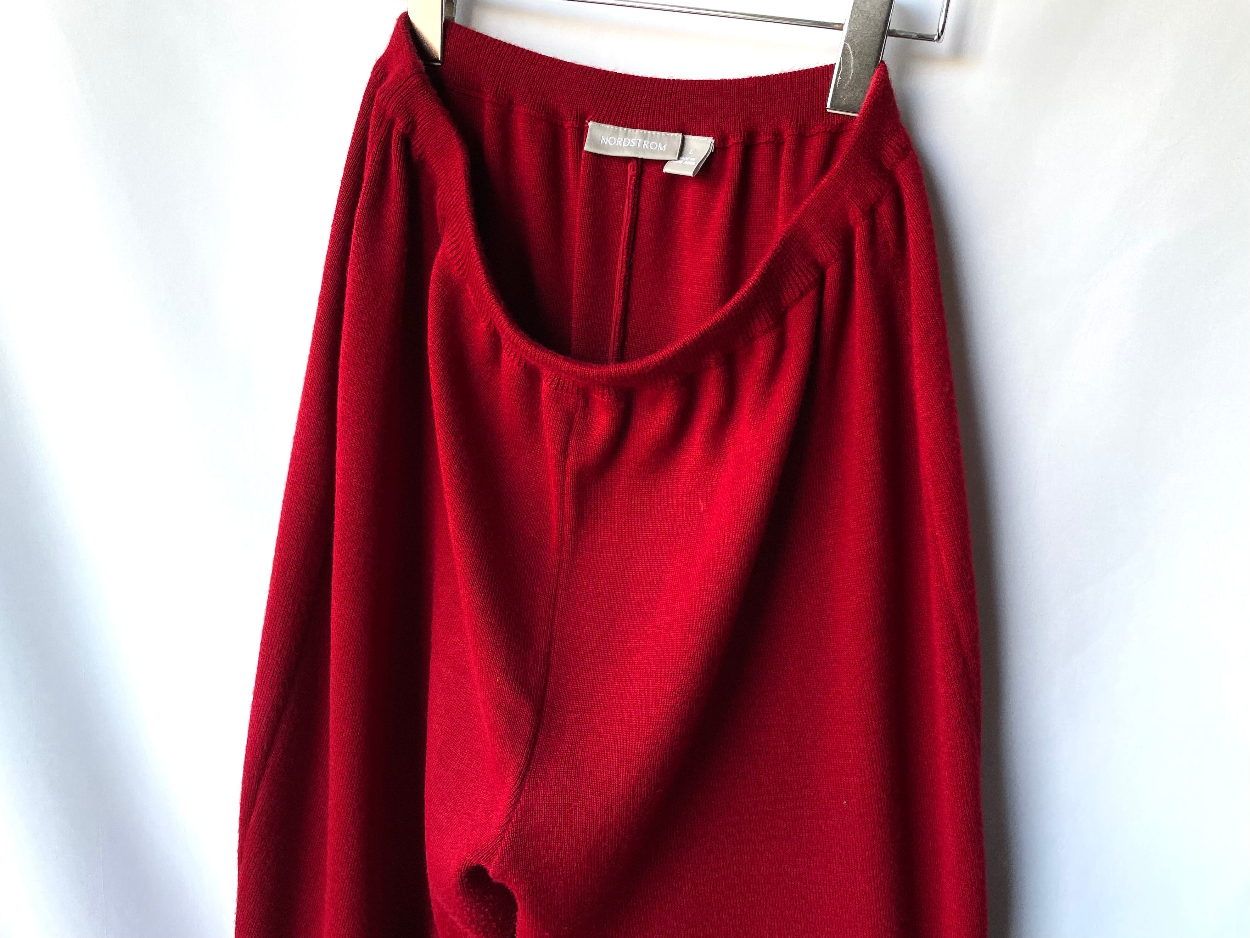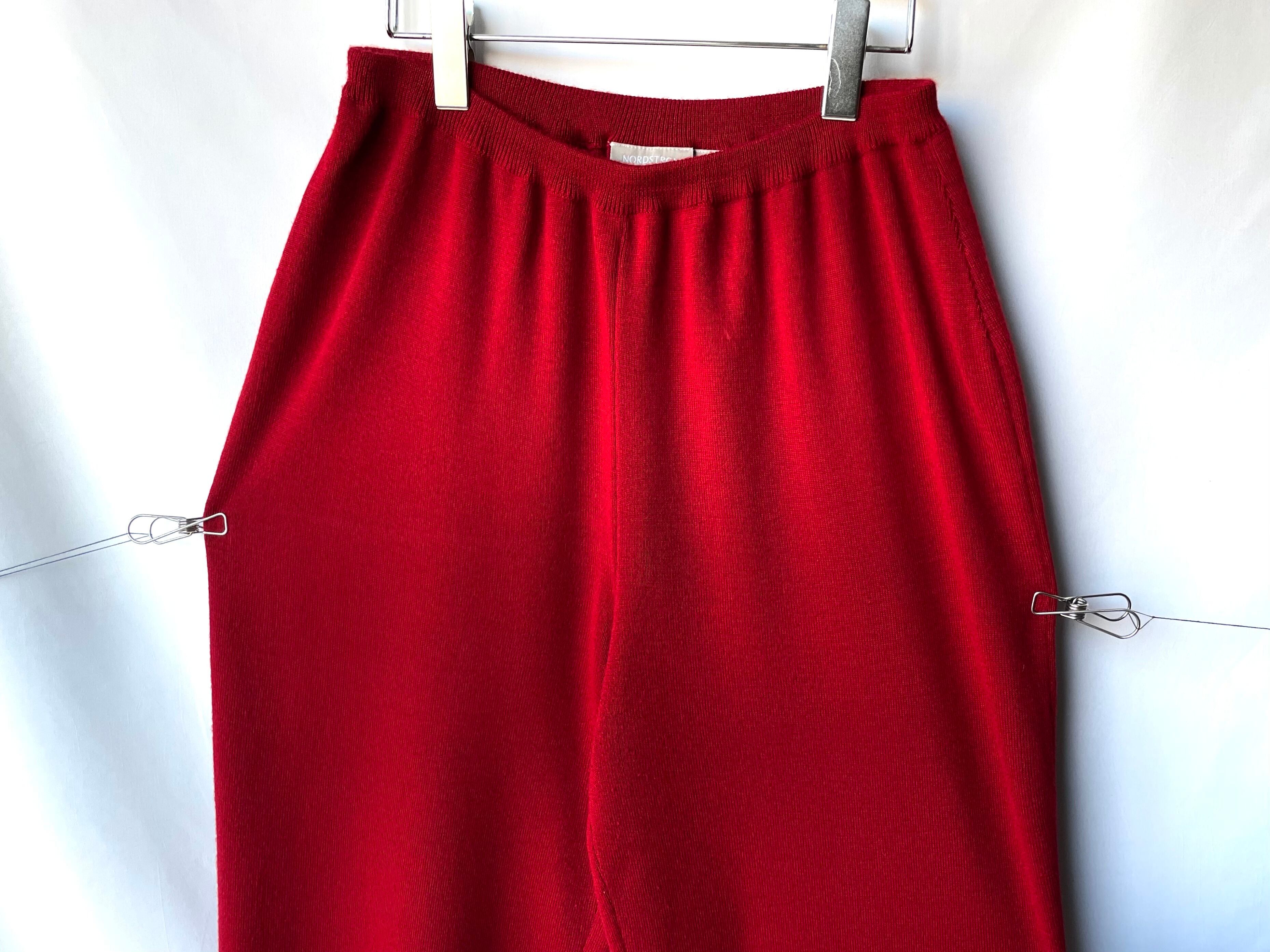 リブ無し、ワイドテーパードシルエットのニットパンツ。