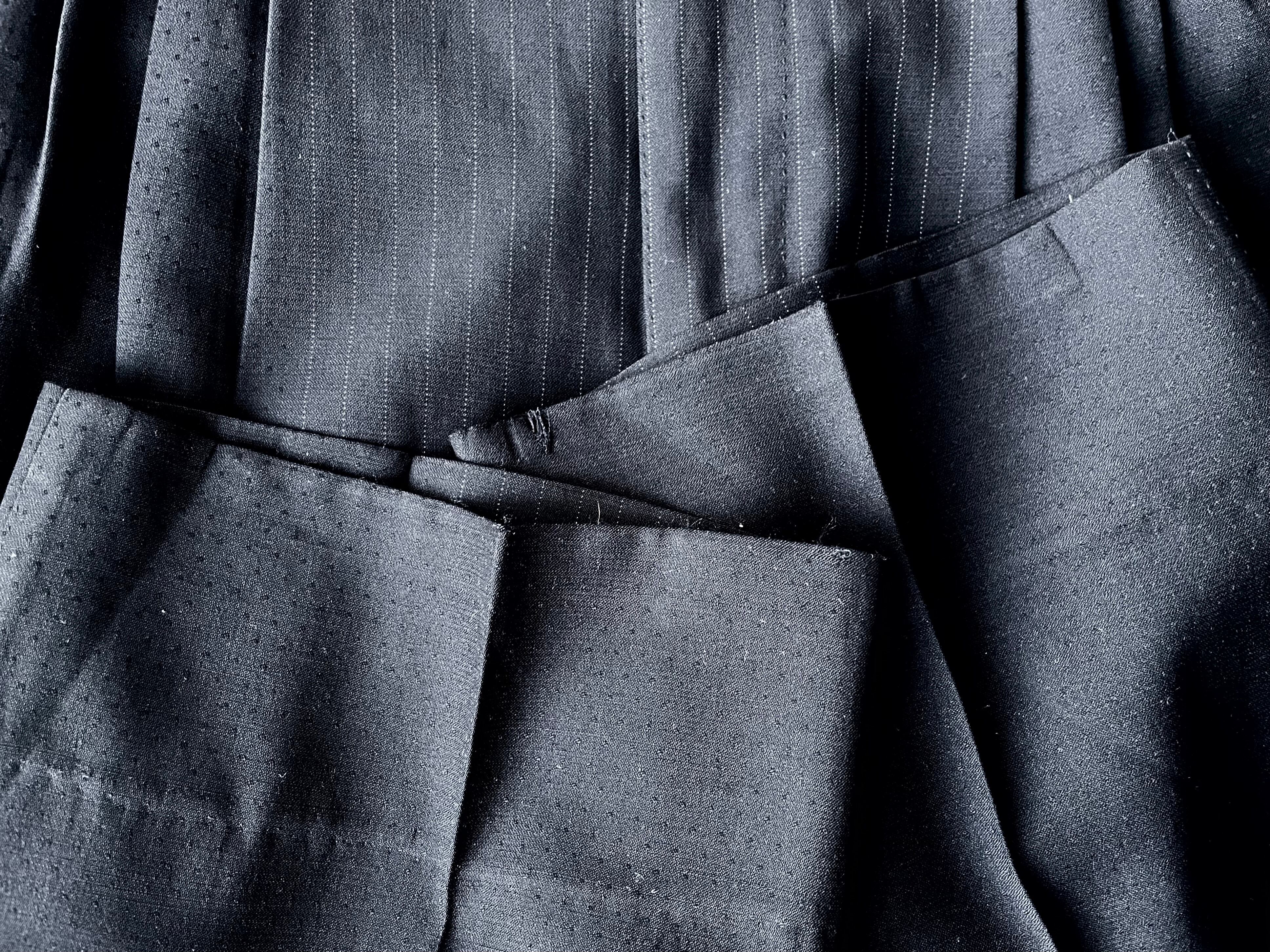 艶のあるドットが浮かぶ静かな織柄生地に、細かなステッチによる縦縞が身頃中央に乗せられたユニークな設計。