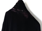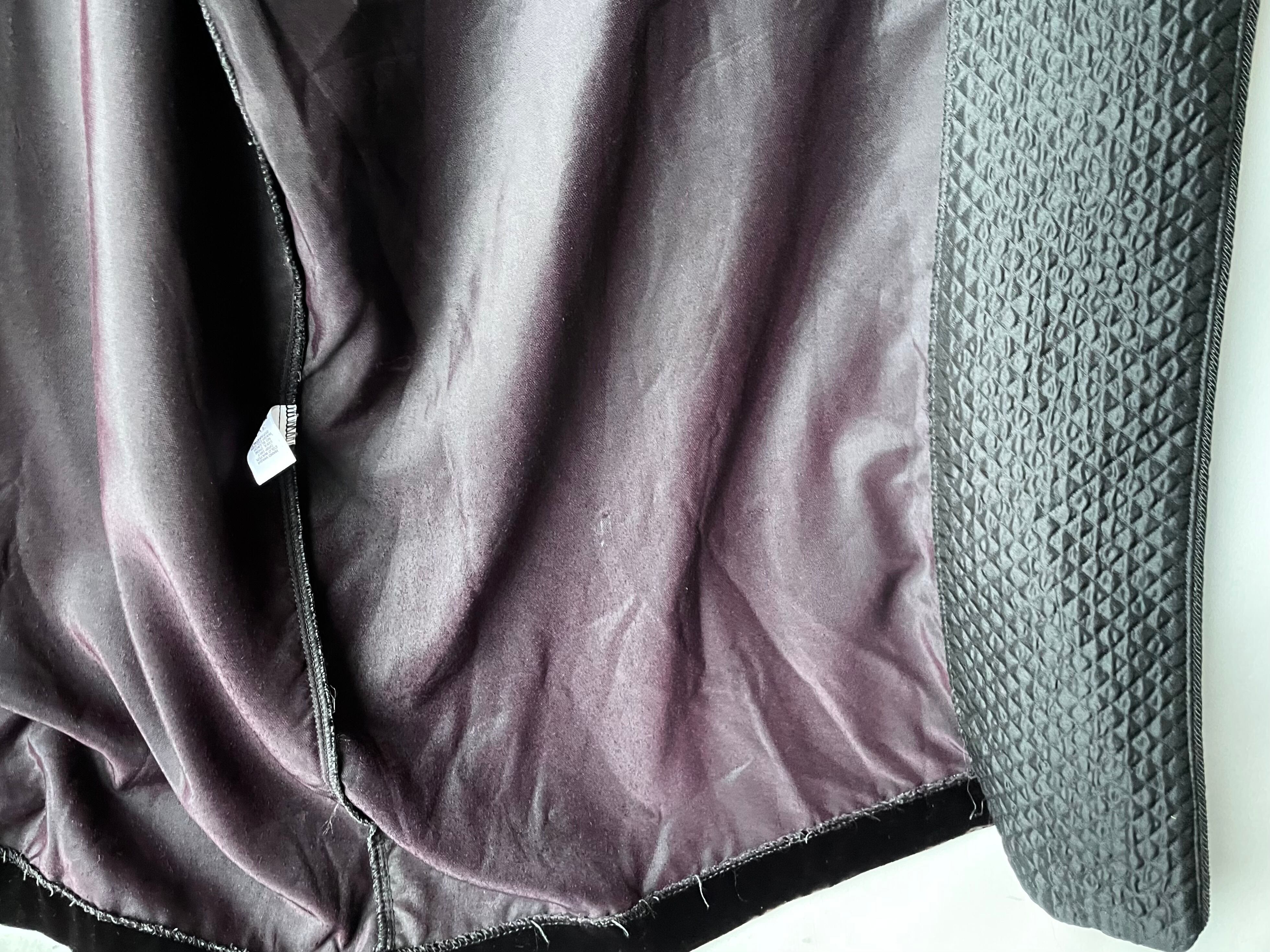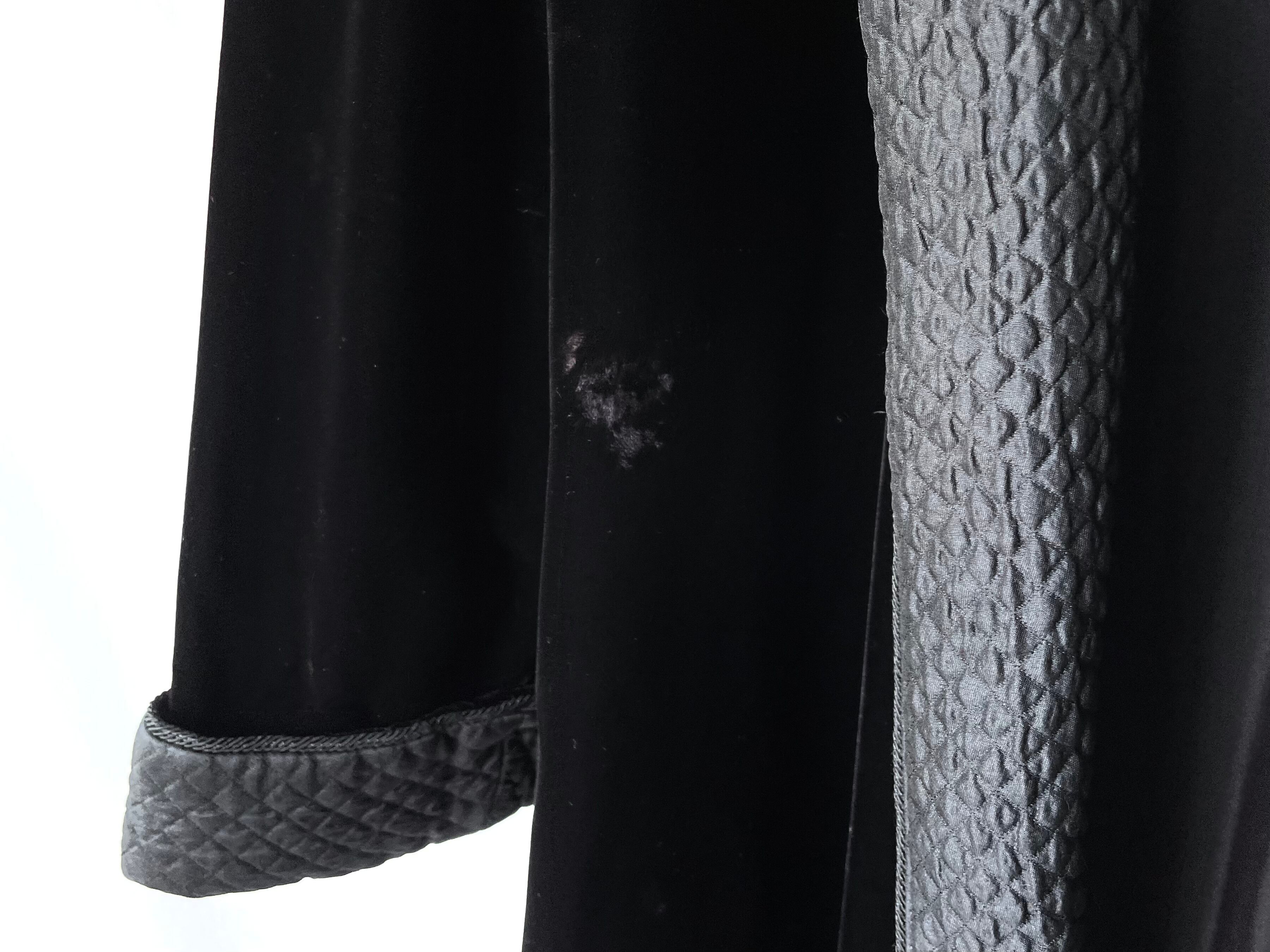 A shawl collar design made of different materials, using high-quality silk/wool quilted fabric on dull glossy acetate/rayon black velor.