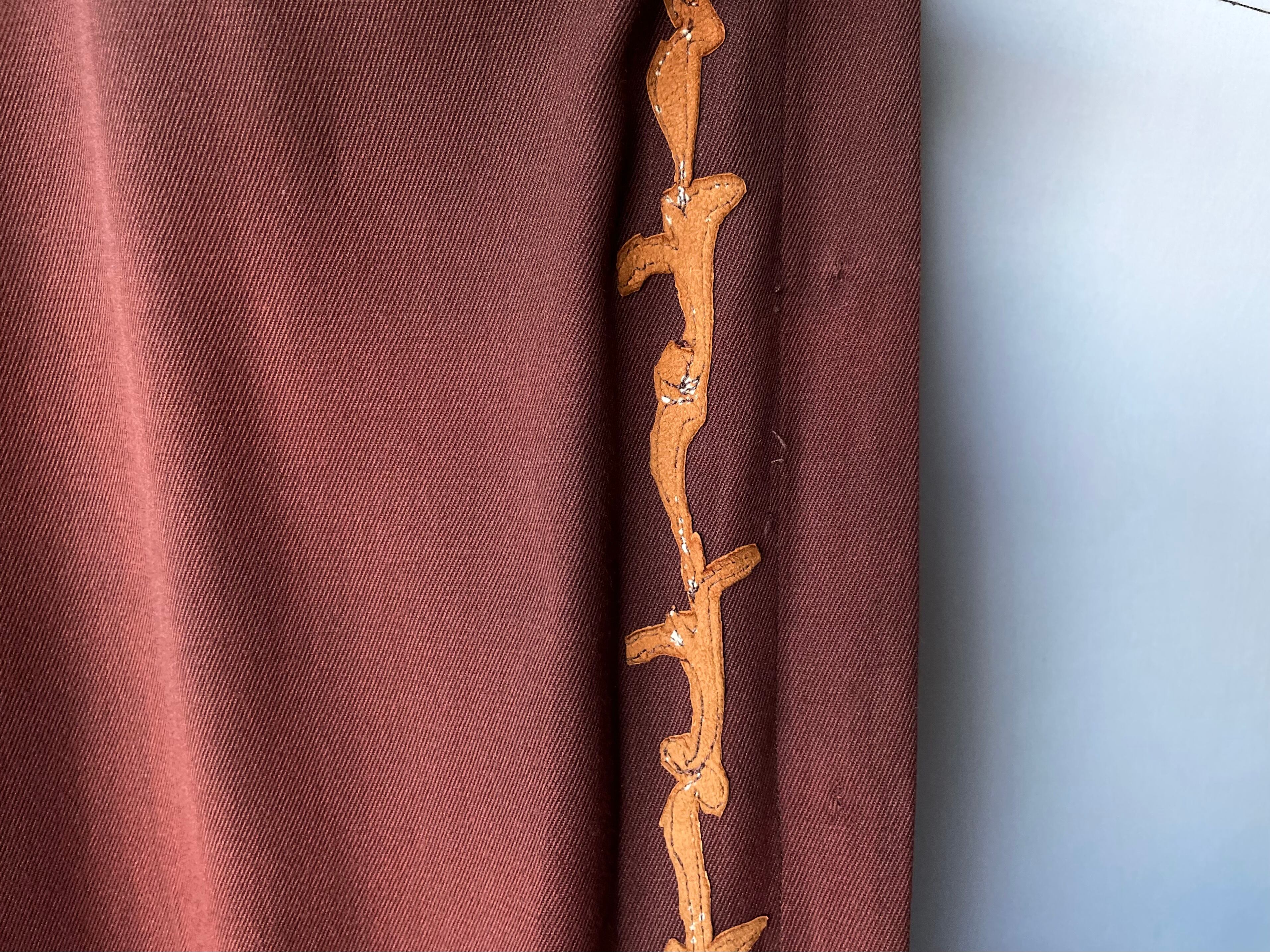 The body decoration is not embroidered, but is made of hand-cut brown leather.