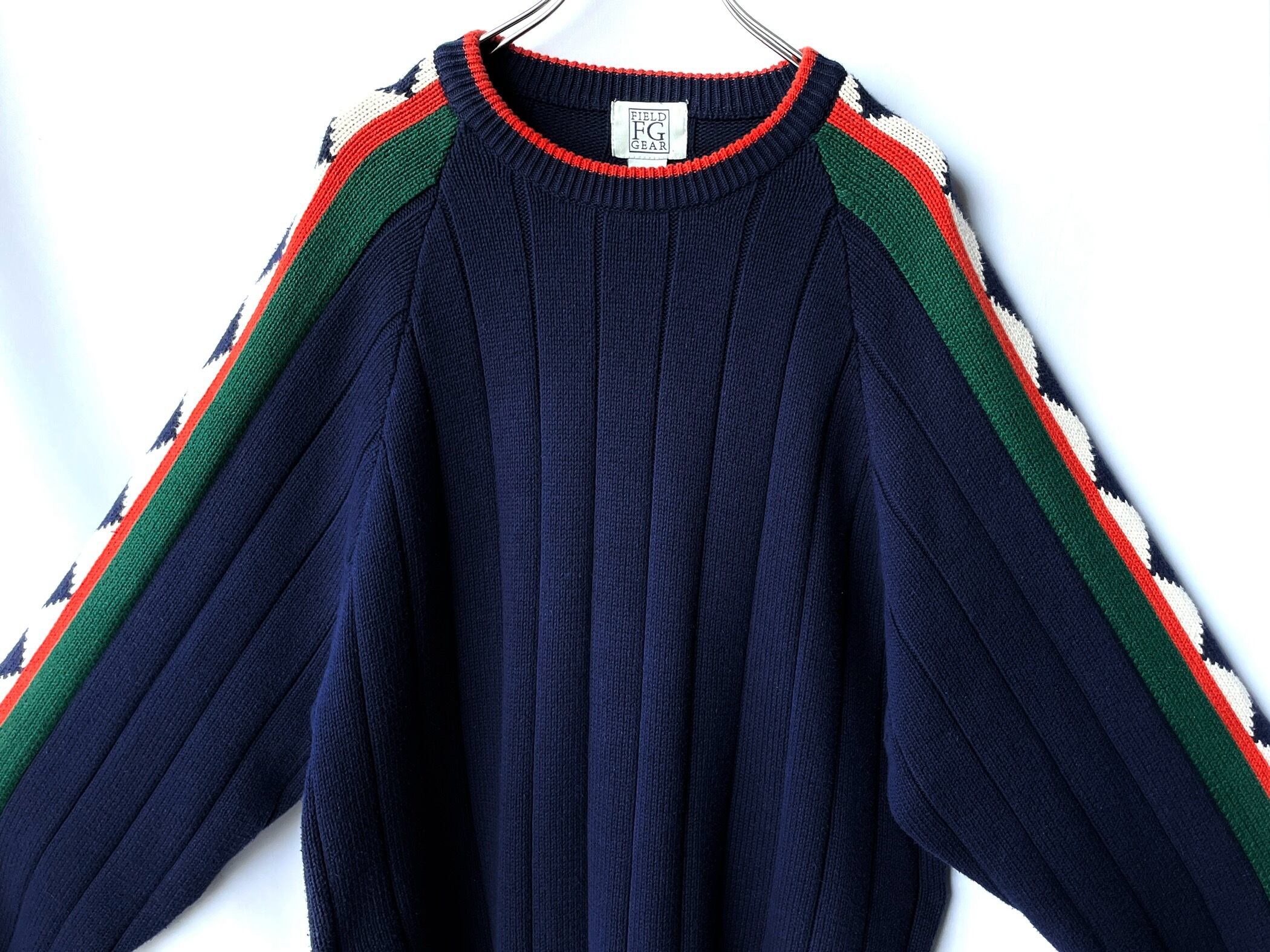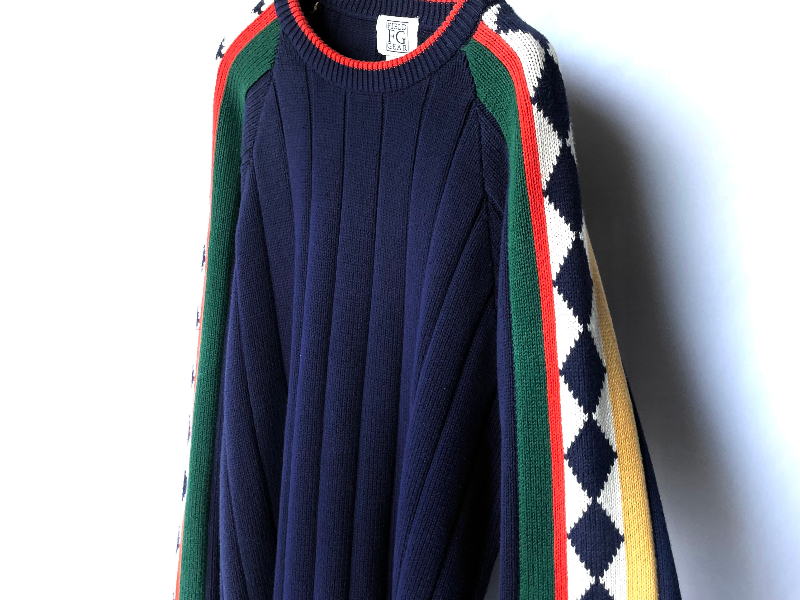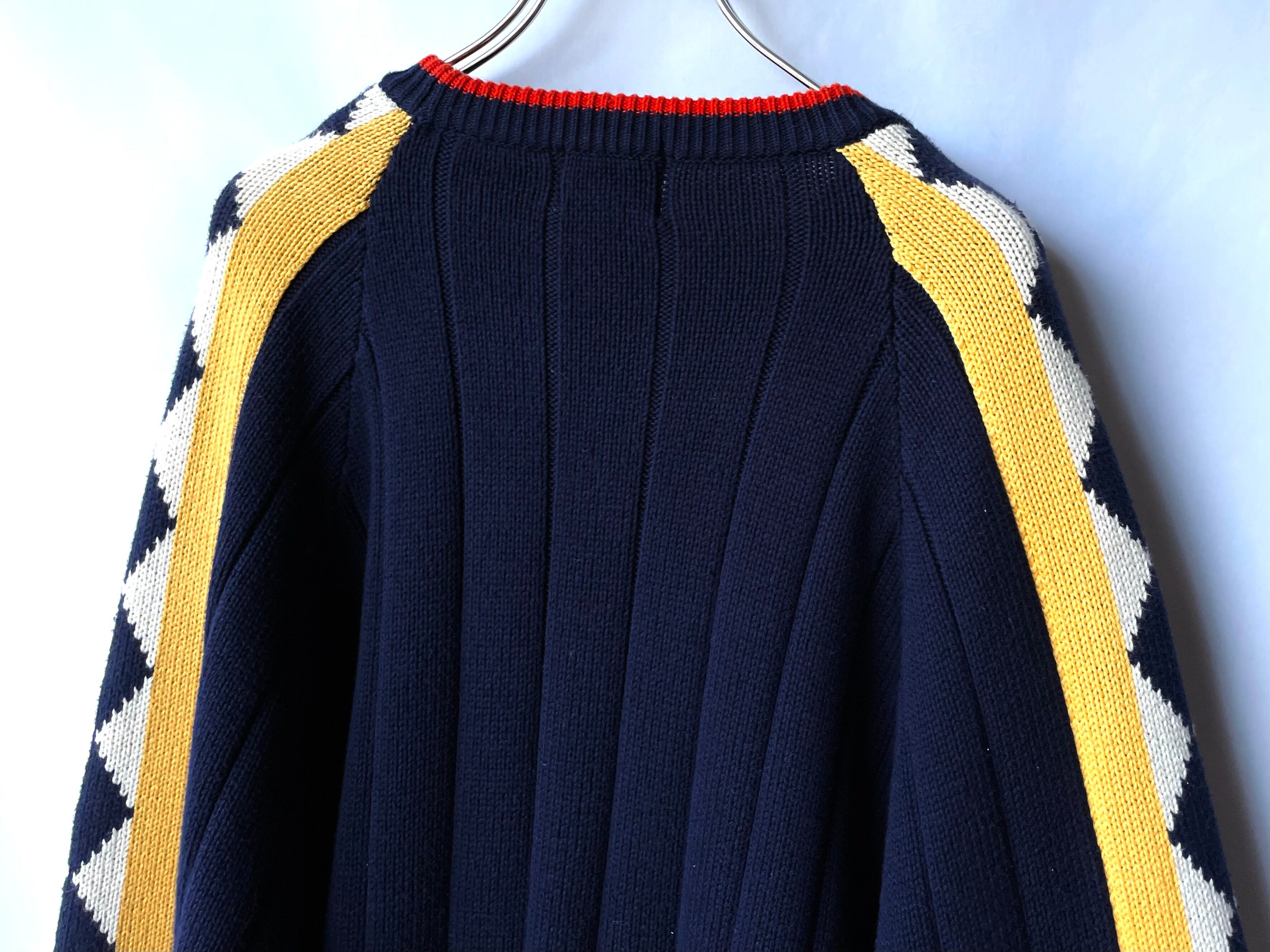 深いネイビーボディに緑/オレンジ/白/ペールイエローのラインが入る、肩線の切り替えデザイン。