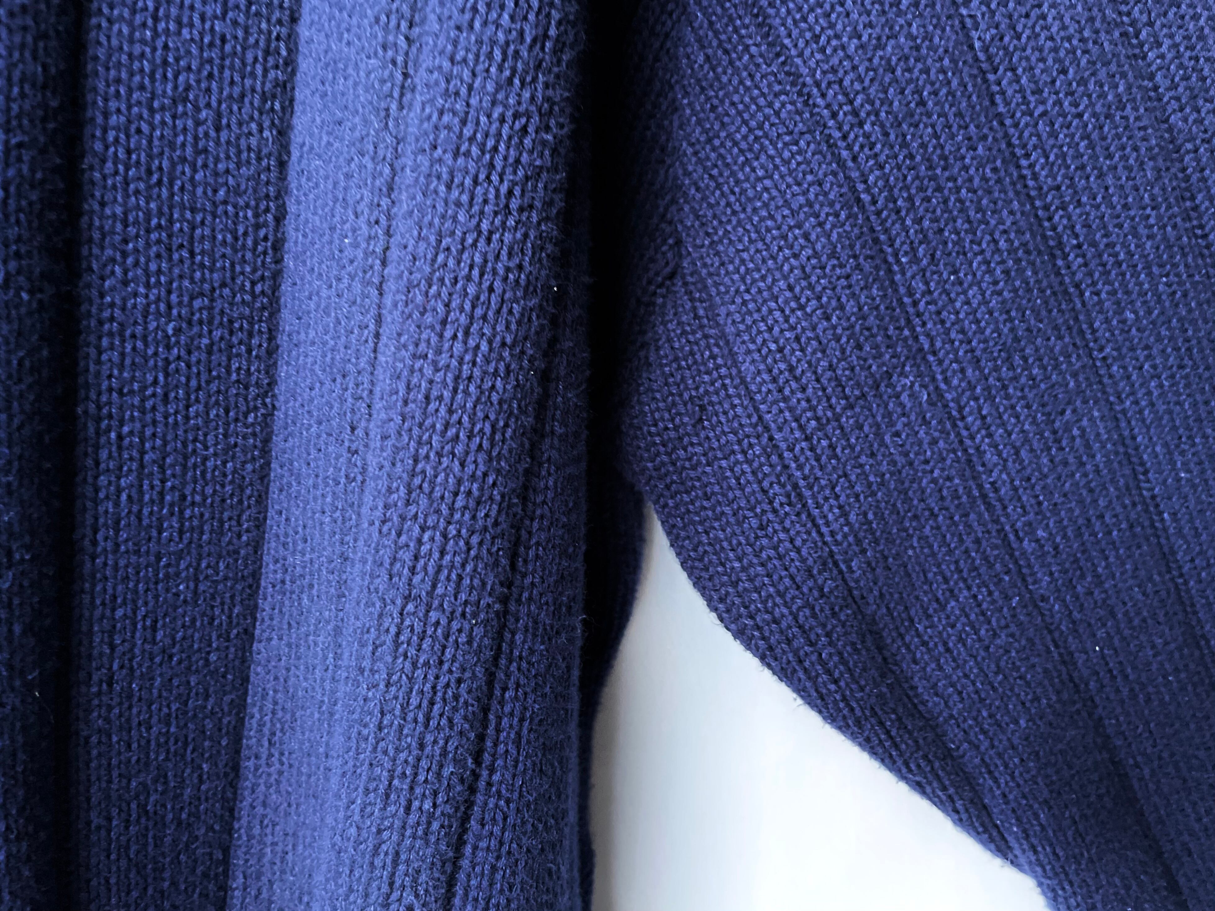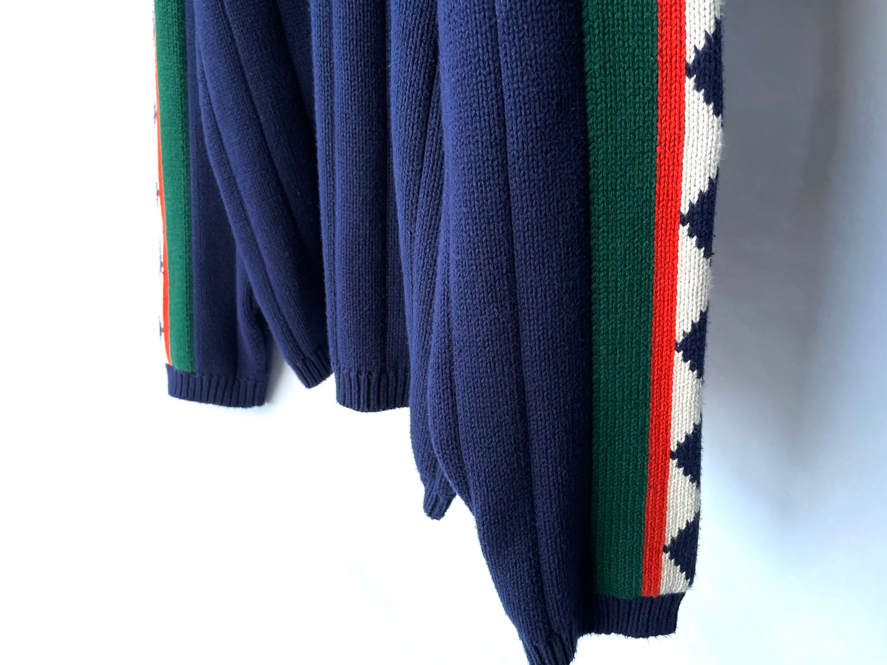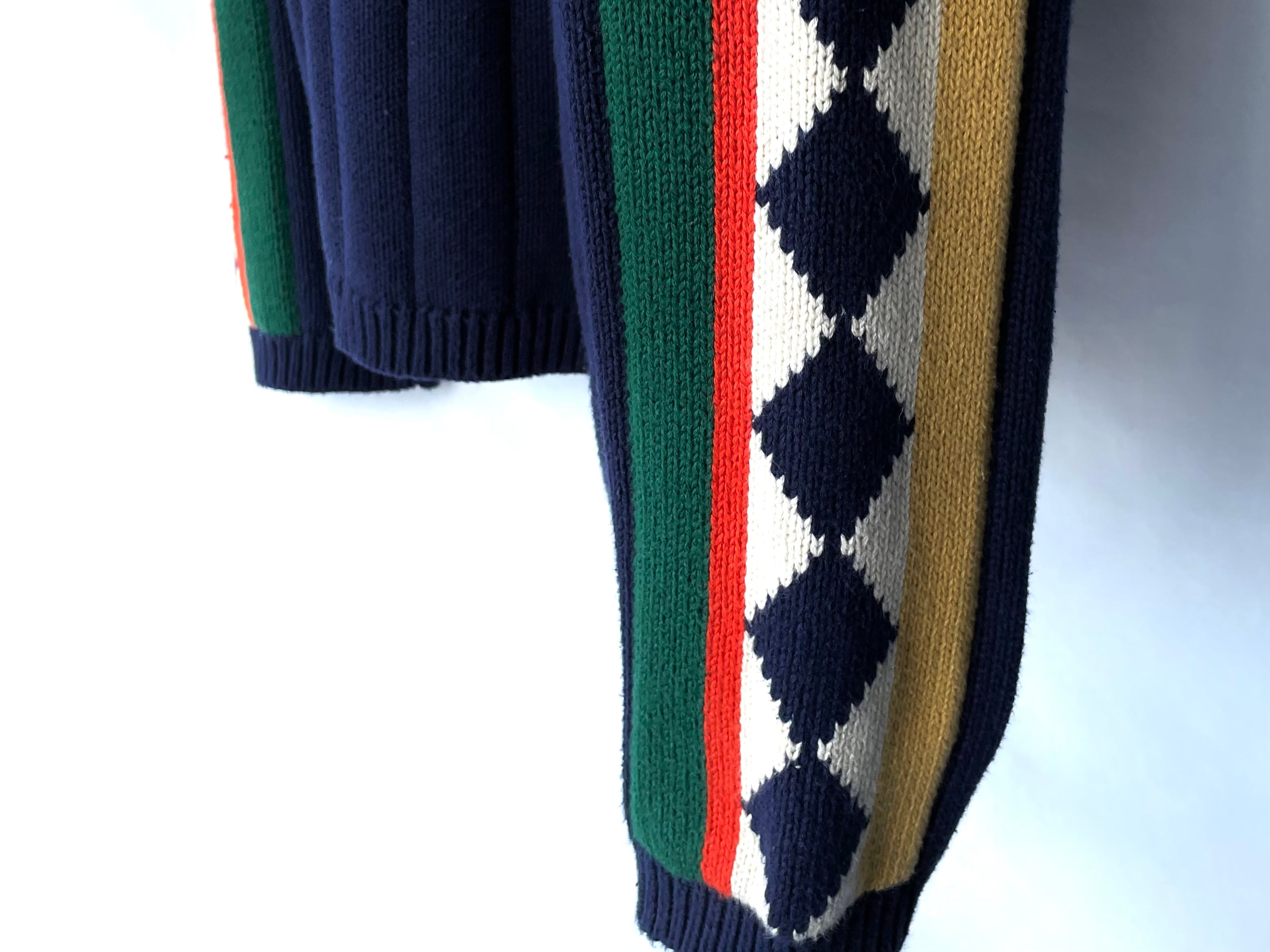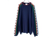 深いネイビーボディに緑/オレンジ/白/ペールイエローのラインが入る、肩線の切り替えデザイン。
