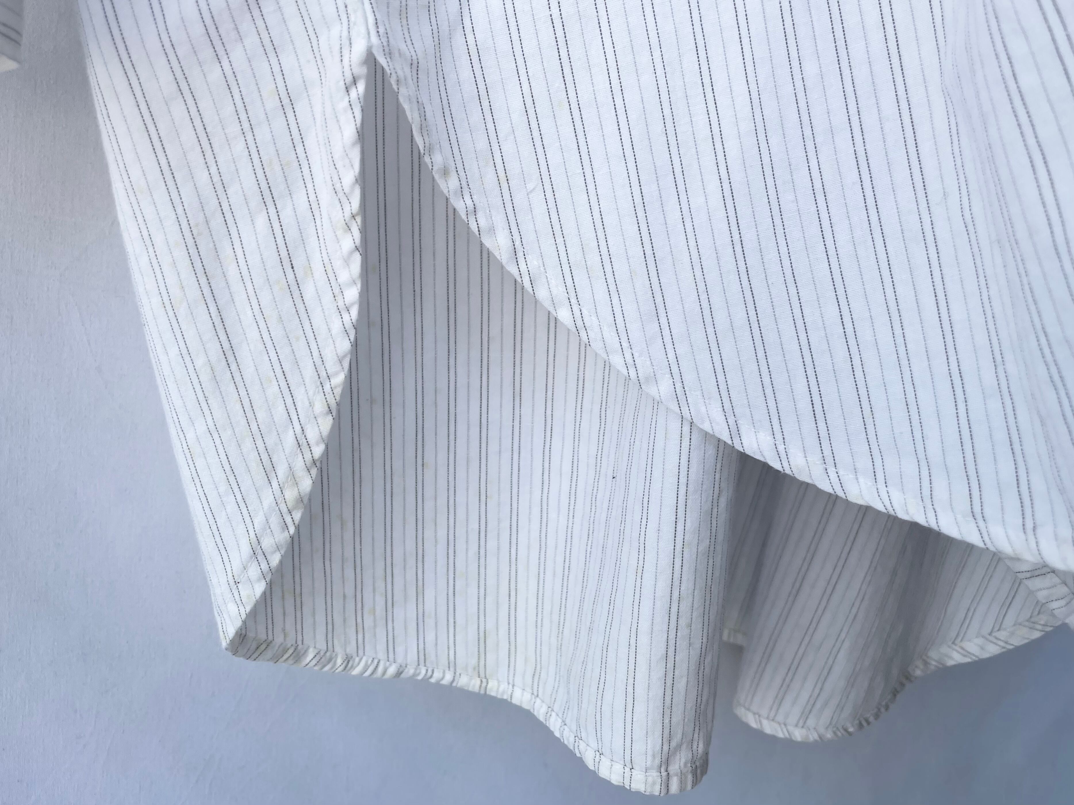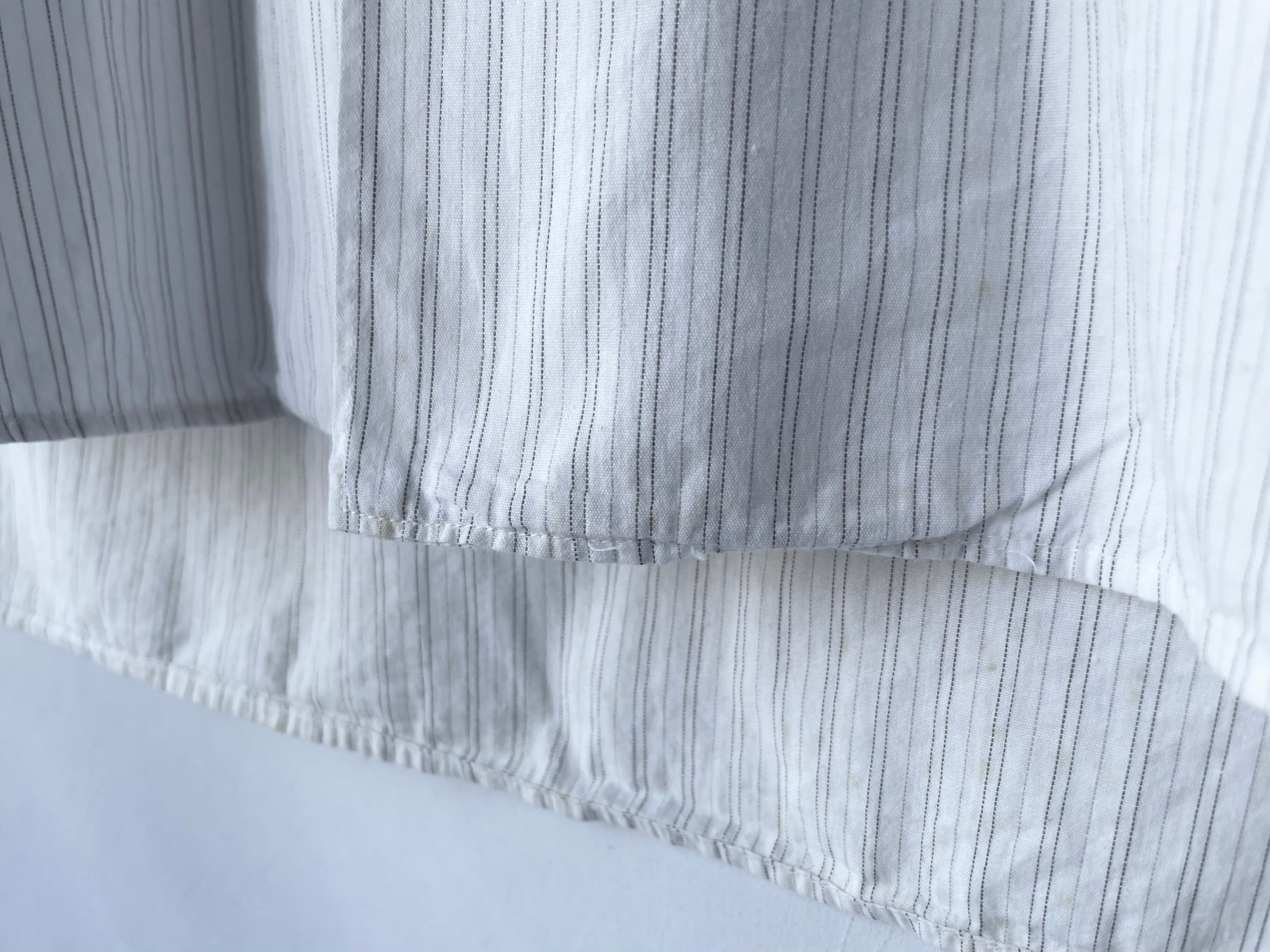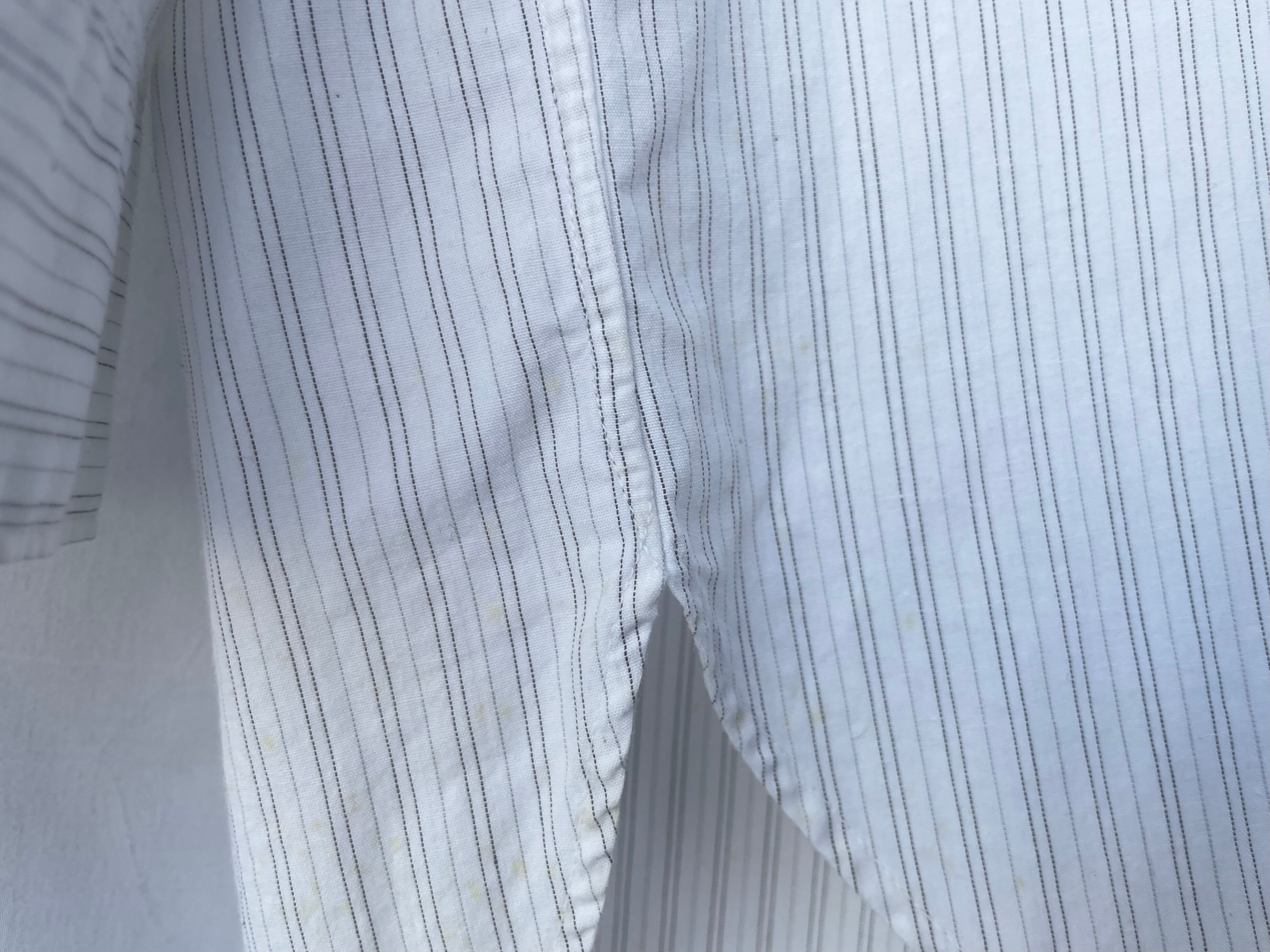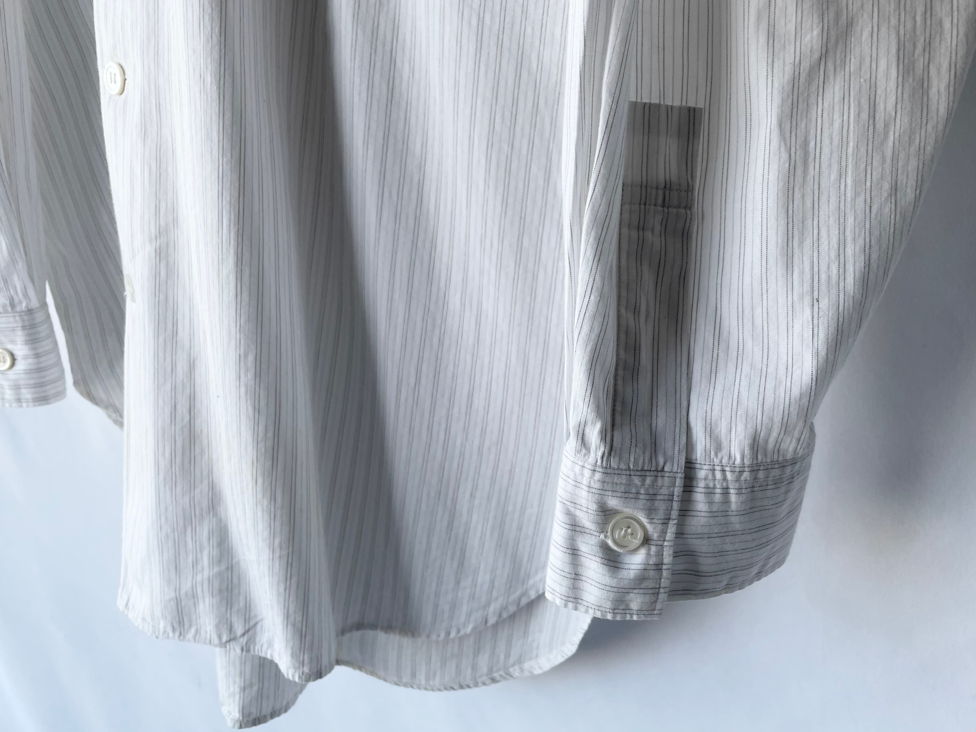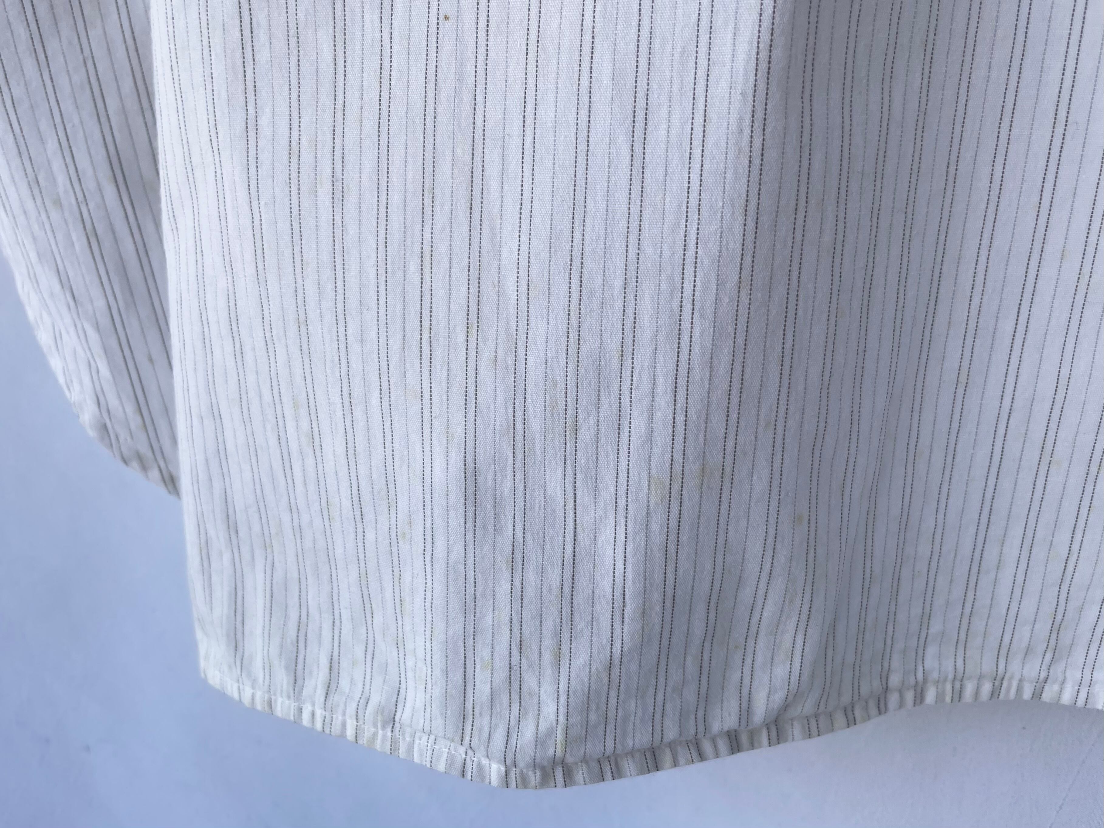 白地にグレー/チャコールの糸が混じる、細かなストライプパターン。