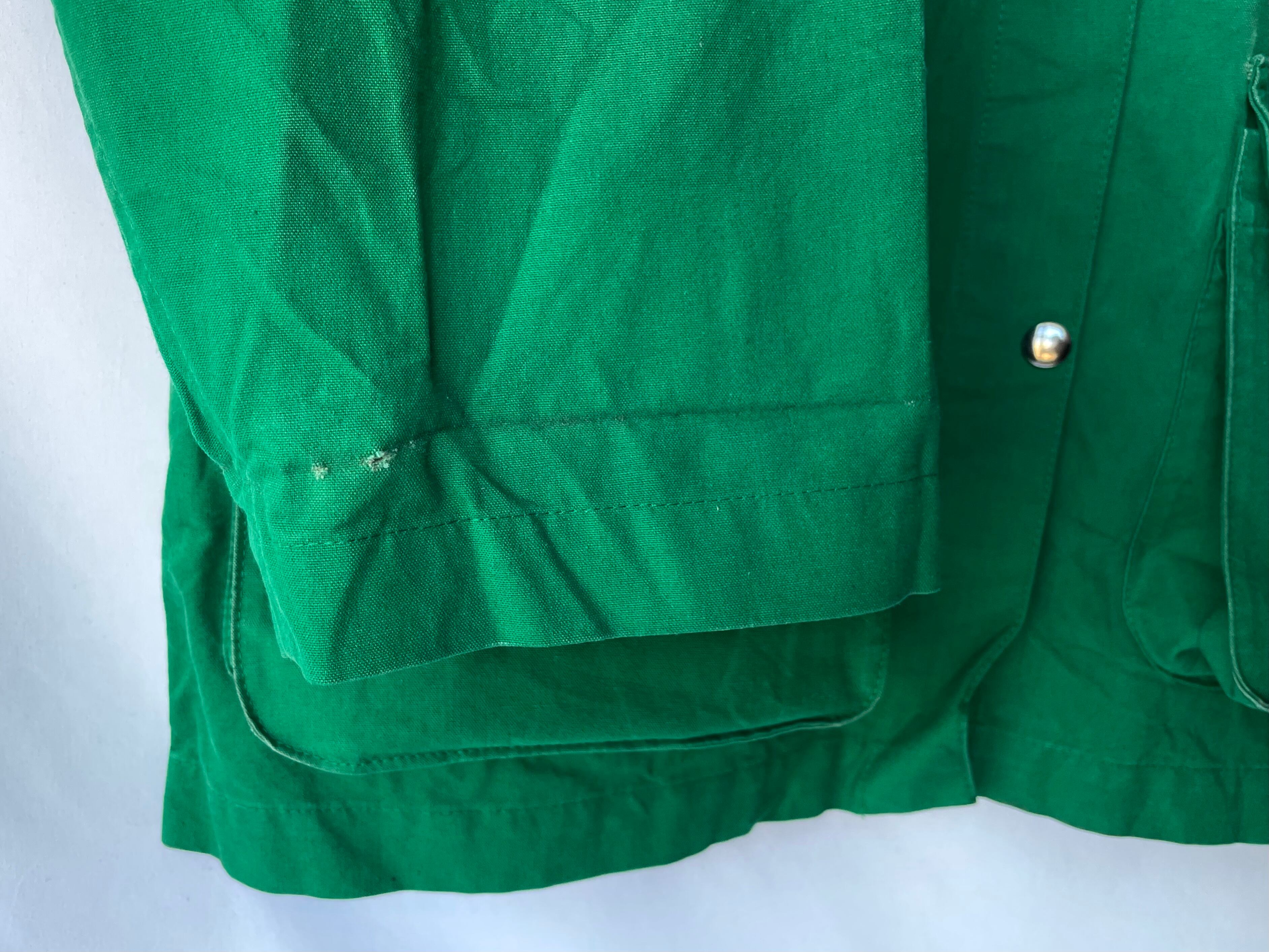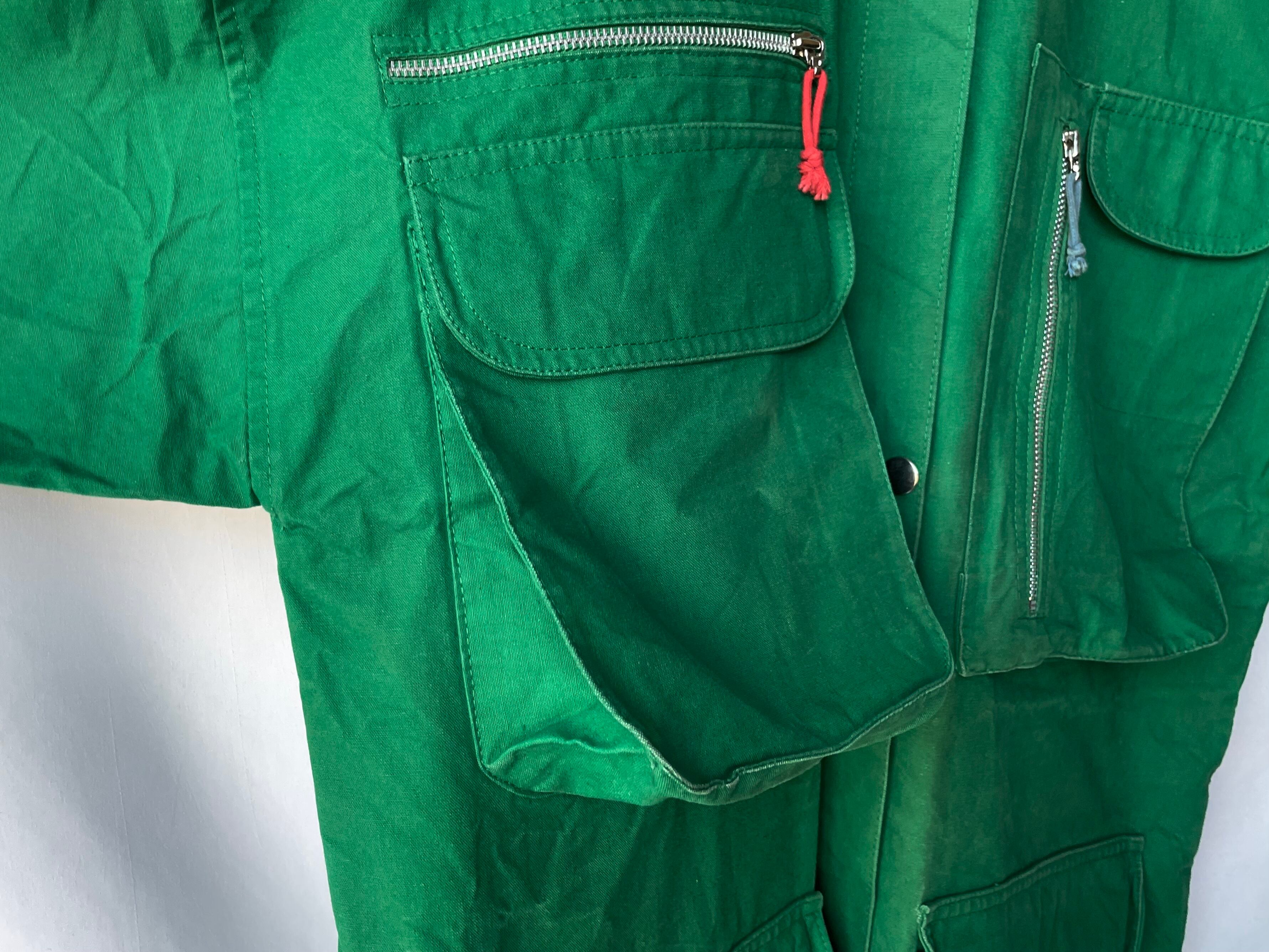 Zipper pockets run vertically and horizontally on both chests, and red/blue-gray straps stand out against the bright green.