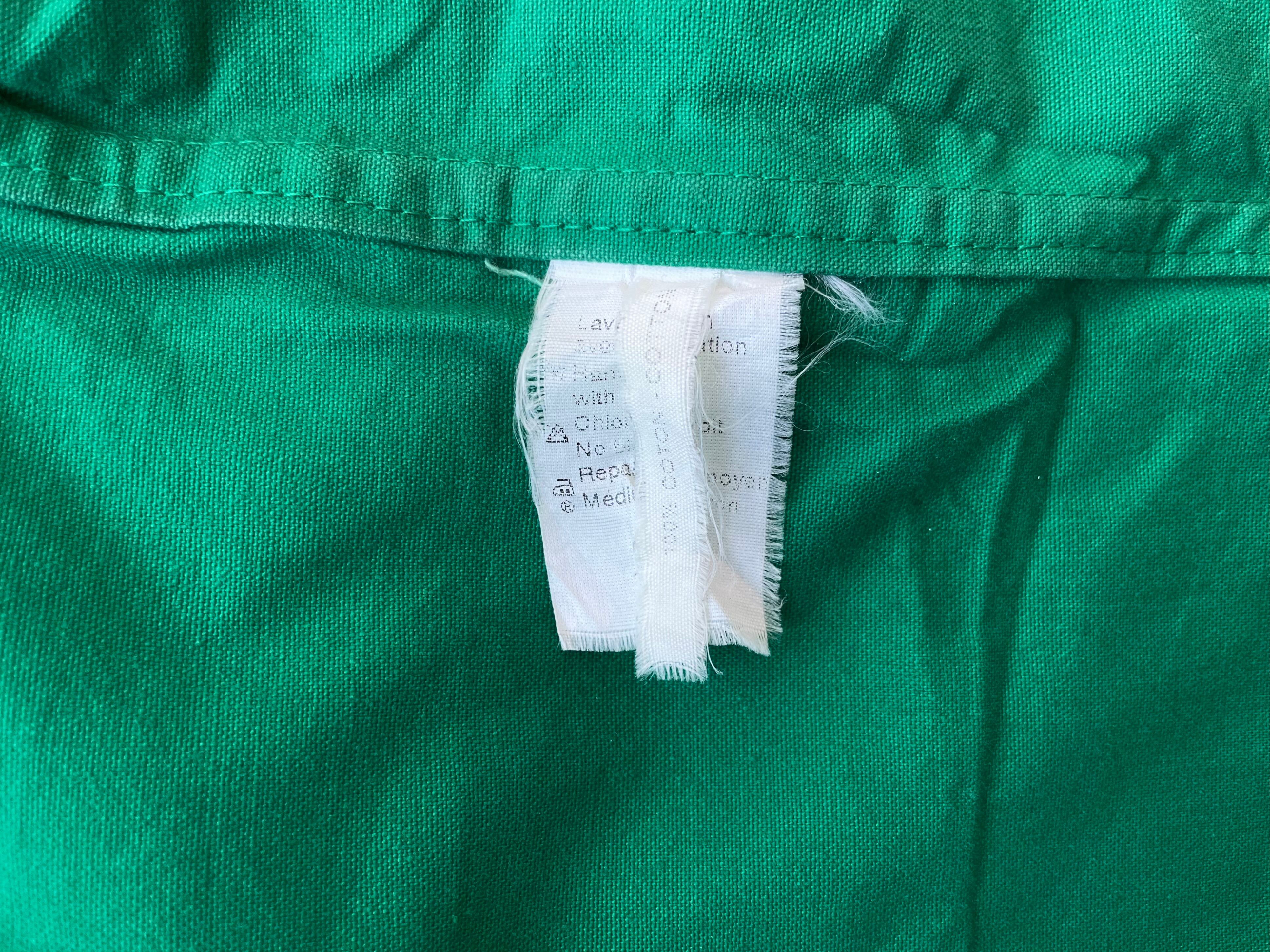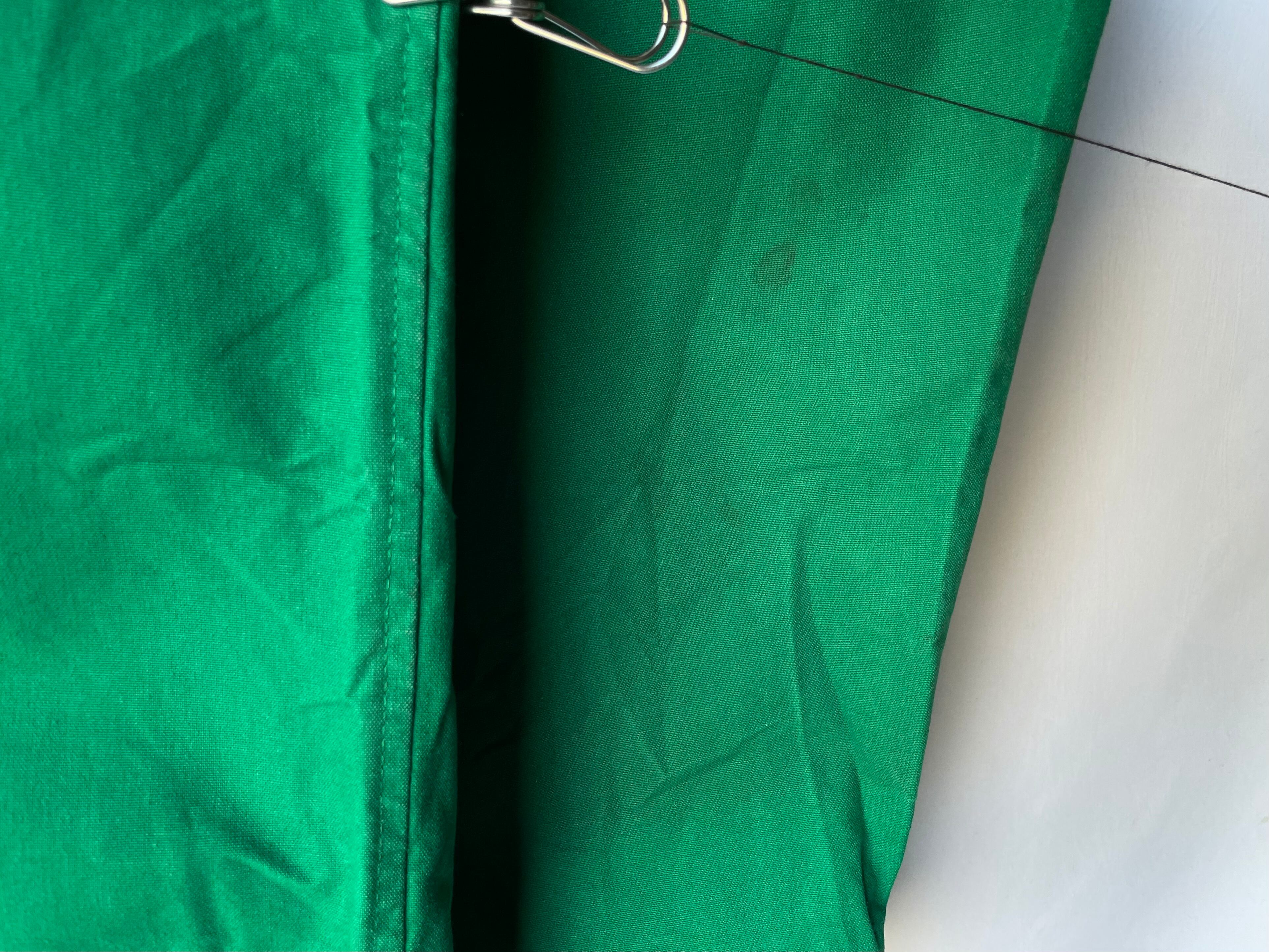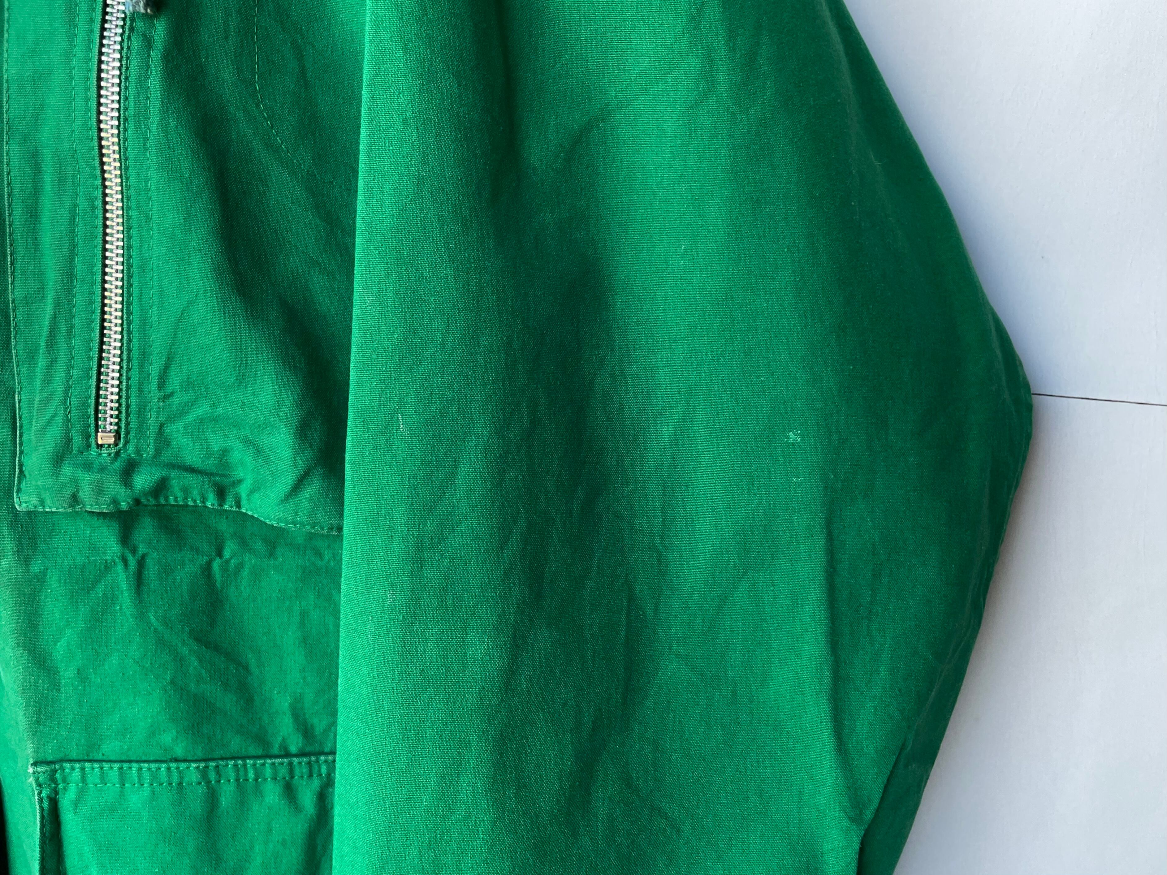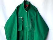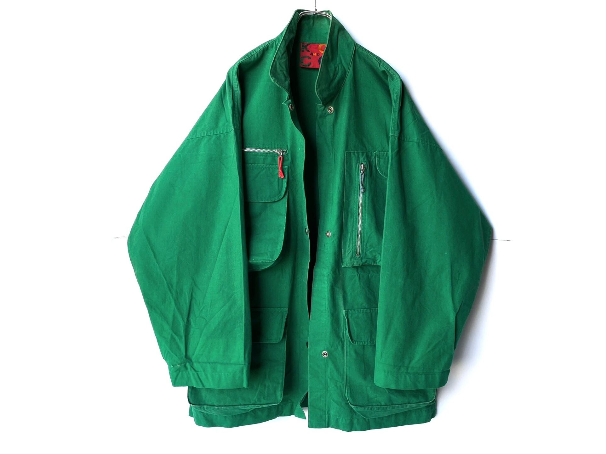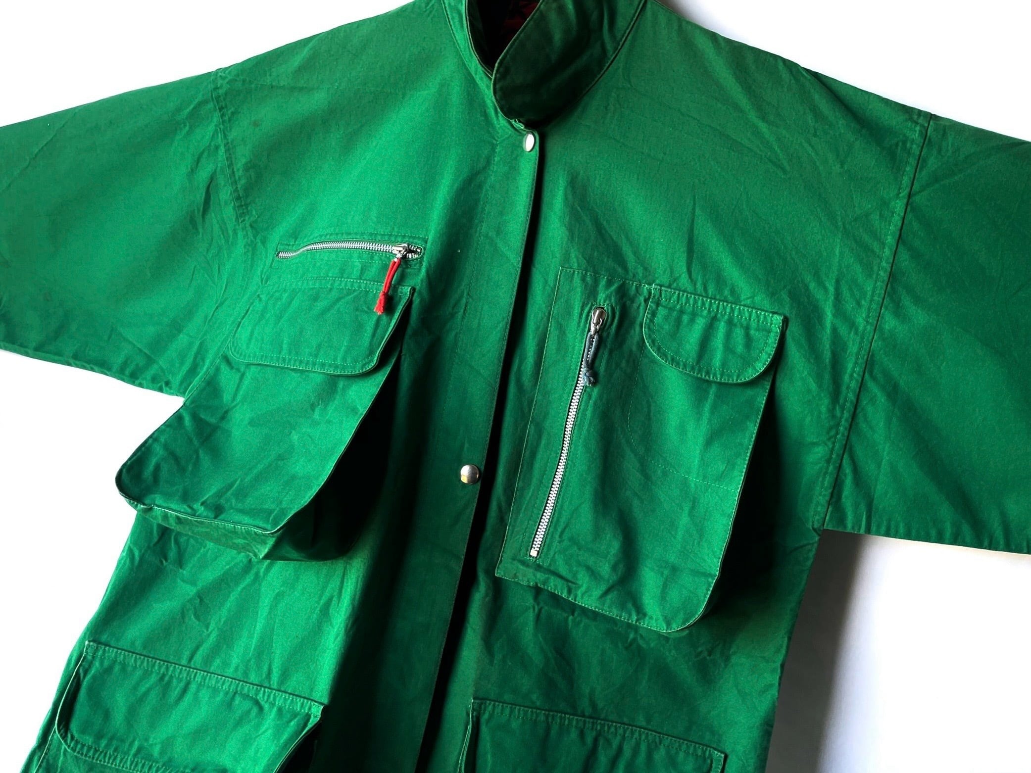 両胸で縦横に走るジッパーポケット、鮮やかな緑に映える赤/ブルーグレーのストラップ。